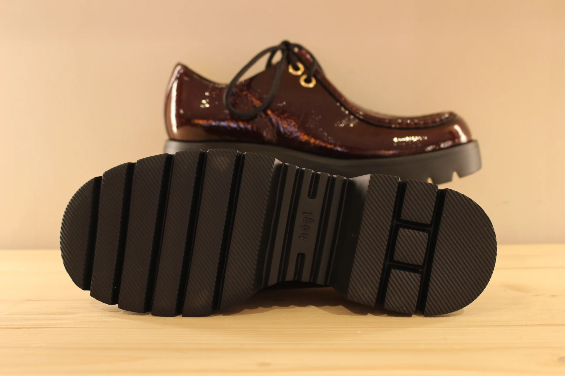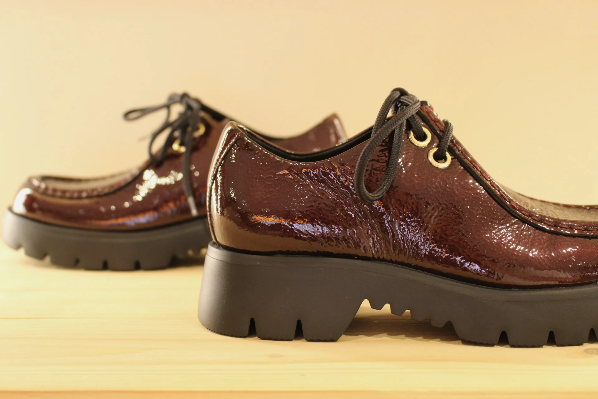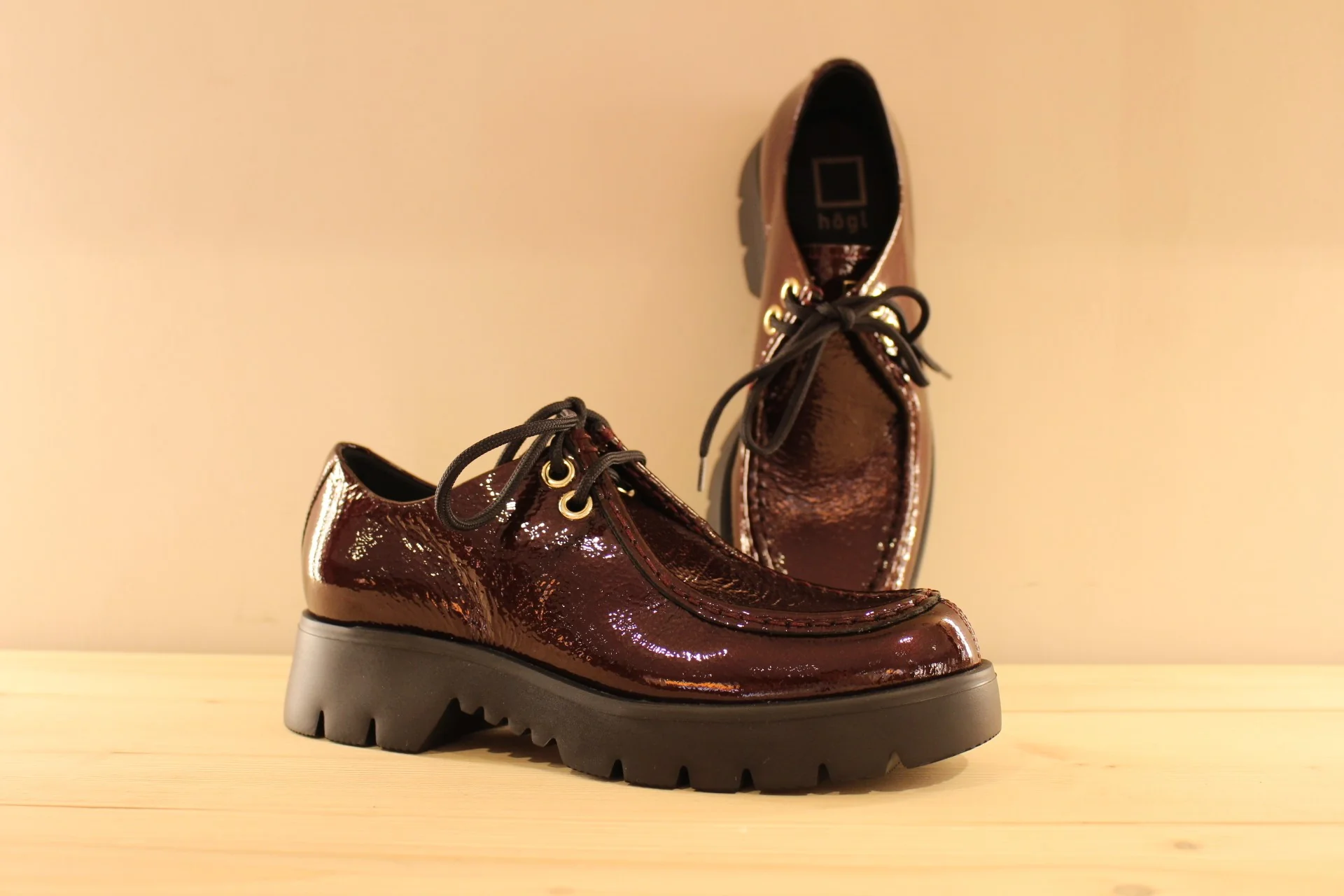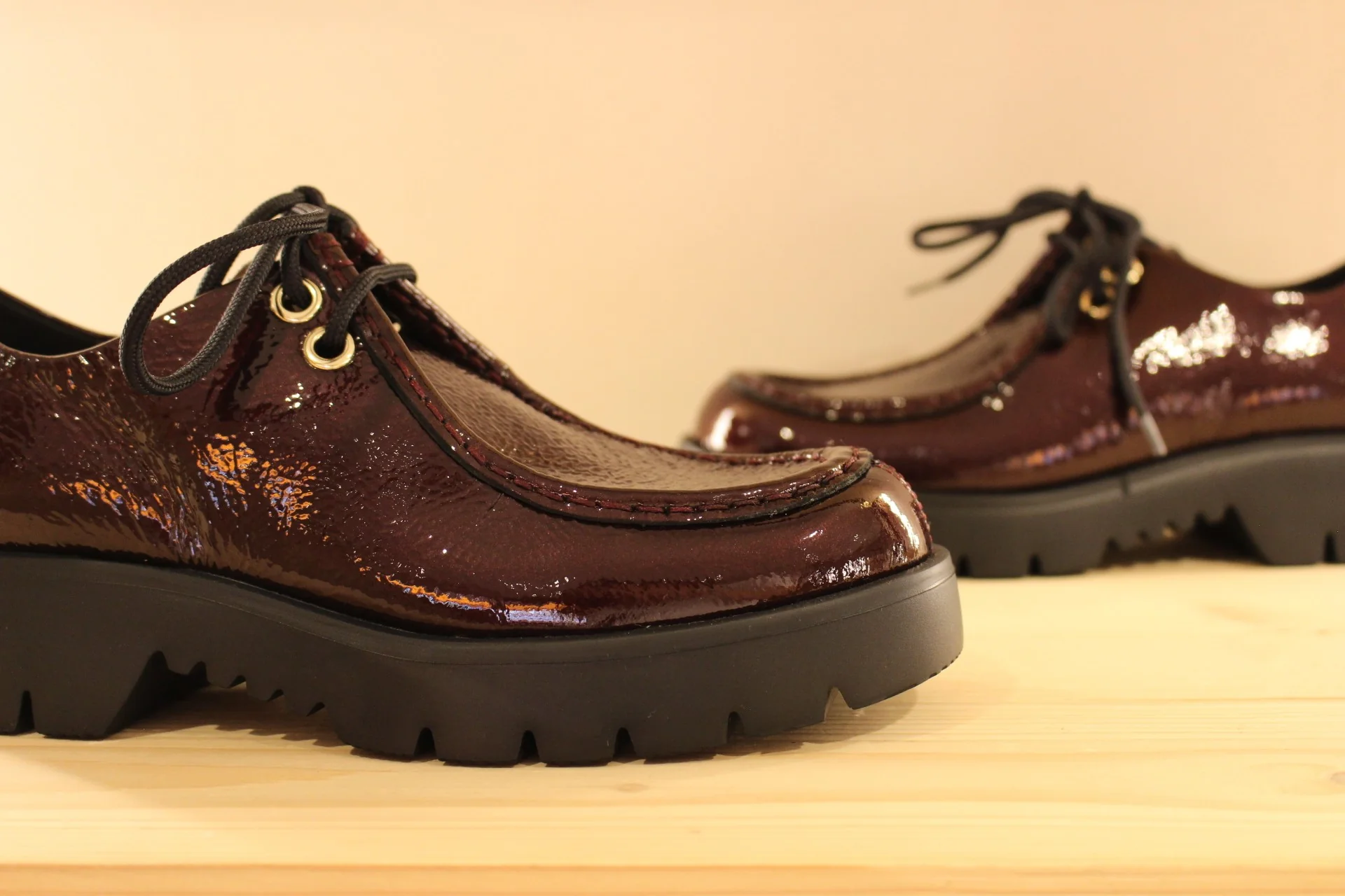 Chaussures HÖGL 102416. Fabrication autrichienne. Derby en cuir vernis fripé de couleur bordeaux. Serrage lacets en coton noir. Chaussures doublées cuir. Semelle très amortissante. Semelle externe en gomme crantée de 4 cm. Talon de 1.5 cm. Une chaussure légèrement effilée, très féminine et extra légère.. Sélectionnez une pointure de moins. Chaussant généreux.