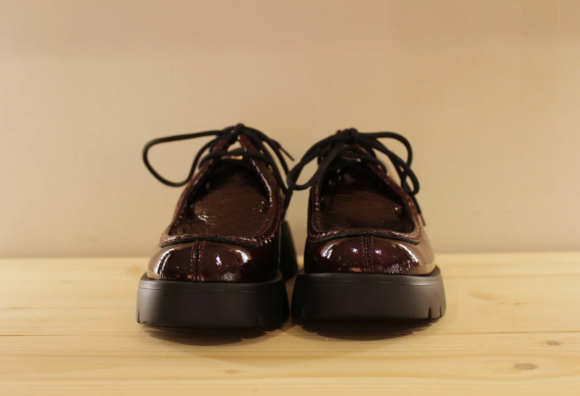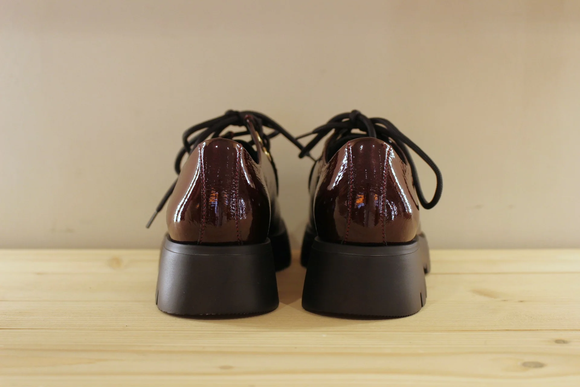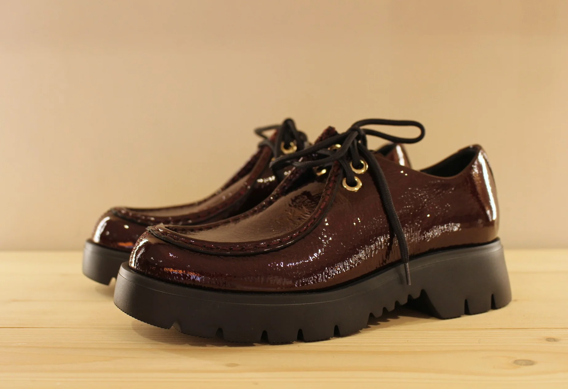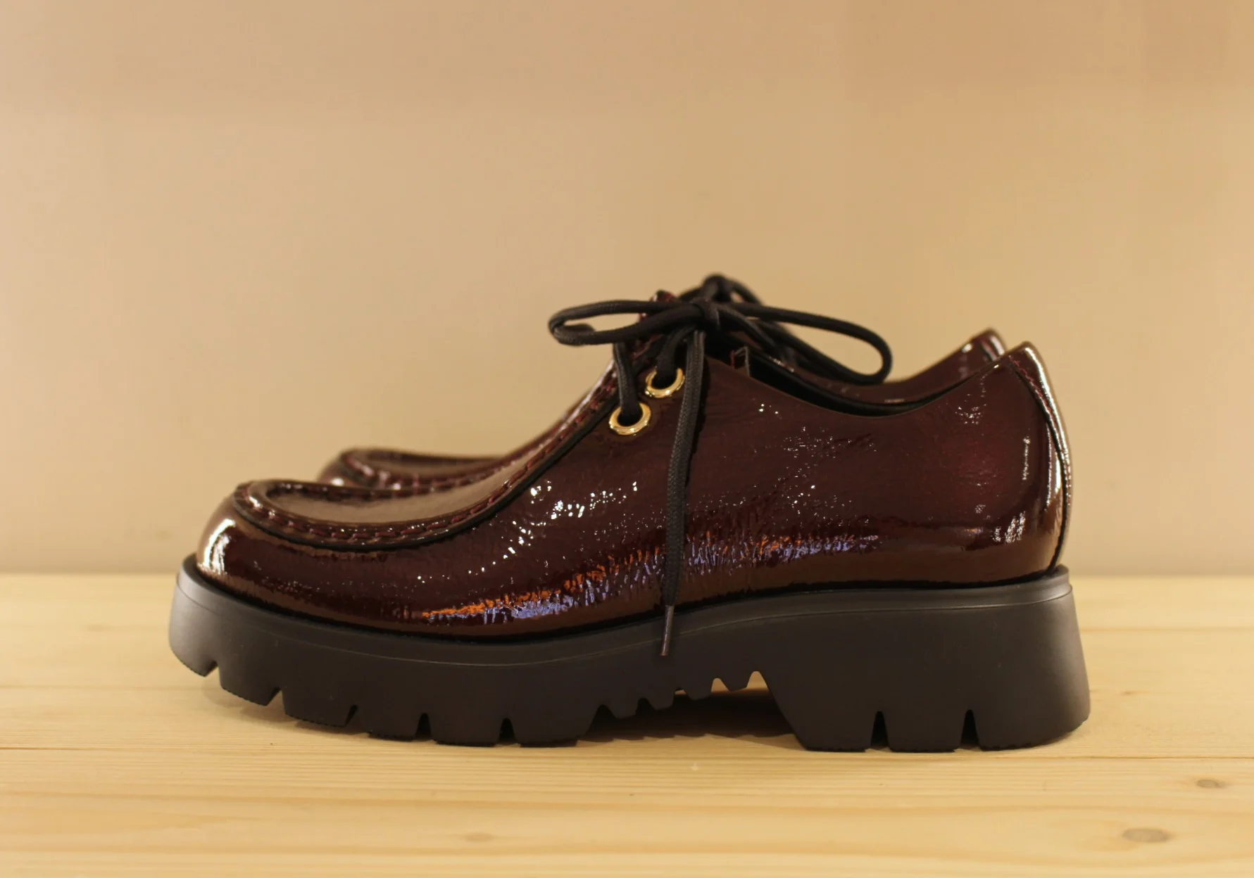 Chaussures HÖGL 102416. Fabrication autrichienne. Derby en cuir vernis fripé de couleur bordeaux. Serrage lacets en coton noir. Chaussures doublées cuir. Semelle très amortissante. Semelle externe en gomme crantée de 4 cm. Talon de 1.5 cm. Une chaussure légèrement effilée, très féminine et extra légère.. Sélectionnez une pointure de moins. Chaussant généreux.
