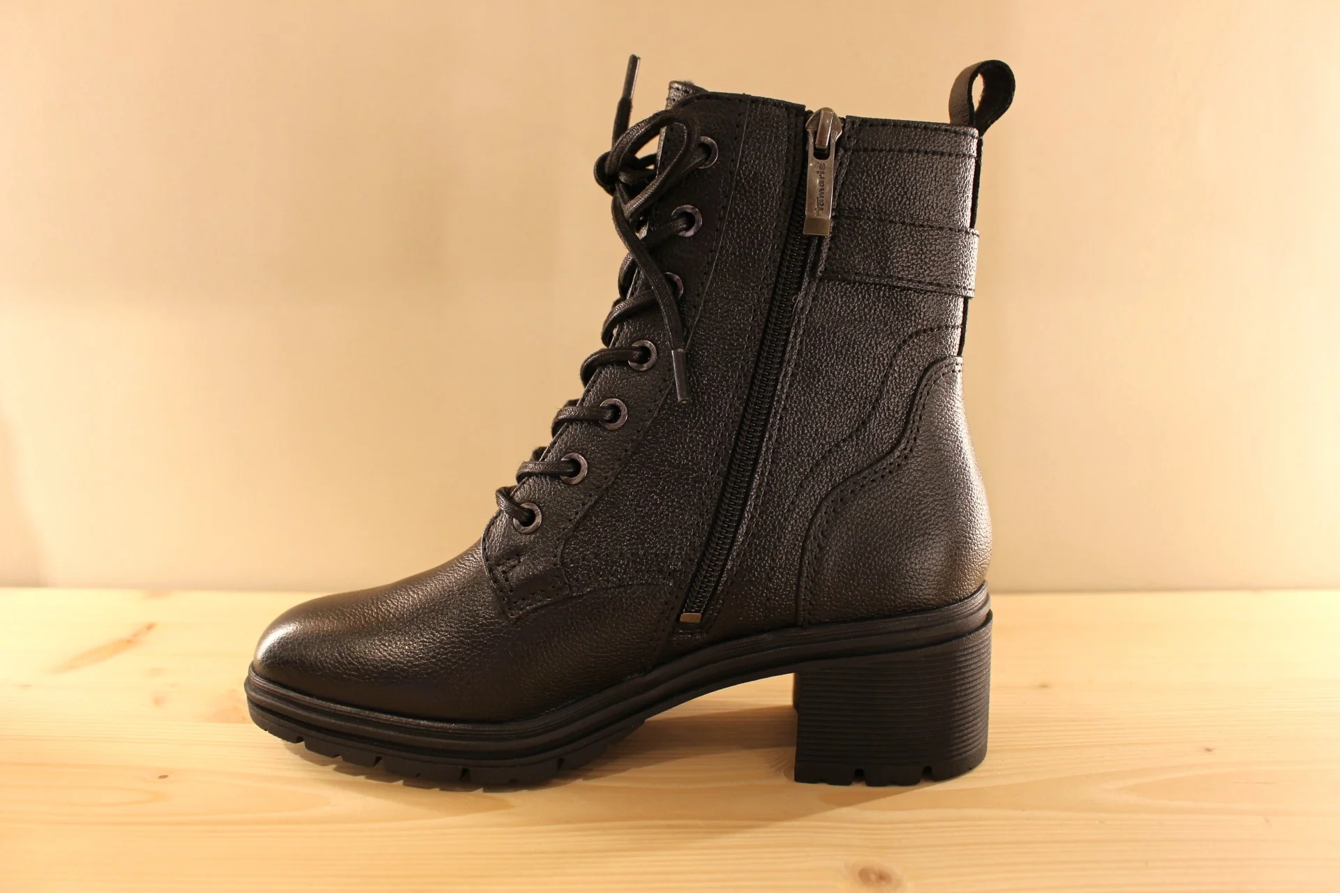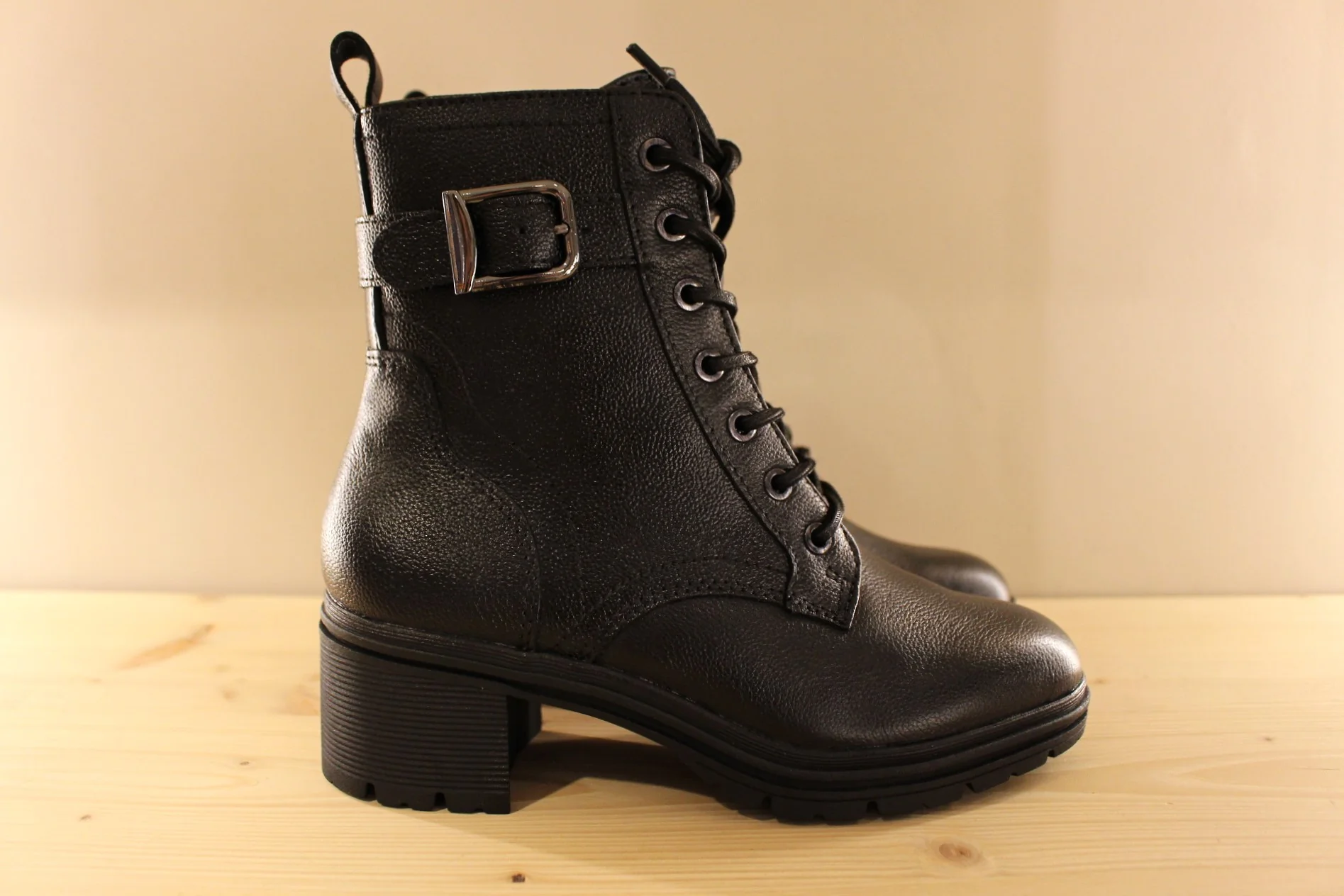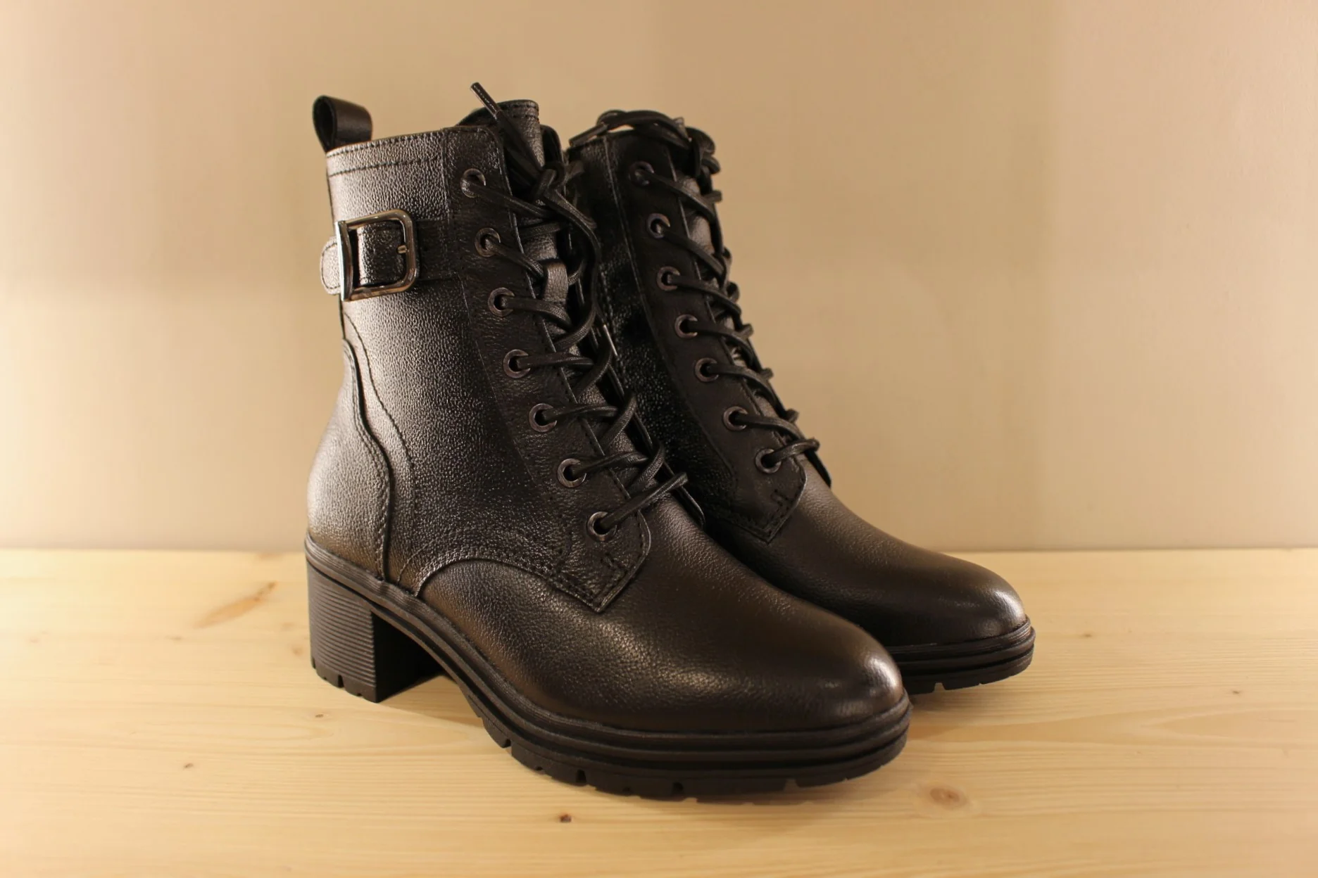 Bottines TAMARIS 25907. Bottines en cuir de couleur noir. Zip du côté interne. Serrage lacet en coton ton sur ton. Boucle décorative. Chaussures doublées chaud et semelle système « touch-it ». Hauteur de la tige de 16 cm. Semelle externe en gomme crantée de 2 cm. Talon de 4 cm. Féminine avec son serrage lacets et son petit talon.