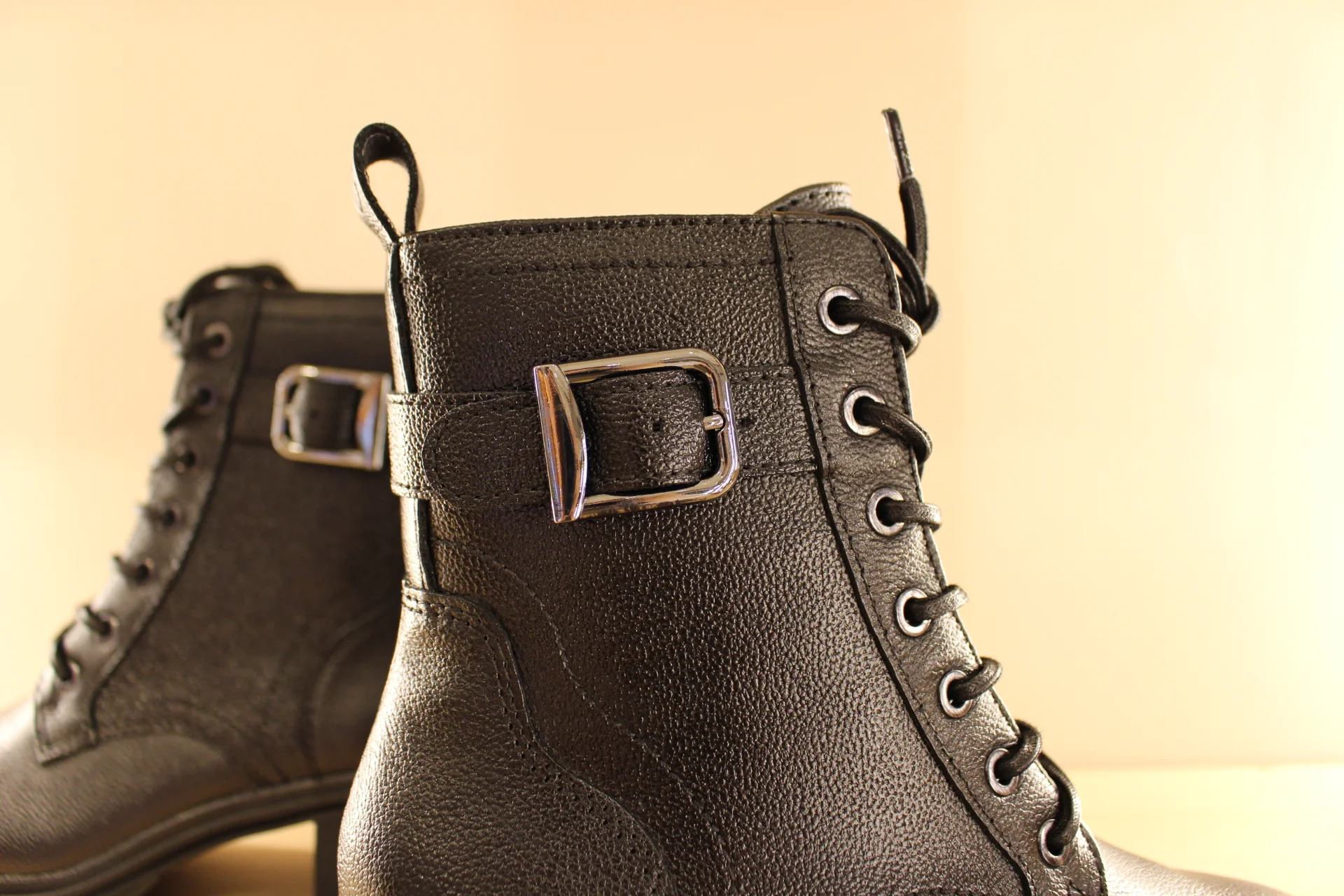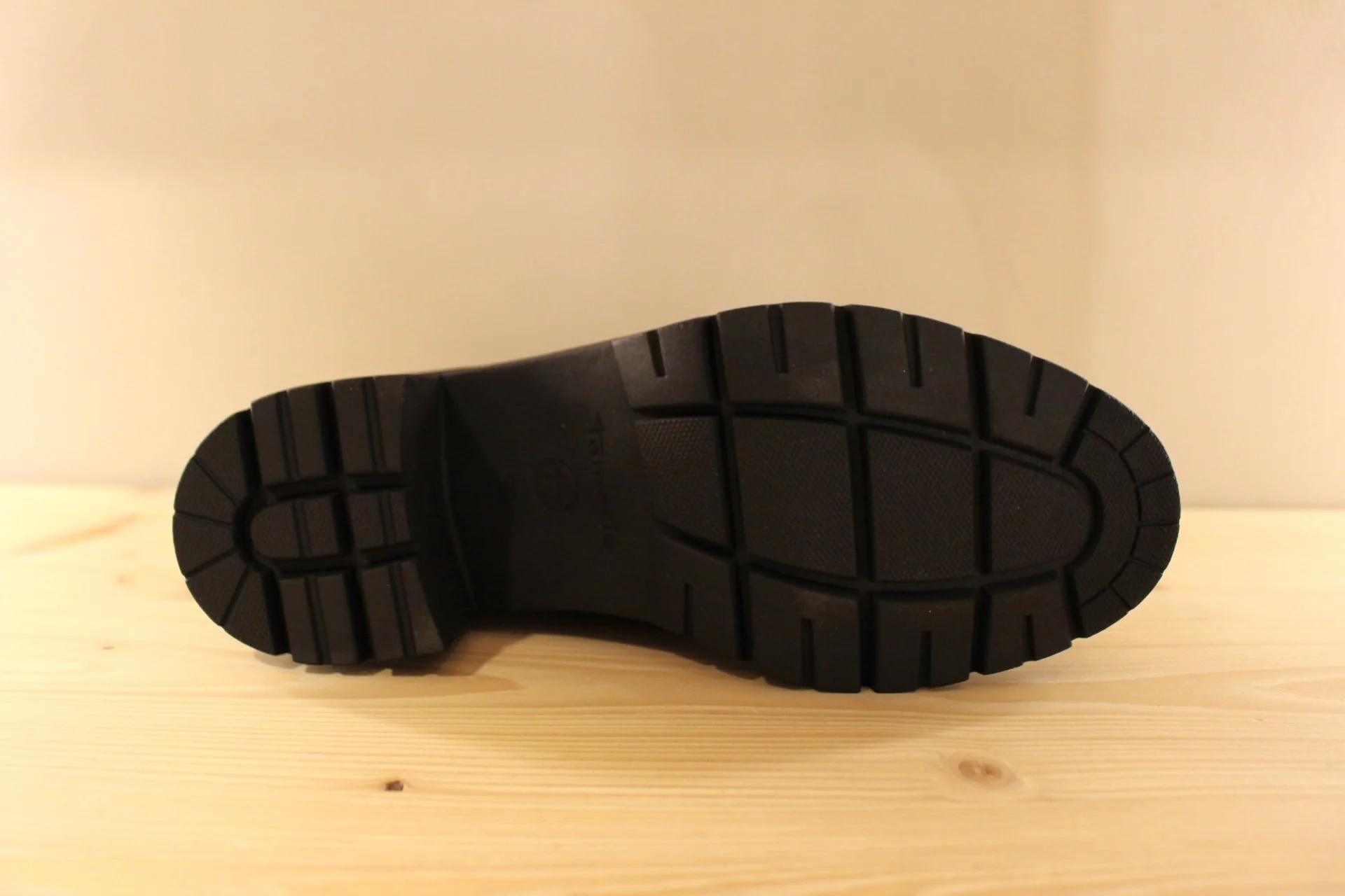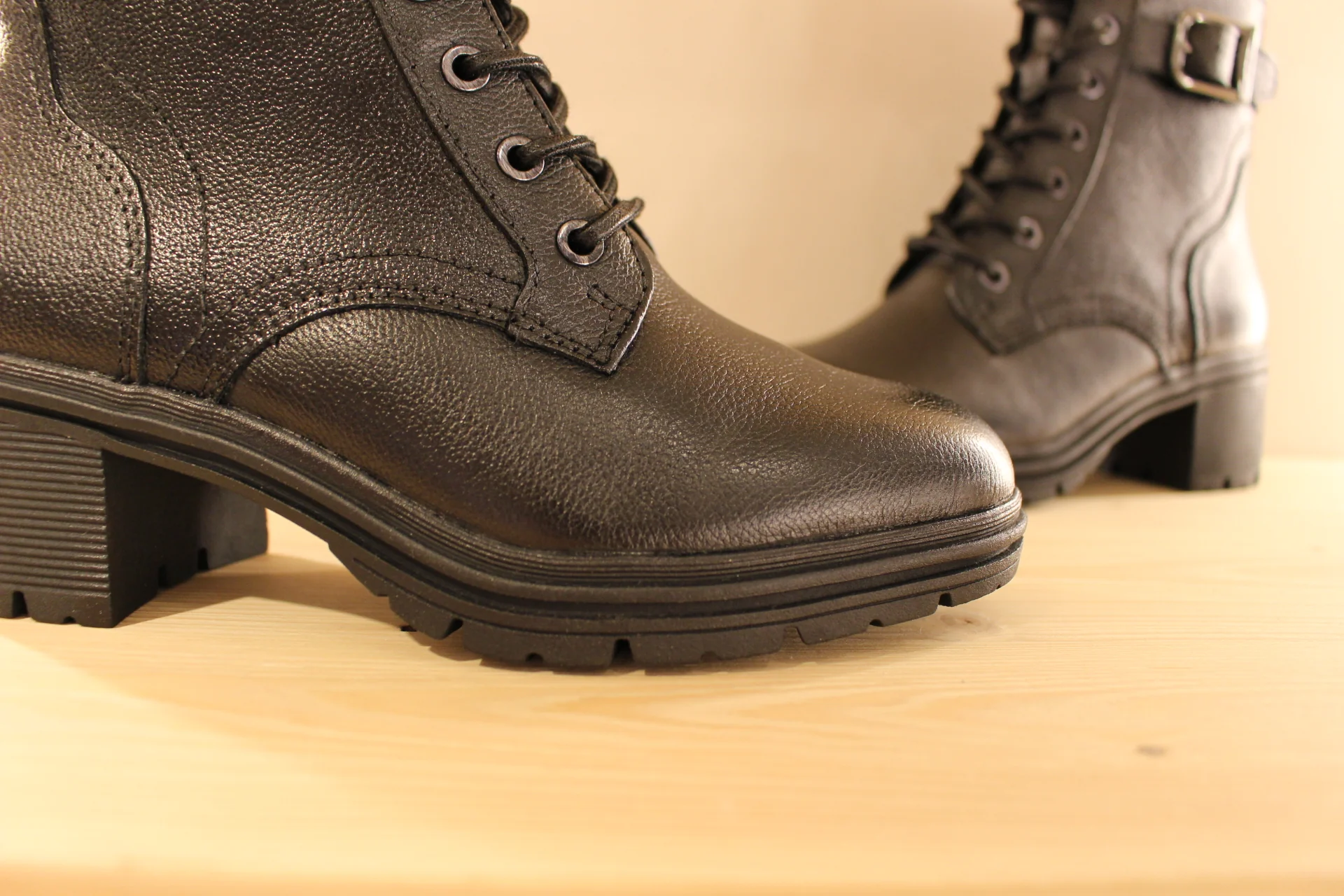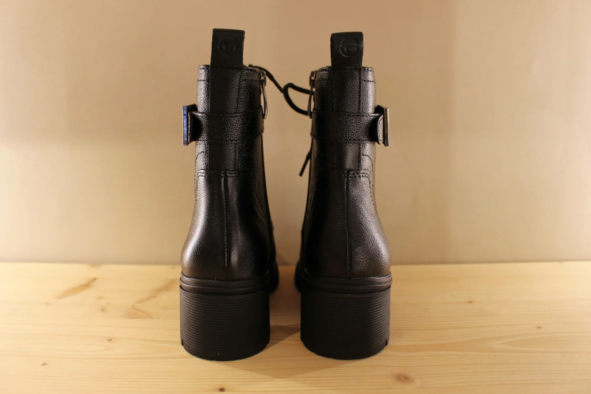 Bottines TAMARIS 25907. Bottines en cuir de couleur noir. Zip du côté interne. Serrage lacet en coton ton sur ton. Boucle décorative. Chaussures doublées chaud et semelle système « touch-it ». Hauteur de la tige de 16 cm. Semelle externe en gomme crantée de 2 cm. Talon de 4 cm. Féminine avec son serrage lacets et son petit talon.