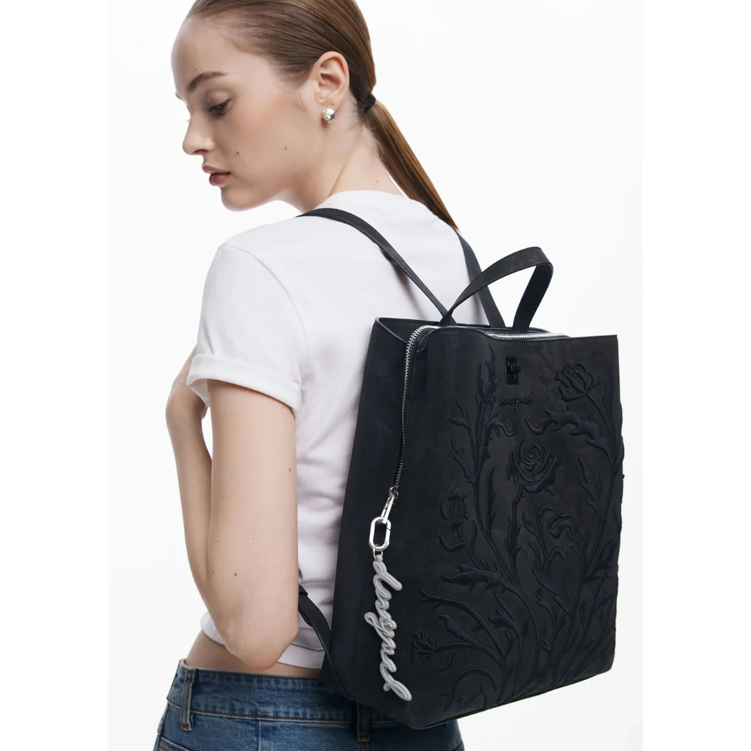 Petit sac à dos en similicuir orné de fleurs en relief 3D, avec poche extérieure arrière et plusieurs compartiments intérieurs.