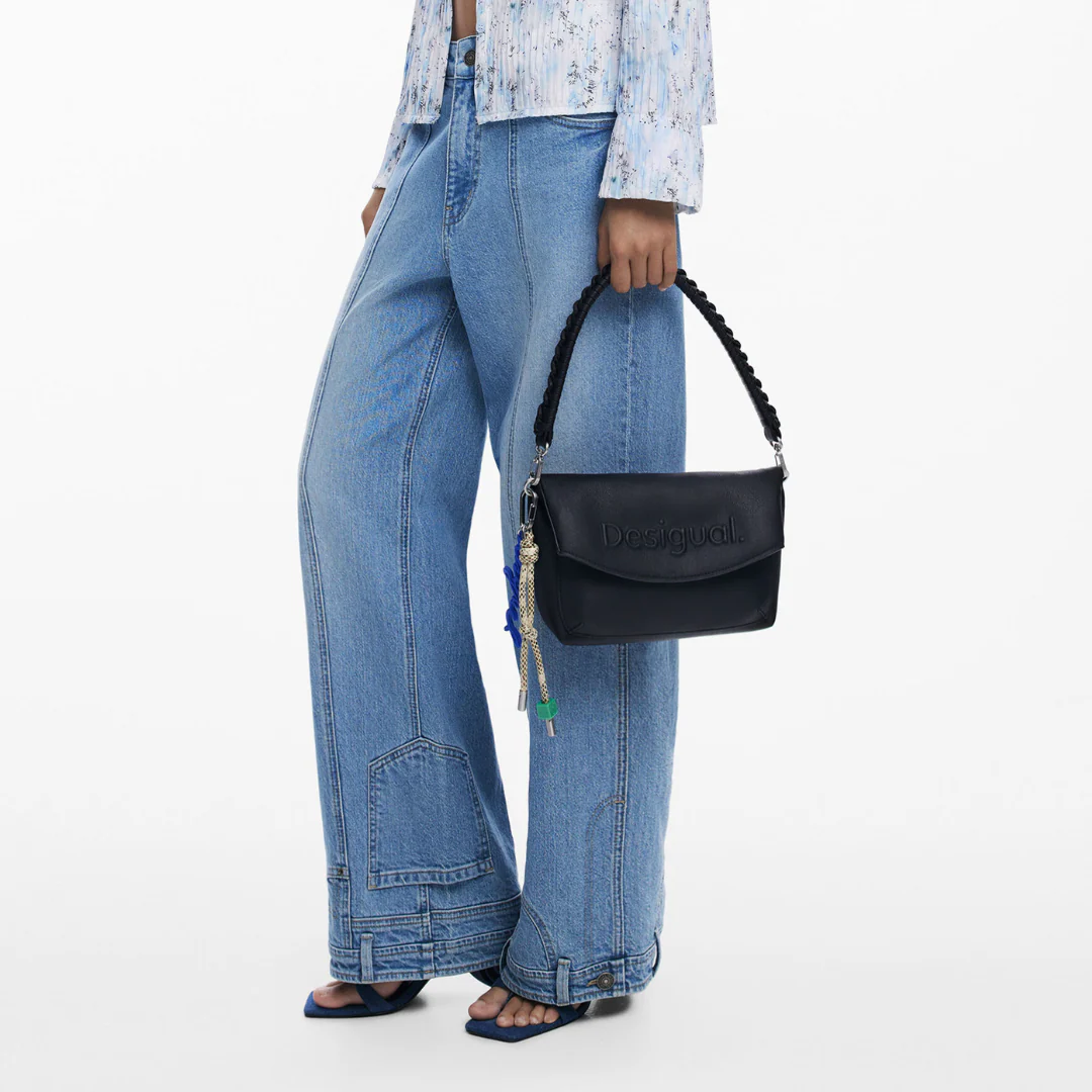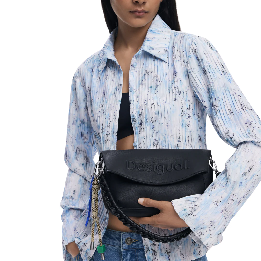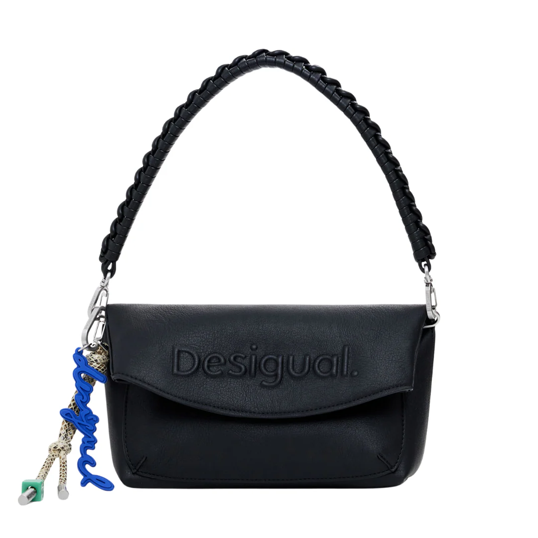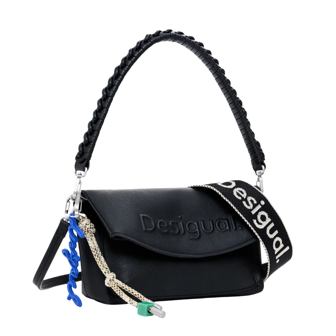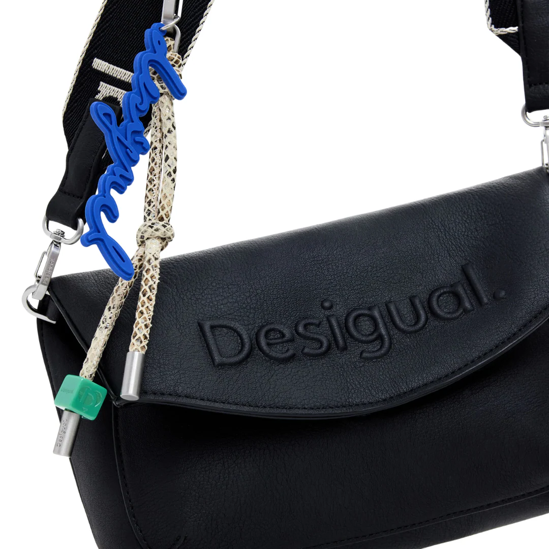 Sac bandoulière en tissu effet cuir, avec logo effet 3D, fermeture éclair, rabat extensible, poignées interchangeables et porte-clés amovible de couleur unie.