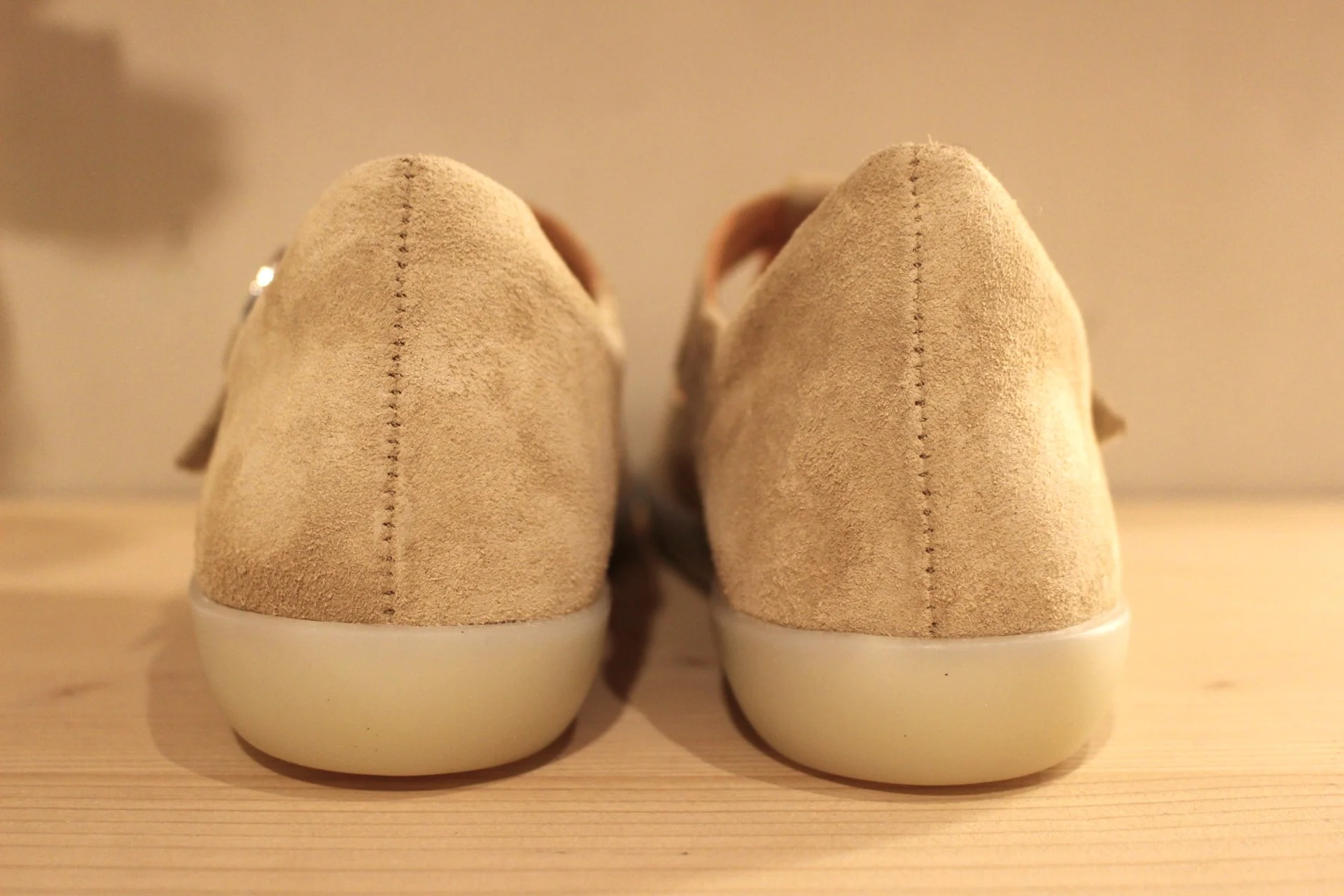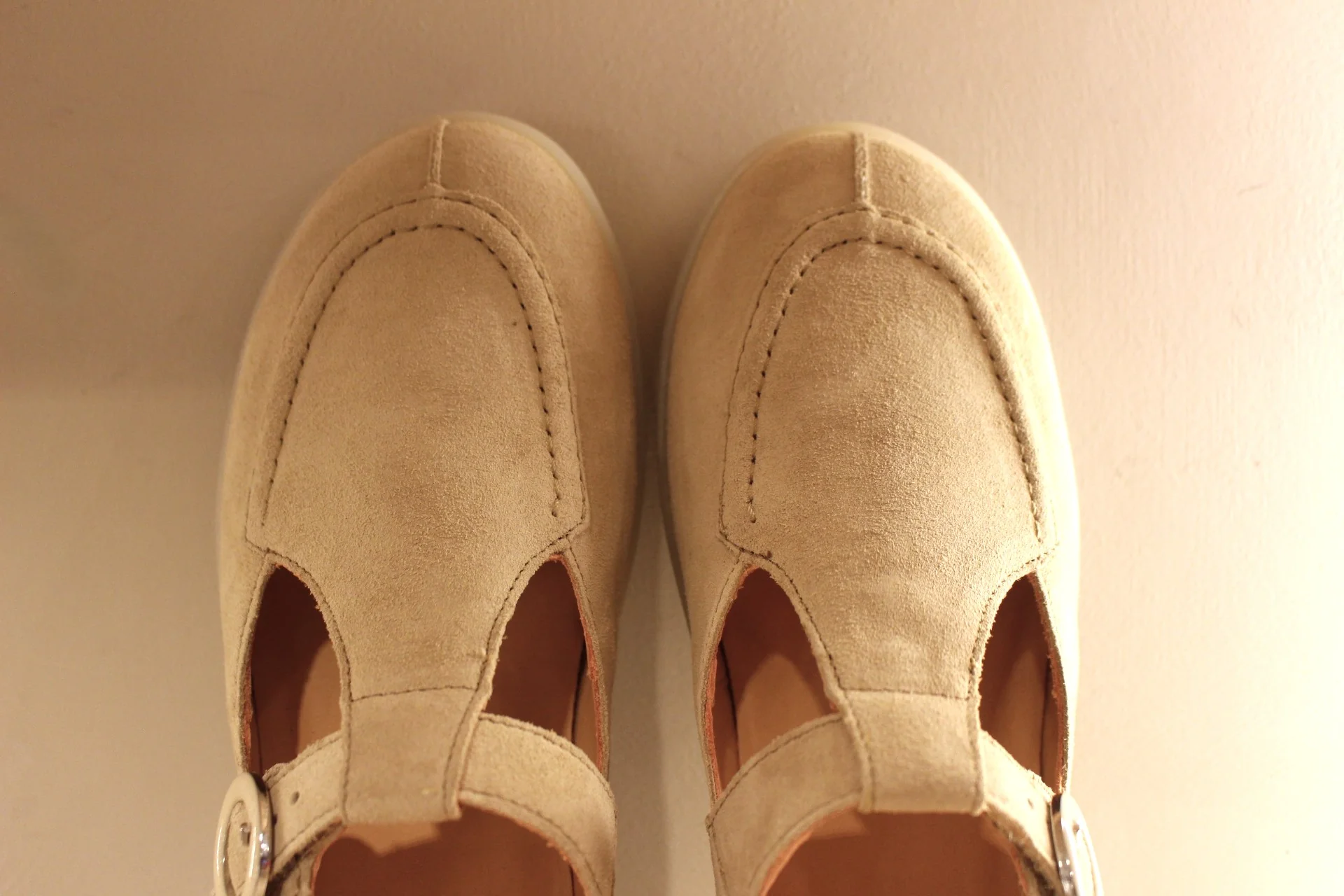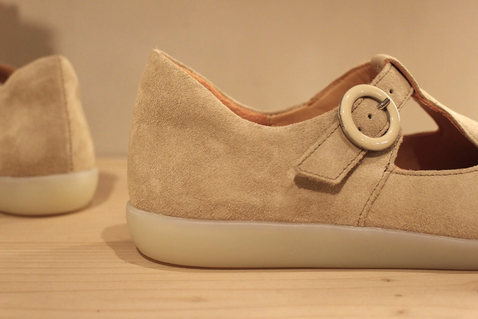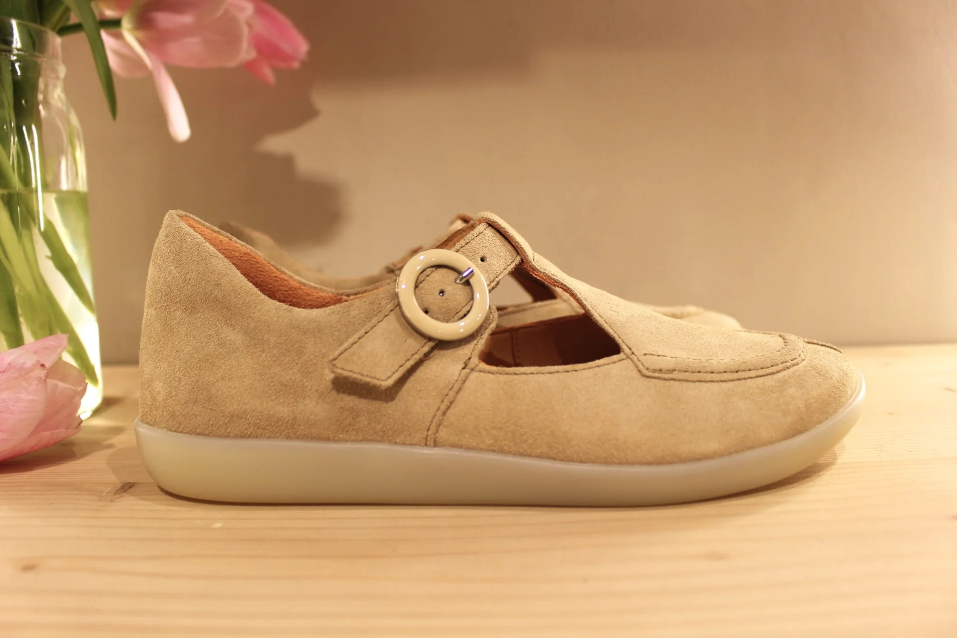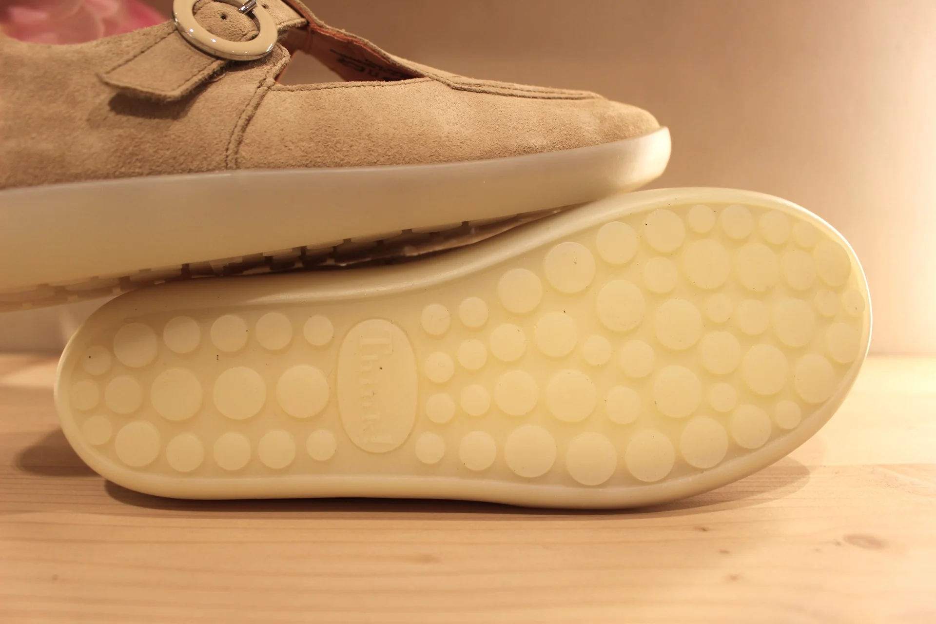Chaussures THINK – 1116. Fabrication autrichienne. Babies en cuir velours de couleur beige. Serrage scratch sur habillage boucle nacrée beige et dorée. Chaussures doublées cuir. Semelle interne amovible. Semelle externe en gomme ton sur ton, de 2.5 cm. Talon de 1 cm. Un cuir extra souple. Superbe chaussant.