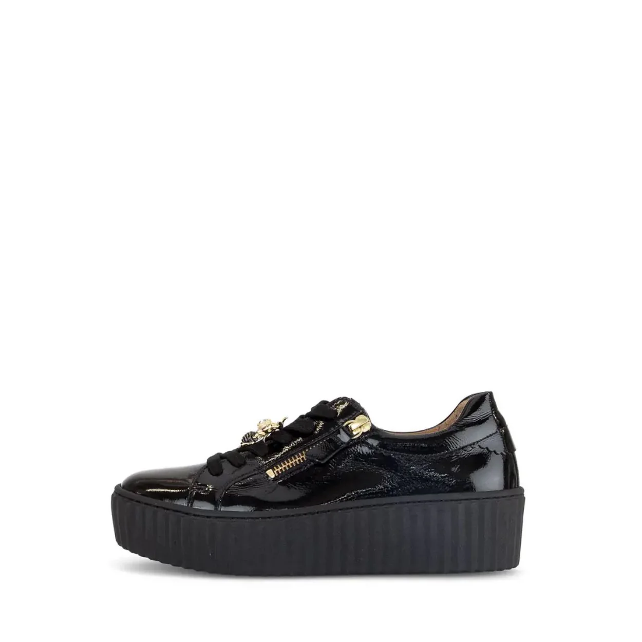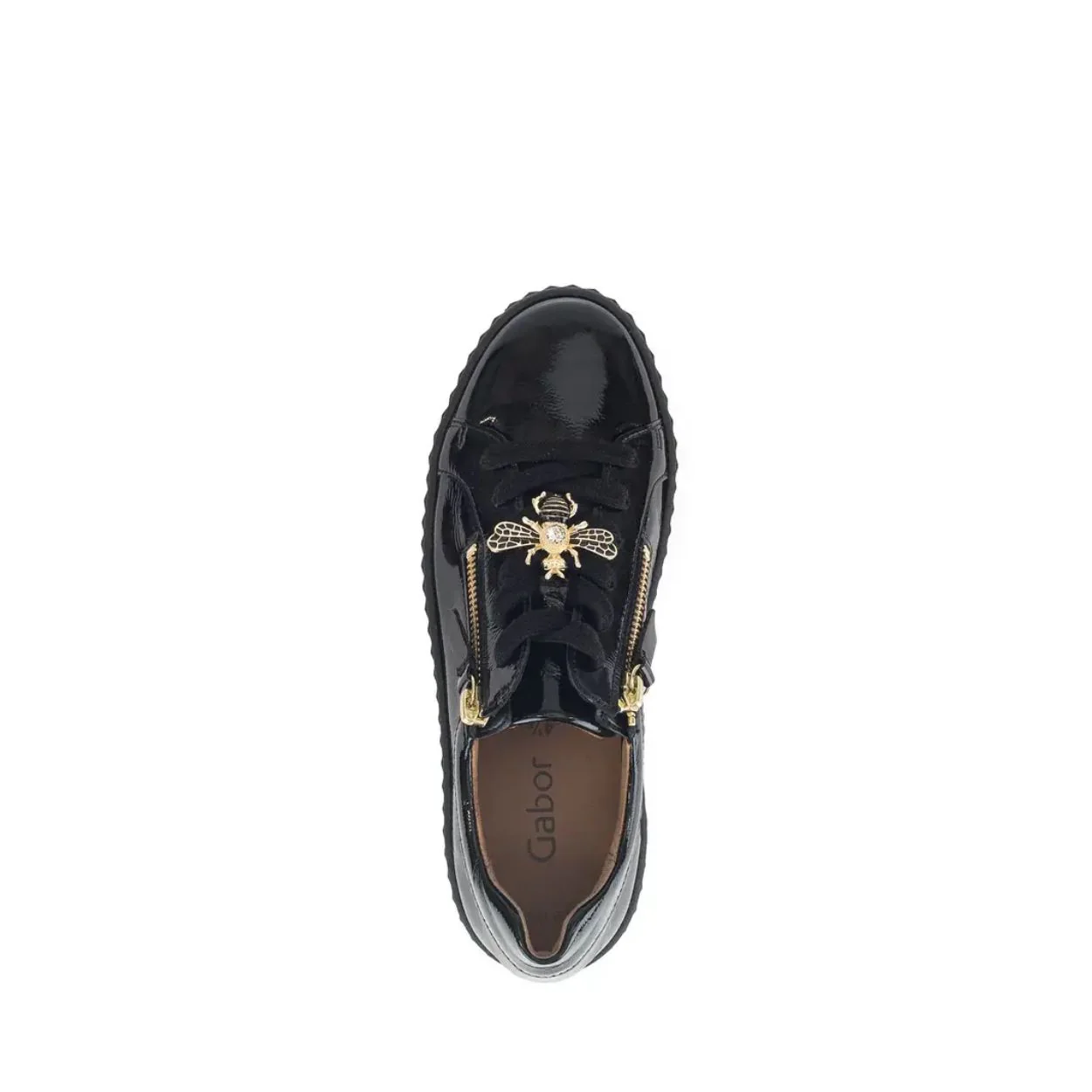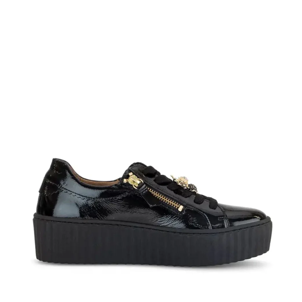 Apportez une touche audacieuse à votre look avec ce sneaker plateforme signée Gabor. Confectionnée en cuir véritable, elle se distingue par ses détails raffinés : une fermeture éclair dorée latérale, des lacets ornés de breloques abeilles métalliques, et une semelle à plateforme structurée qui allie style et confort. L’intérieur, doublé de cuir véritable et de cuir synthétique, comprend une semelle amovible pour un ajustement personnalisé. Une chaussure urbaine et tendance, parfaite pour rehausser vos tenues décontractées.