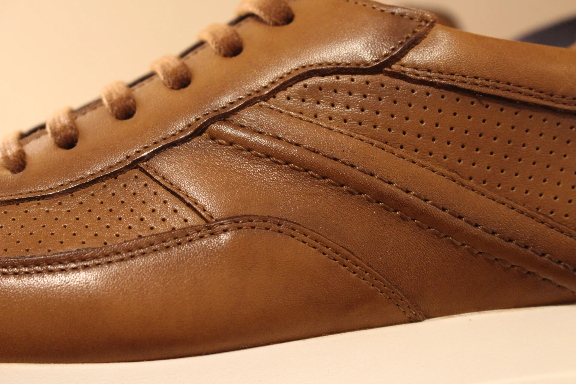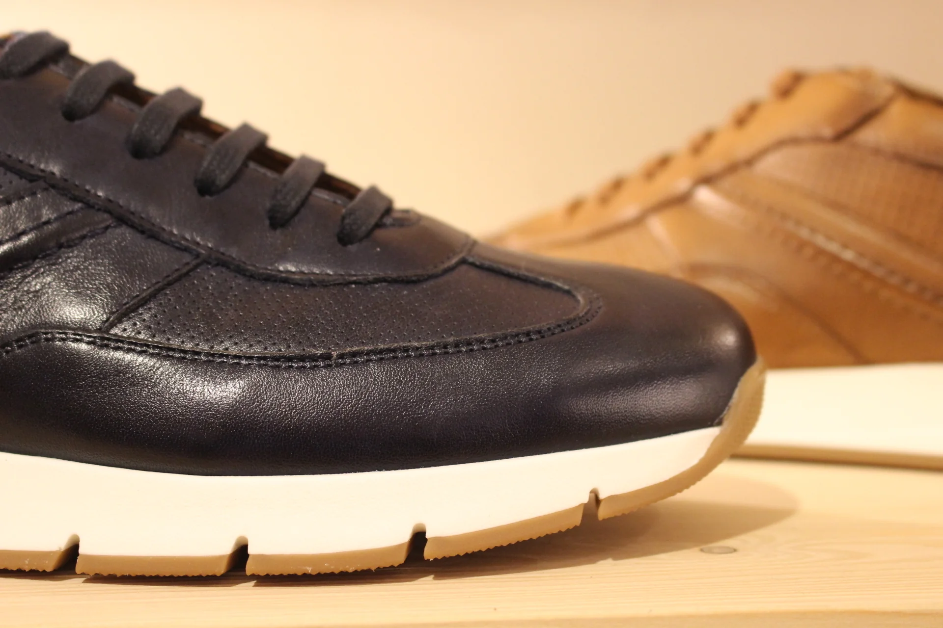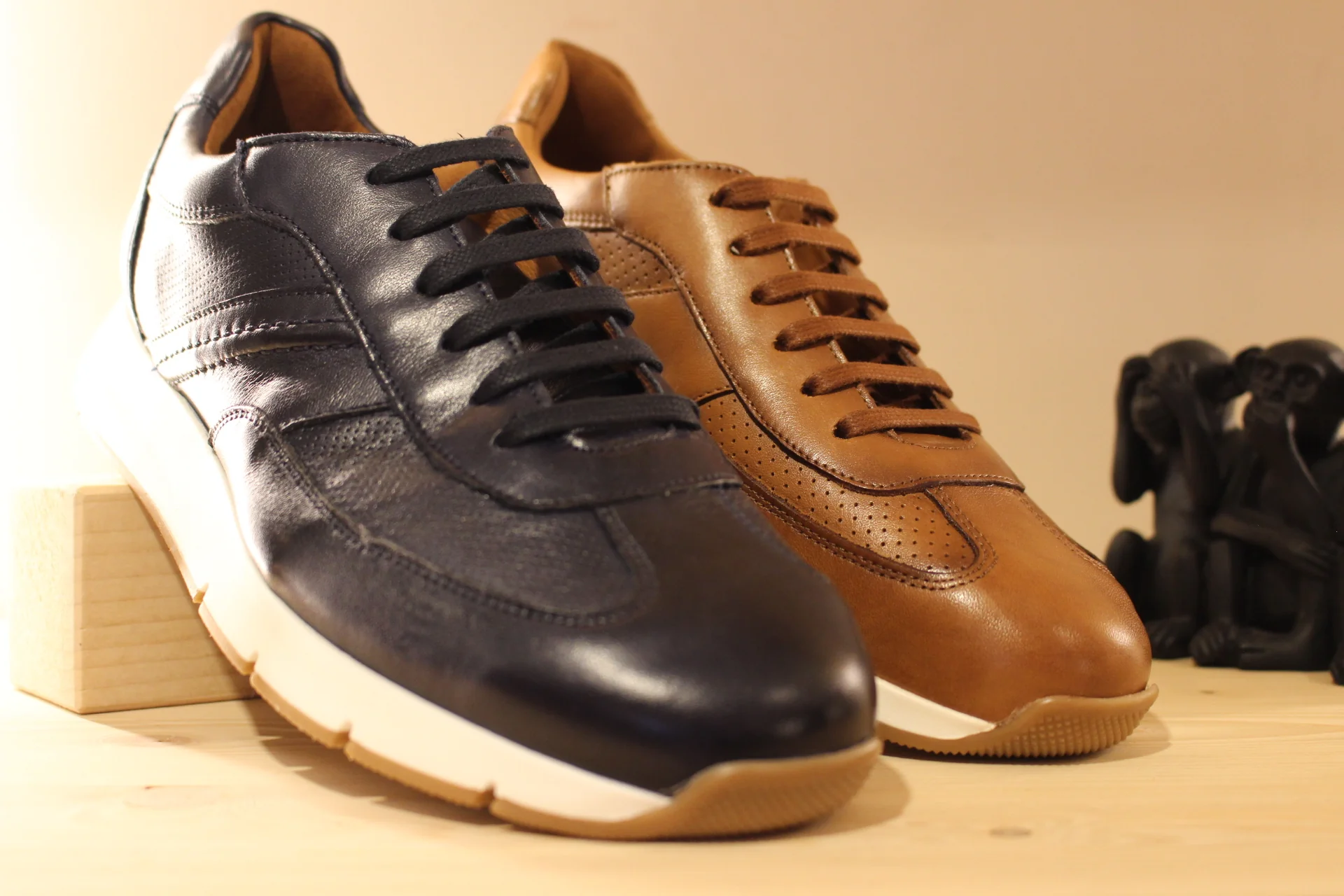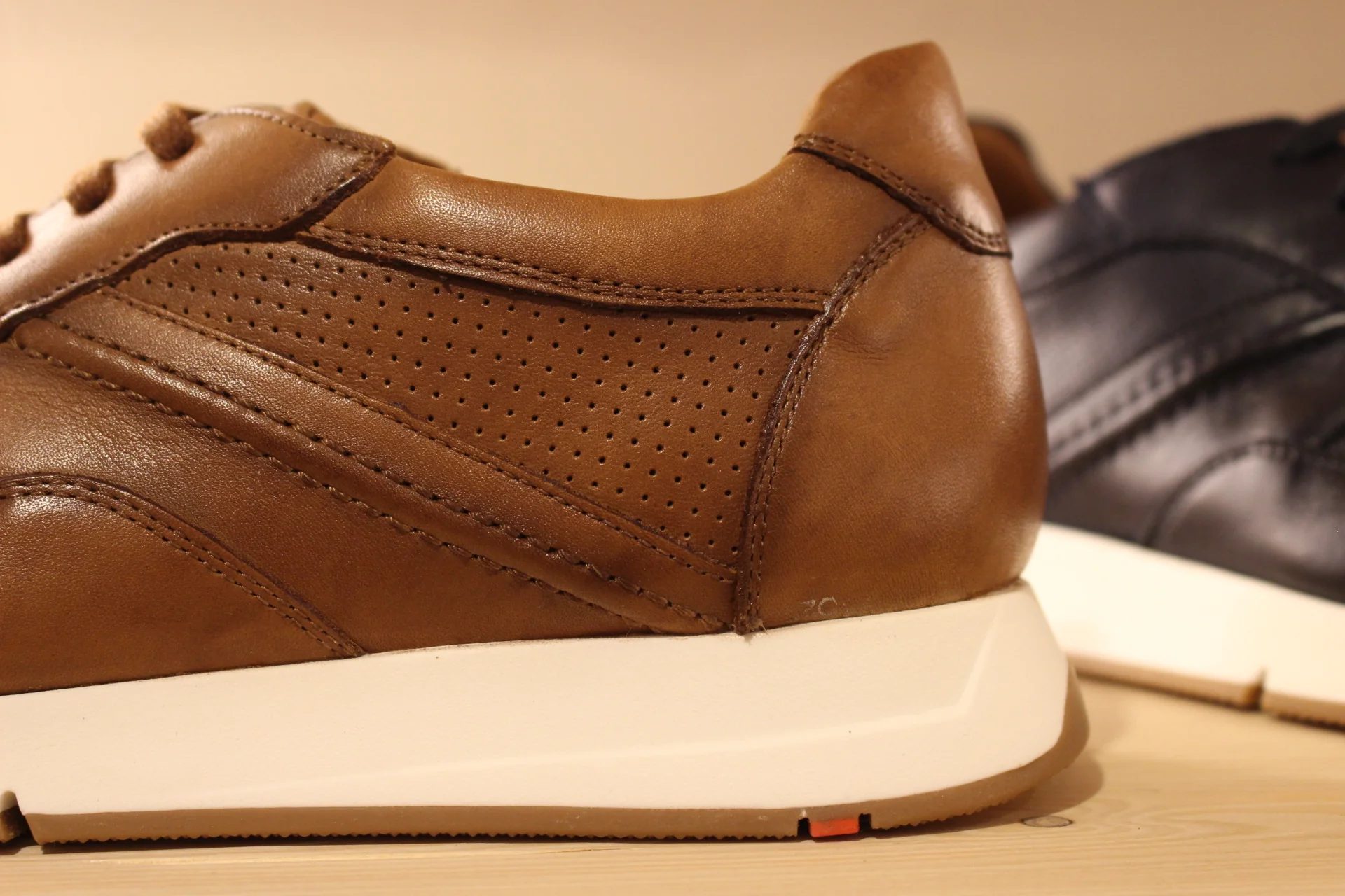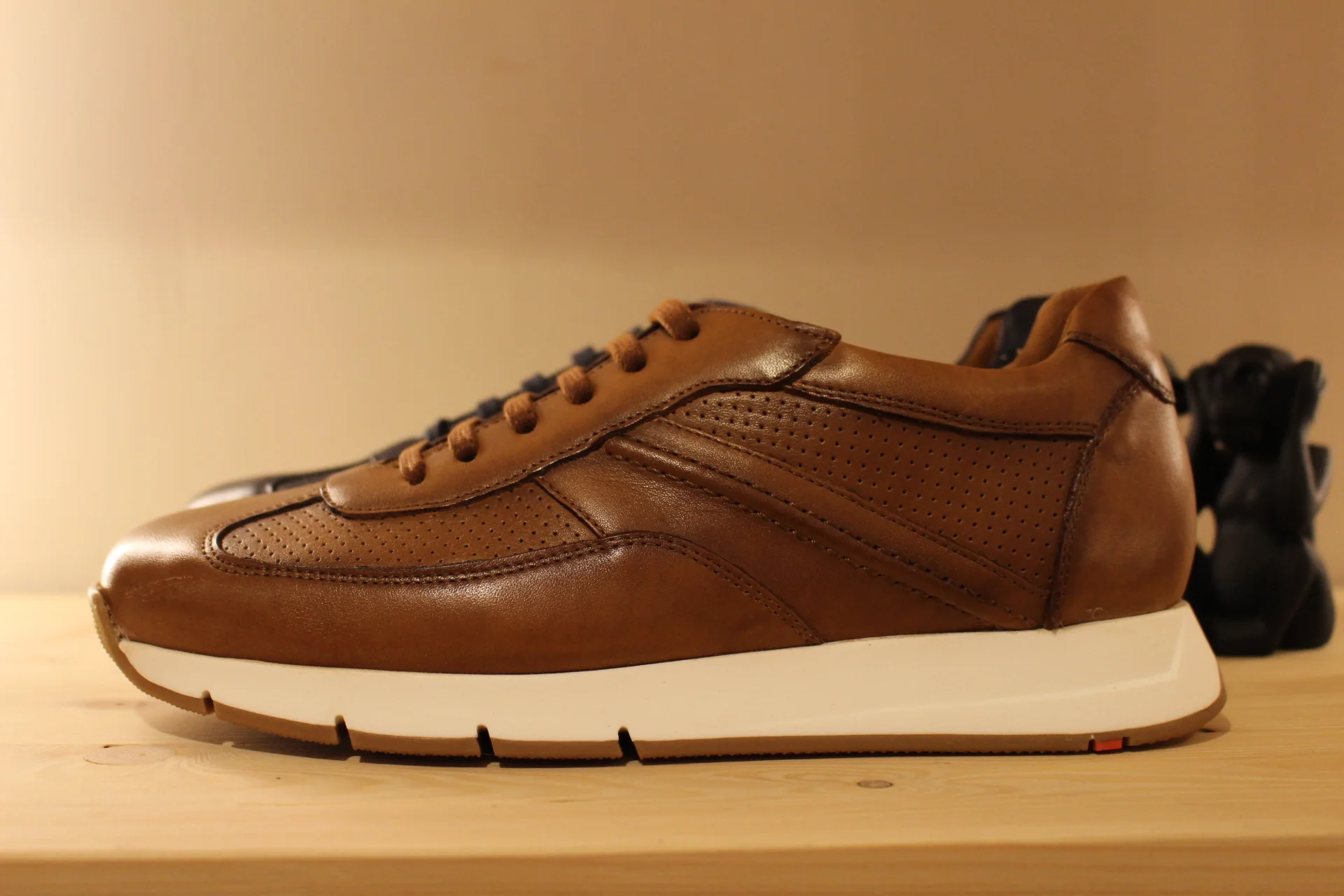 Chaussures LLOYD – Adlay. Chaussures coupe sneaker en cuir de couleur bleu marine, ou de couleur whisky. Serrage lacets coton ton sur ton. Chaussures doublées cuir. Semelle interne amovible et très amortissante. Semelle externe en gomme blanche de 3 cm. Talon de 1 cm. Existe du 39 au 45. Chaussures extra légères. Un bel équilibre de ligne et de couleur. Sélectionner une pointure d emoins. Chaussant généreux.