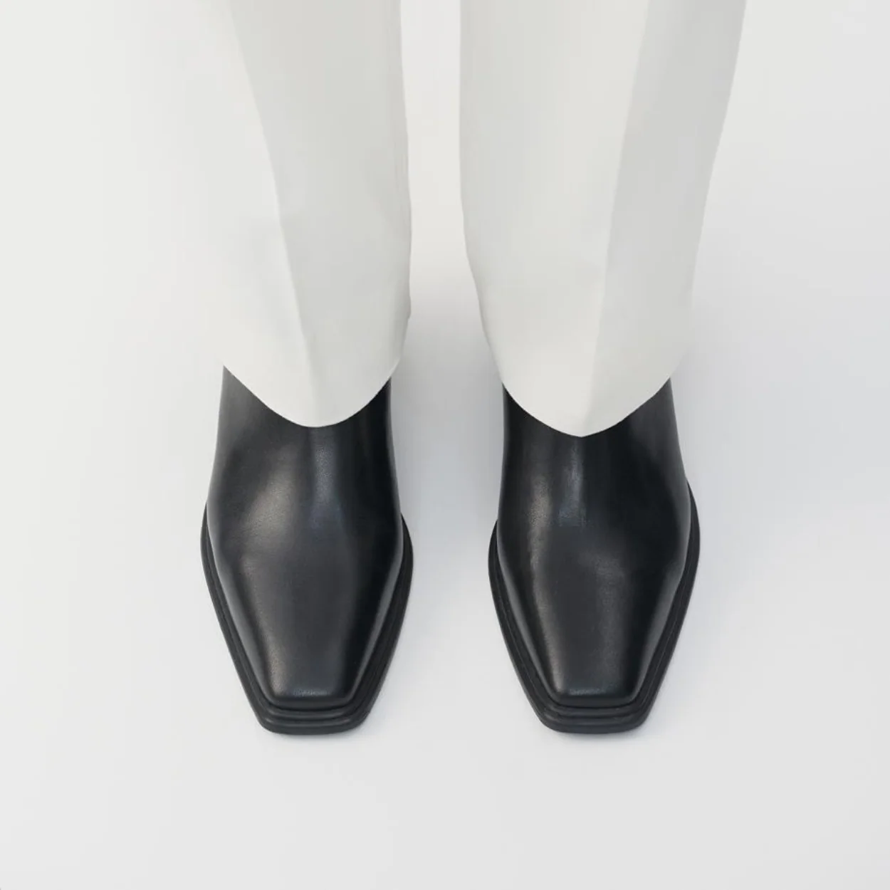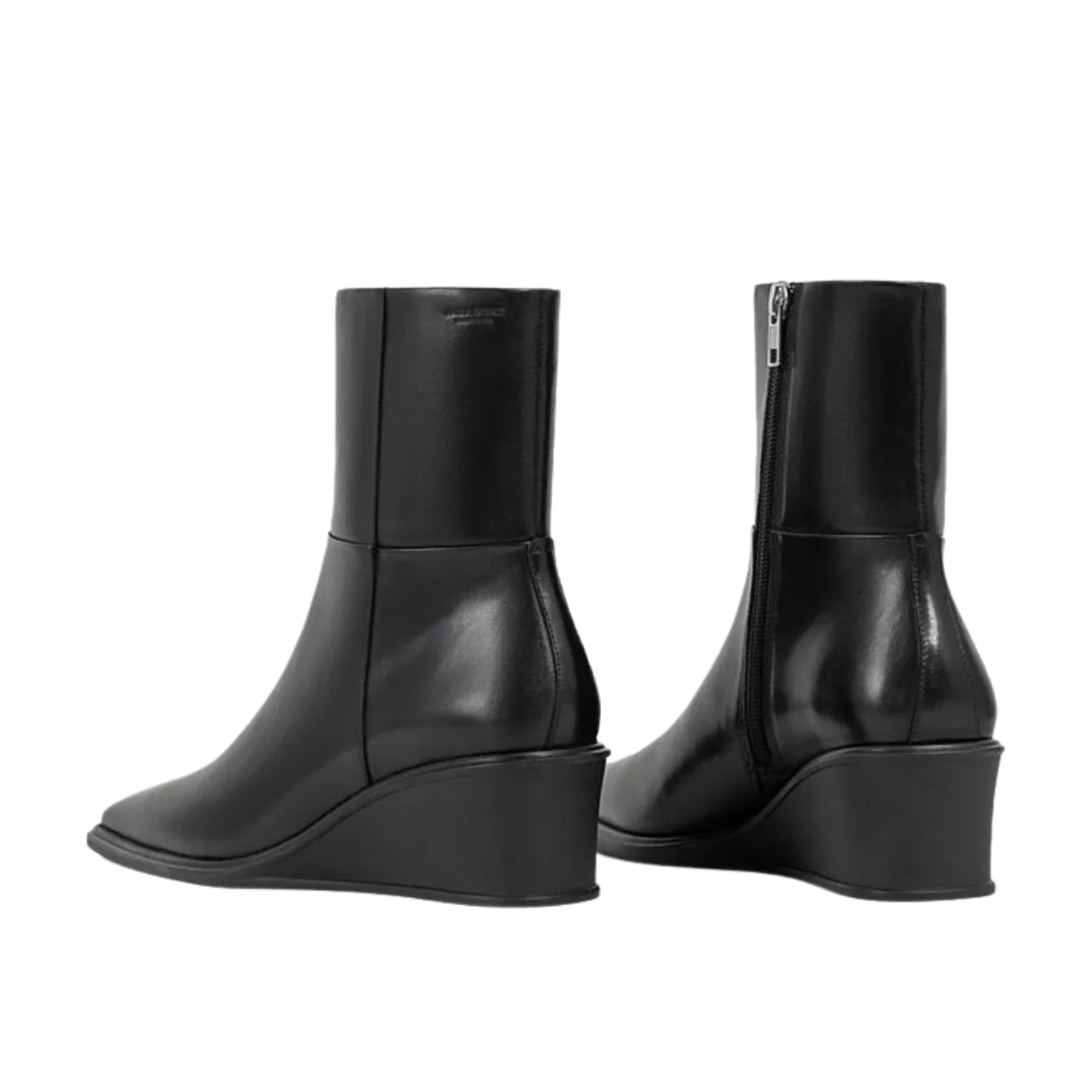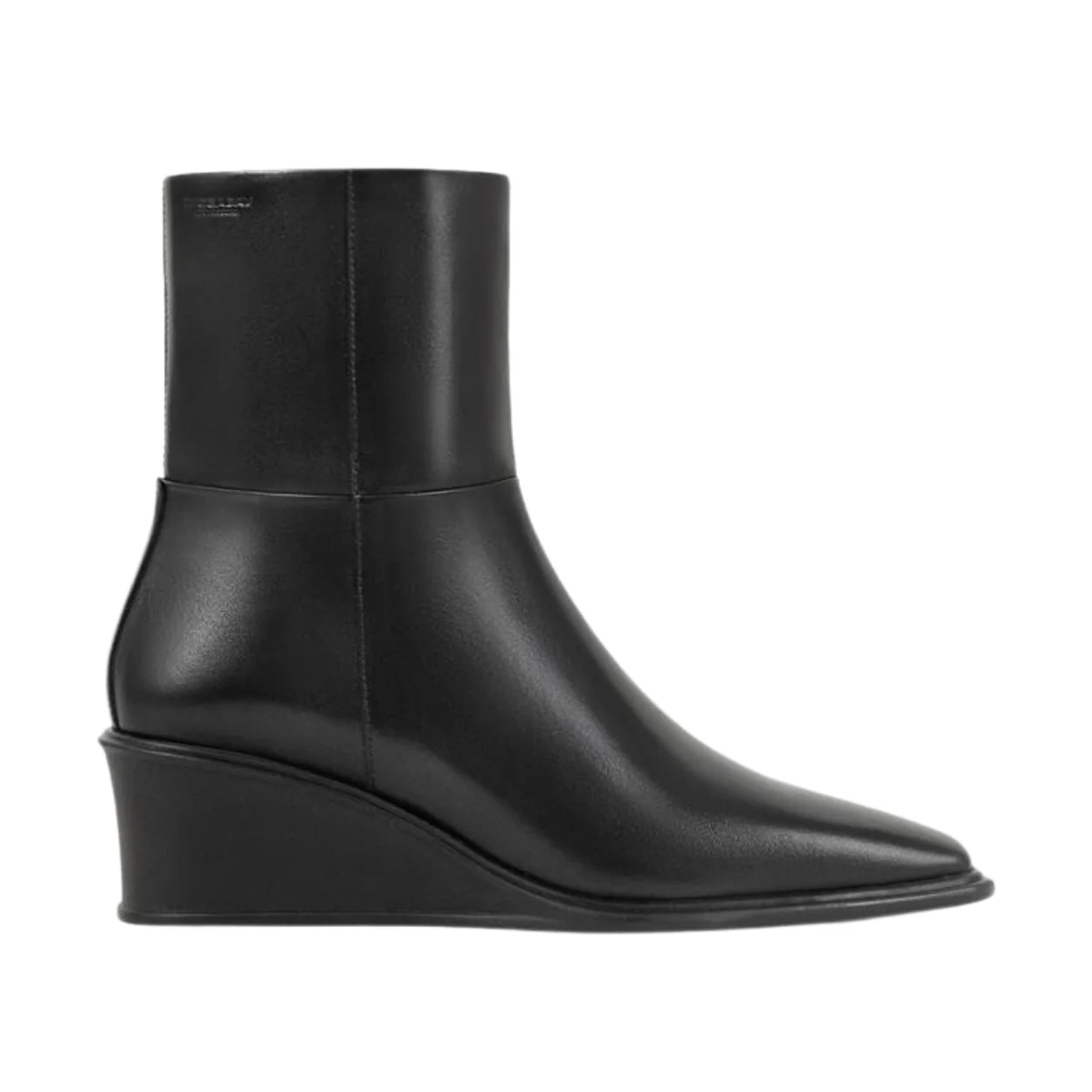 Aino, ce sont les bottines contemporaines à porter au quotidien. Le modèle est confectionné en cuir noir avec une forme pointue et une fermeture zippée sur le côté. Les talons compensés élégants mesurent 50 mm.