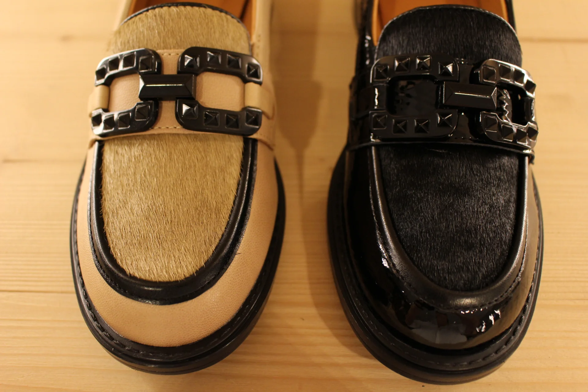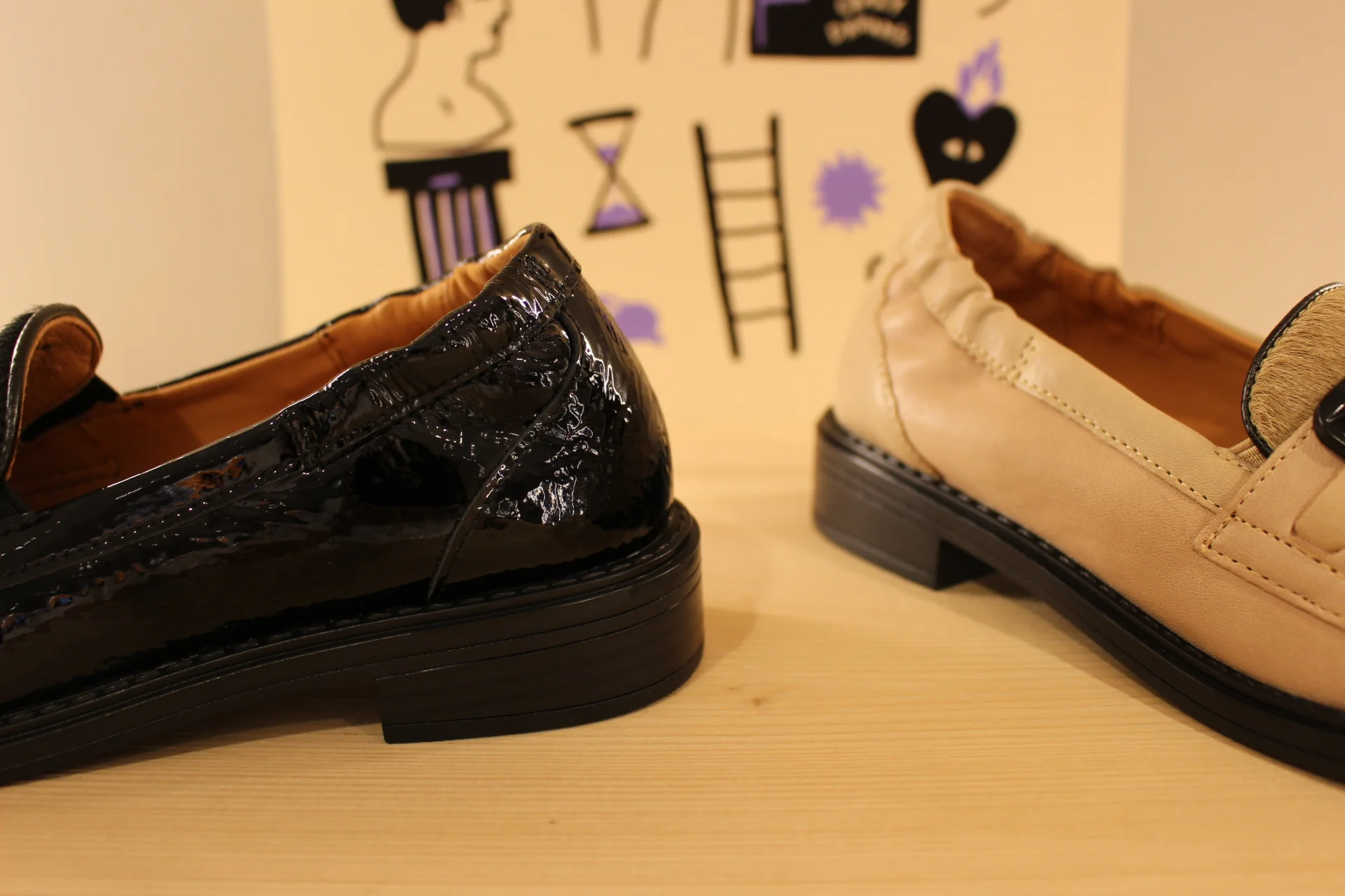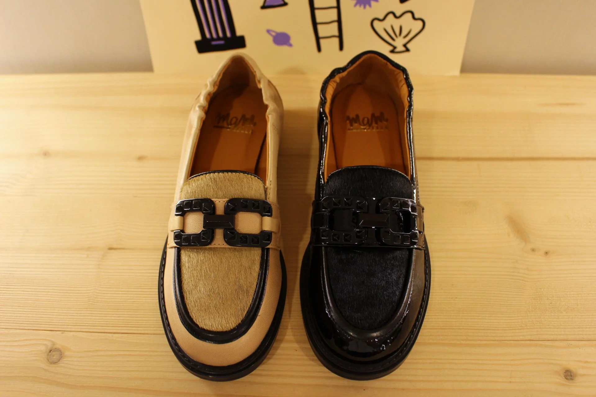 Chaussures MAMZELLE – Berca. Mocassin en cuir créme ou de couleur noir vernis. Finition cuir lisse noir sur les bordures coup de pied. Claque habillée poils ton sur ton. Barette bijoux noir. Elastiques sur l’arrière. Chaussures doublées cuir. Semelle externe de 1 cm. Talon de 2 cm. Un moc quotidien et élégant !
