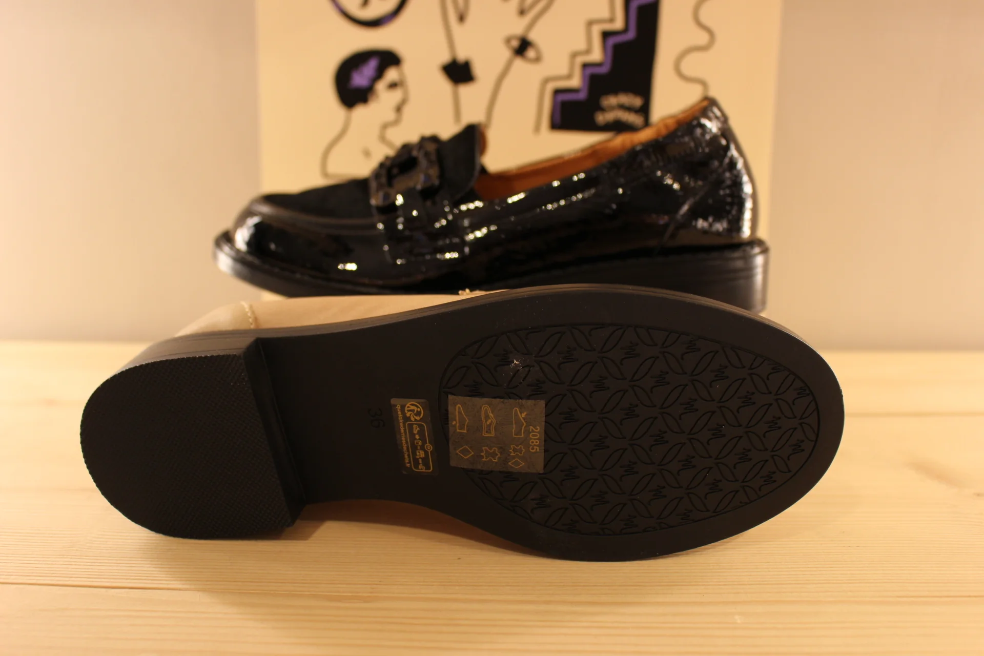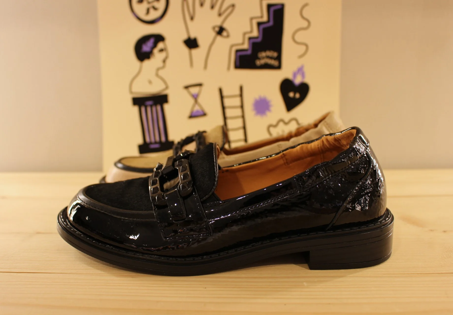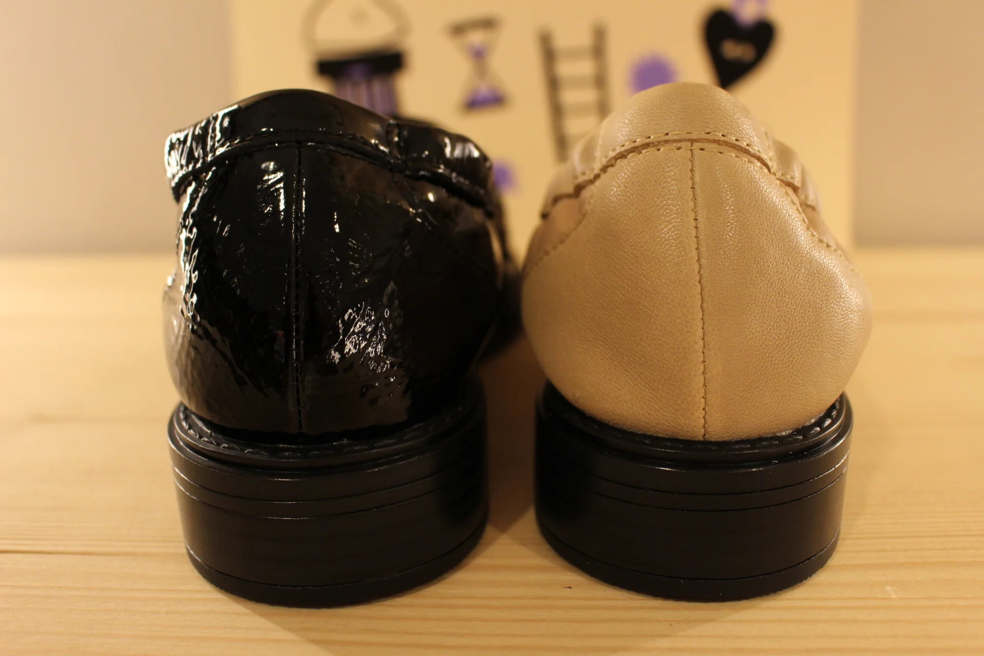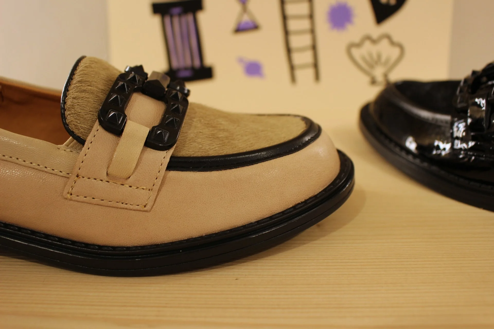 Chaussures MAMZELLE – Berca. Mocassin en cuir créme ou de couleur noir vernis. Finition cuir lisse noir sur les bordures coup de pied. Claque habillée poils ton sur ton. Barette bijoux noir. Elastiques sur l’arrière. Chaussures doublées cuir. Semelle externe de 1 cm. Talon de 2 cm. Un moc quotidien et élégant !