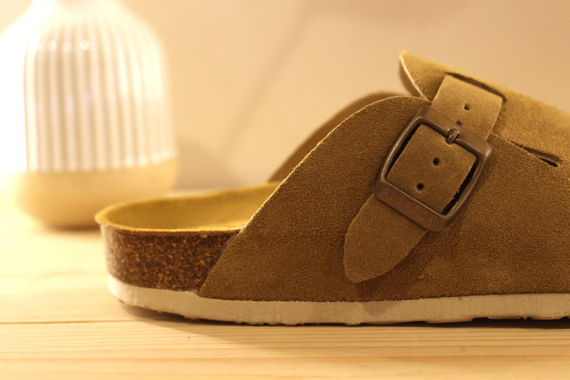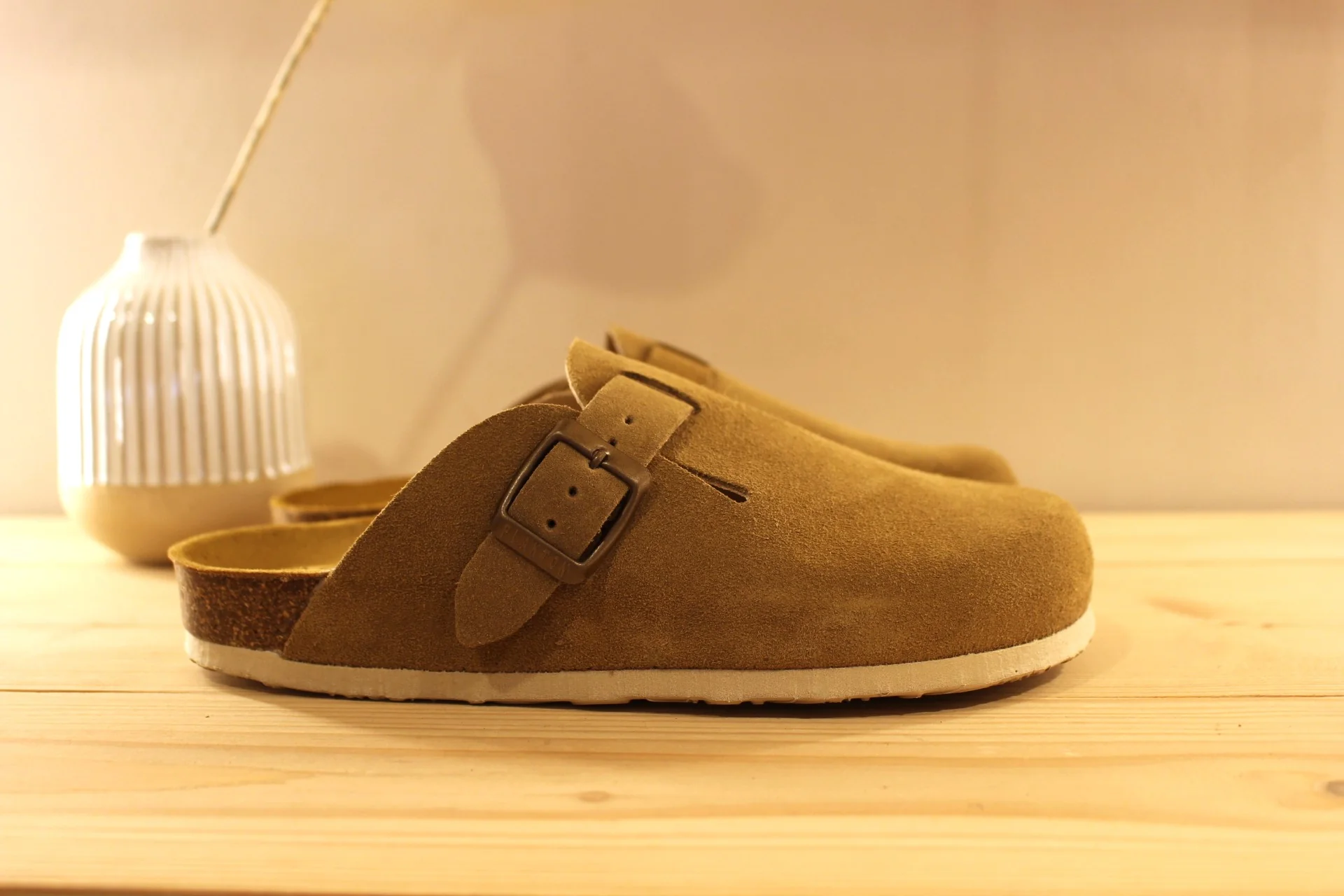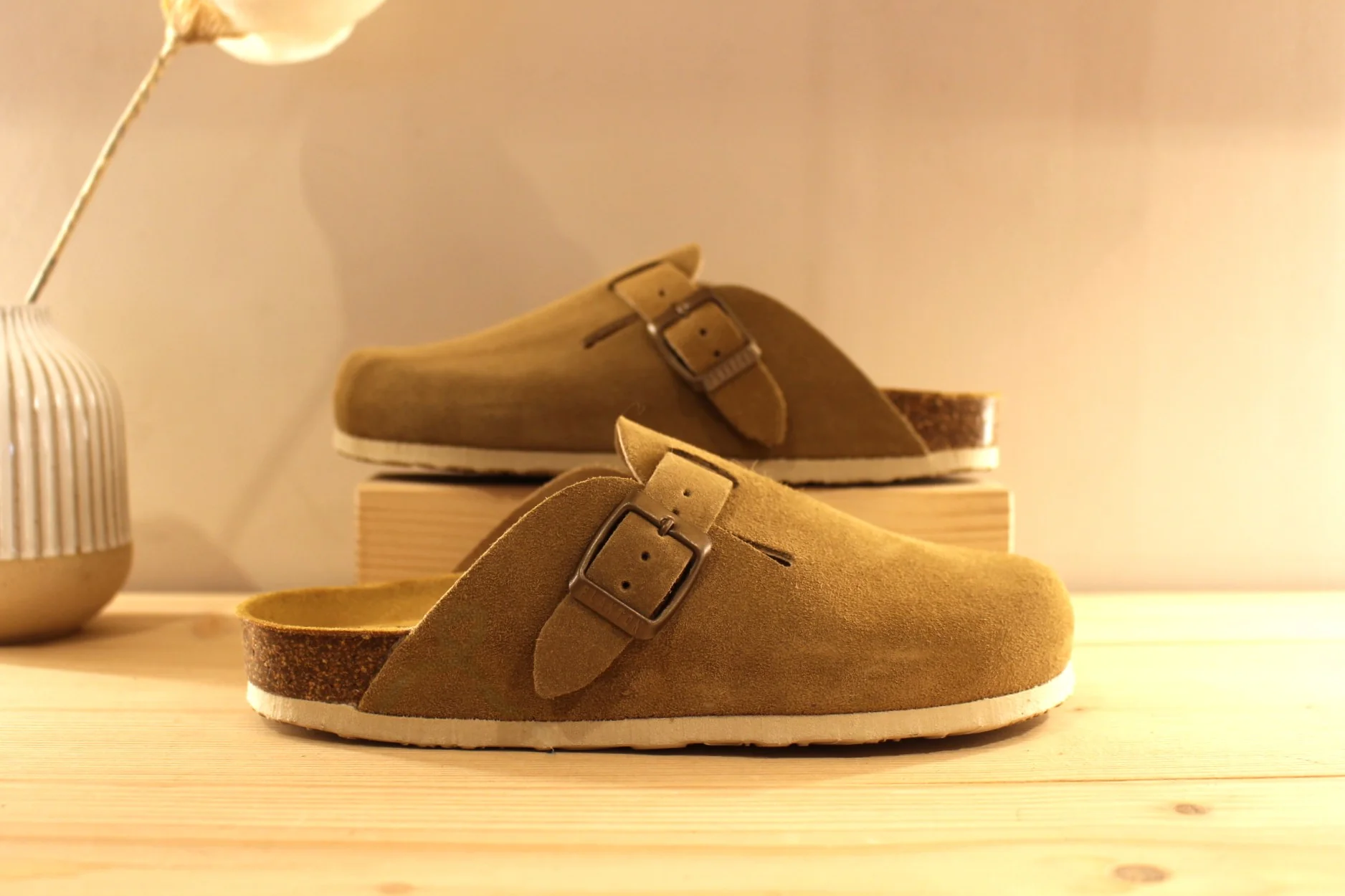 Chaussures PLAKTON – Blogg. Fabrication espagnole. Sabot en cuir velours de couleur tan. Forme arrondi. Serrage par boucle sur bride coup de pied. Chaussures doublées cuir. Semelle interne anatomique. Semelle externe en liège et gomme de 3.5 cm. Talon de 1 cm. Un super look et confortable ! Attention – sélectionnez une pointure de plus. Chaussant juste.