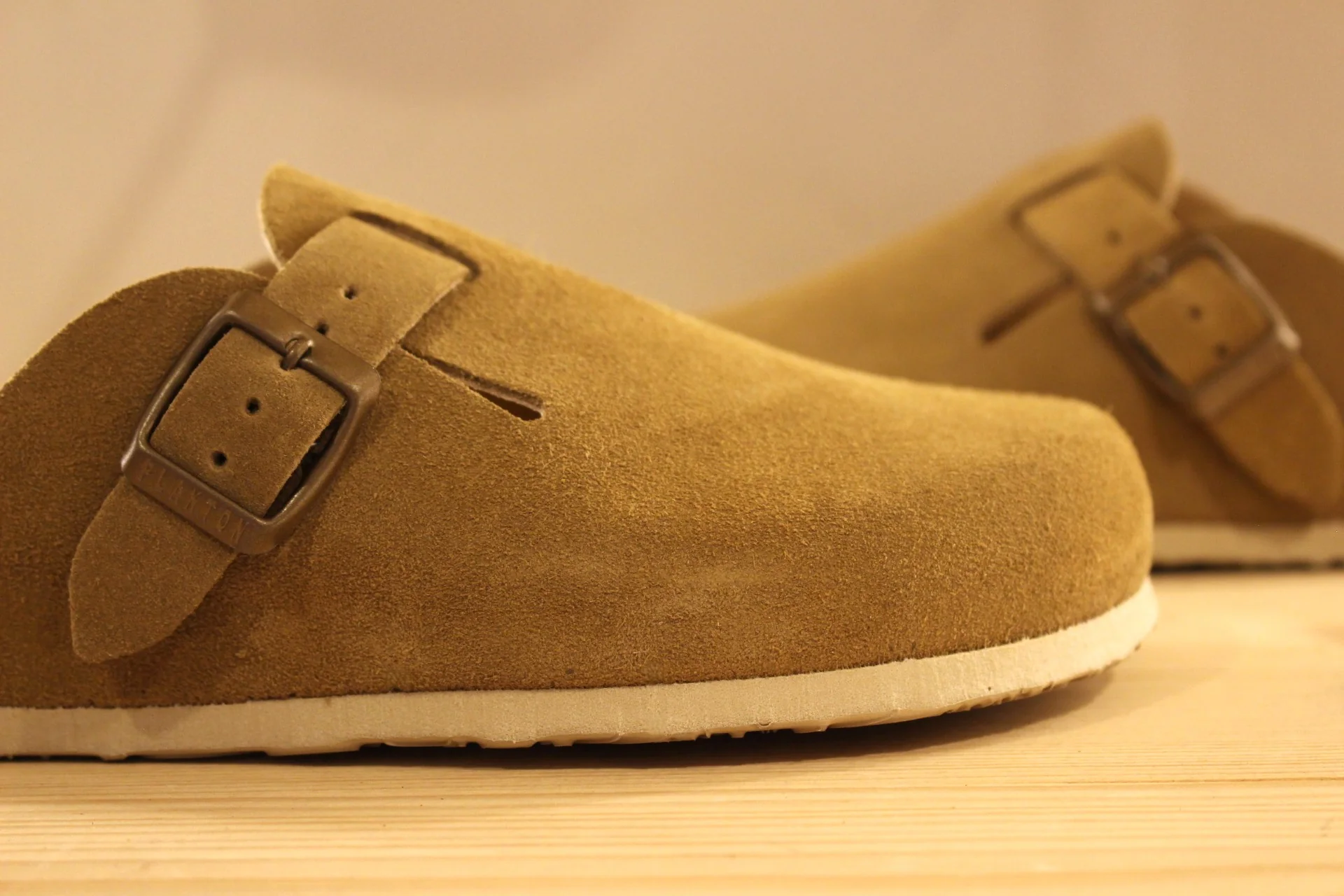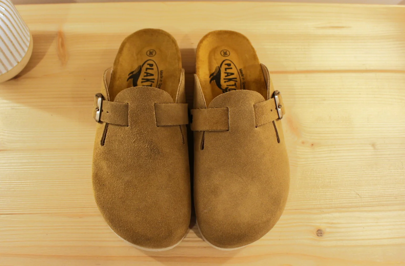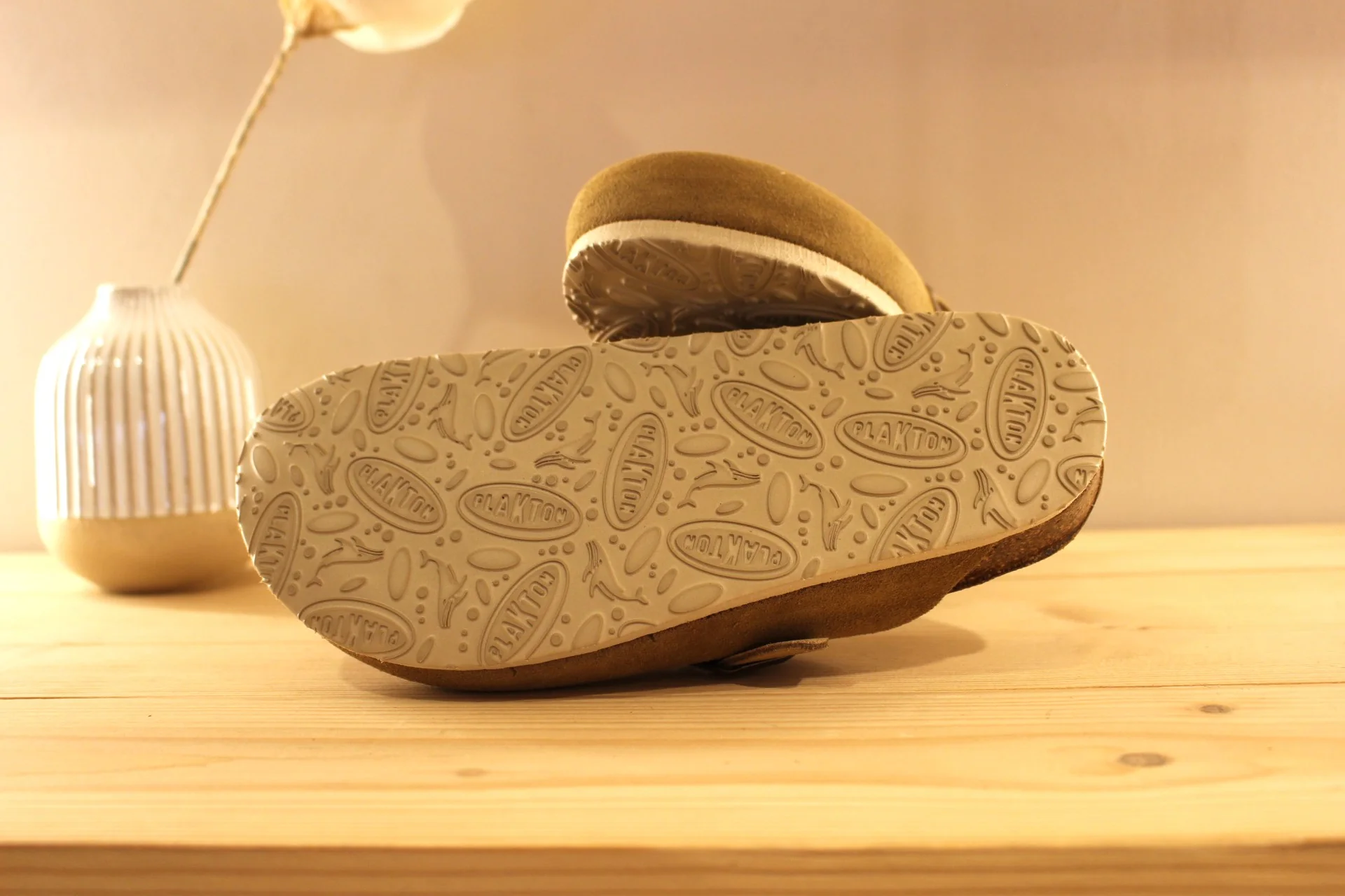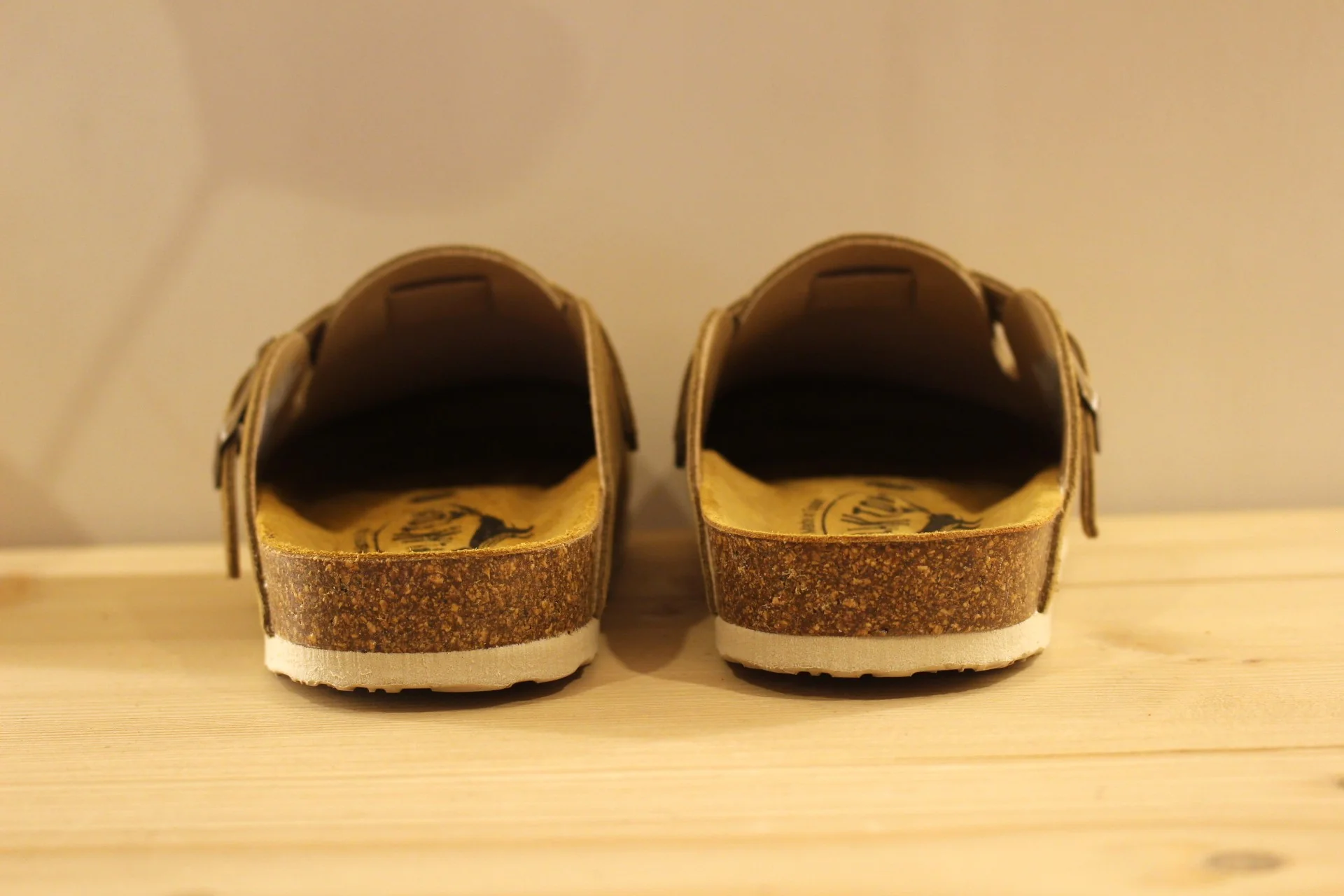 Chaussures PLAKTON – Blogg. Fabrication espagnole. Sabot en cuir velours de couleur tan. Forme arrondi. Serrage par boucle sur bride coup de pied. Chaussures doublées cuir. Semelle interne anatomique. Semelle externe en liège et gomme de 3.5 cm. Talon de 1 cm. Un super look et confortable ! Attention – sélectionnez une pointure de plus. Chaussant juste.