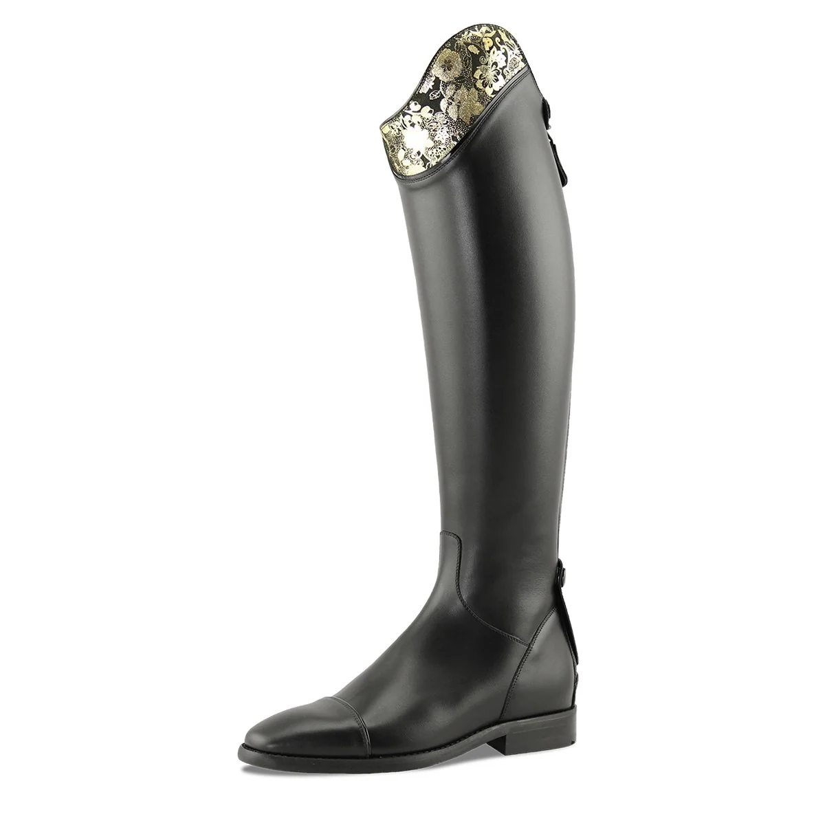 Bottes d’équitation en cuir. Cuir pleine fleur de vache (cow) ou veau (calf) Doublure peau vachette. Semelle caoutchouc. Forme de pied confort. Montage collé. Courbure 5 cm. Fermeture éclair à l’envers jusqu’à la semelle avec bande de protection. Elastique le long de la fermeture éclair en option. Cheville élancée. Choix de coloris et options Idem […]