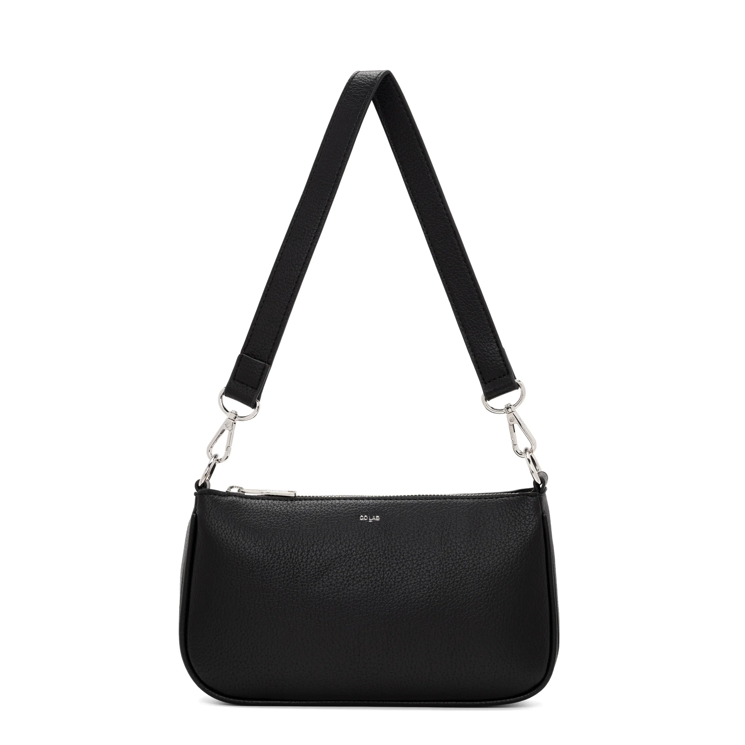 Cuir végétalien texturé recyclé Fermeture zippée sur le dessus du compartiment principal Bandoulière réglable / amovible sur crochets Glissière arrière Intérieur: Poche rembourrée pour téléphone portable Signature Colab pour garder le téléphone en sécurité 10″ x 6″ x 2″