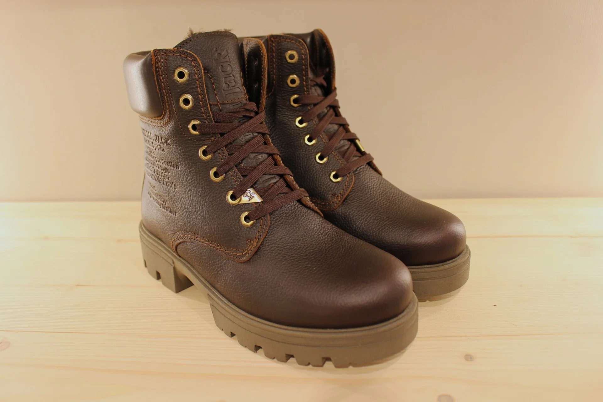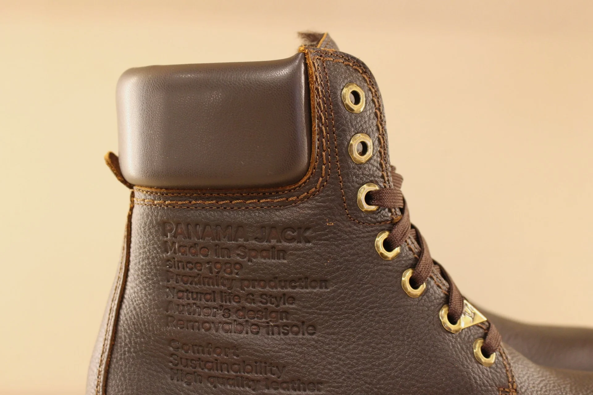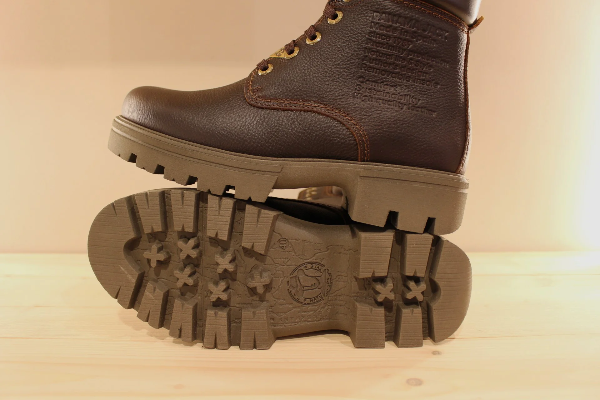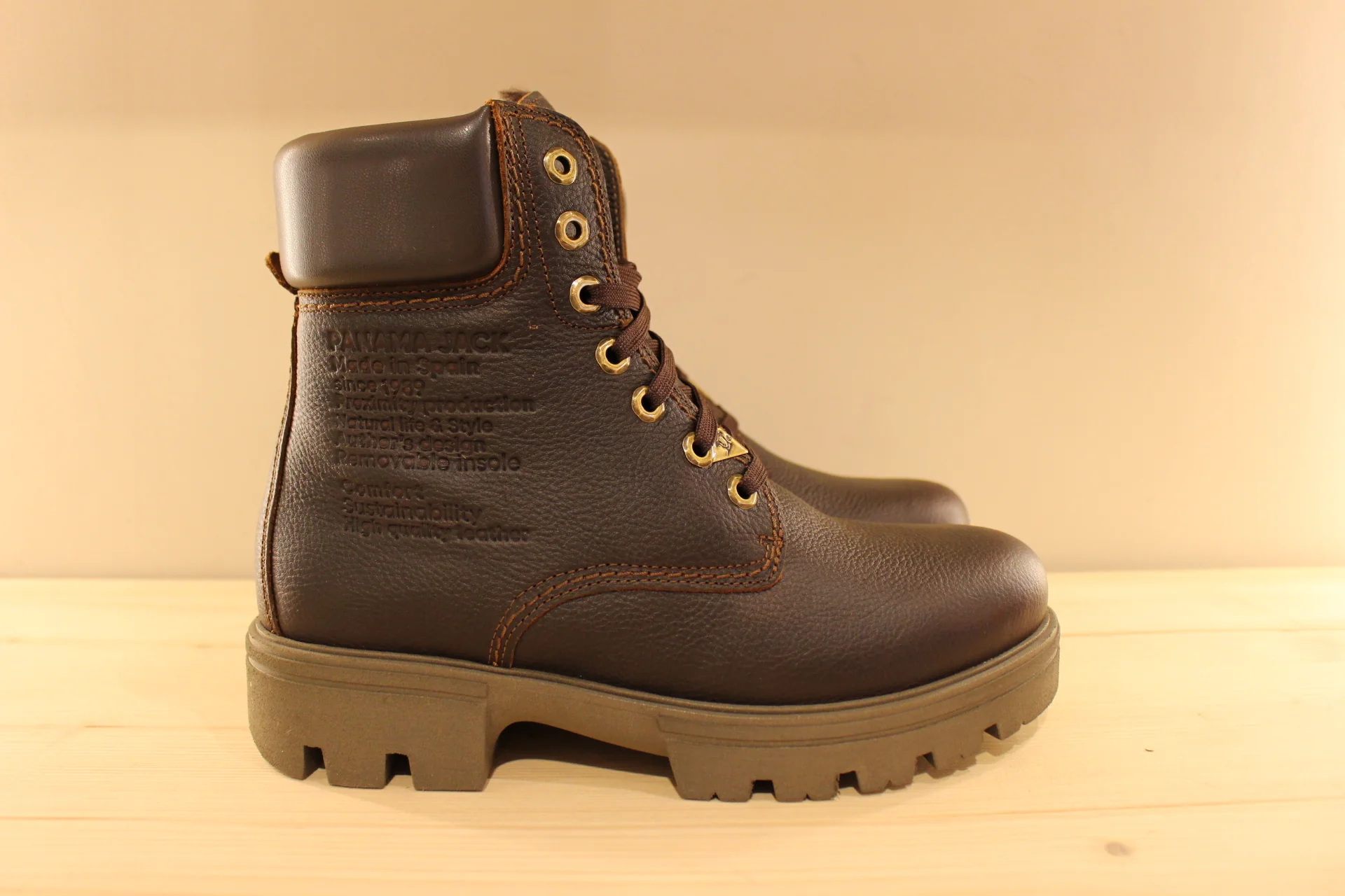 Bottines PANAMA JACK modèle Cody. Fabrication Espagnole. Bottines hommes, en cuir gras de couleur châtaigne. Cuir traité waterproof. Chaussures doublées acrylique. Serrage lacets en coton ton sur ton. Hauteur de la tige 16 cm, renfort sur le haut de la tige en cuir lisse marron. Détail de fabrication ton sur ton sur le quartier externe. Semelle interne amovible. Semelle extérieure cousue en gomme épaisse 3 cm et crantée. Talon de 1.5 cm. Existe du 40 au 45.