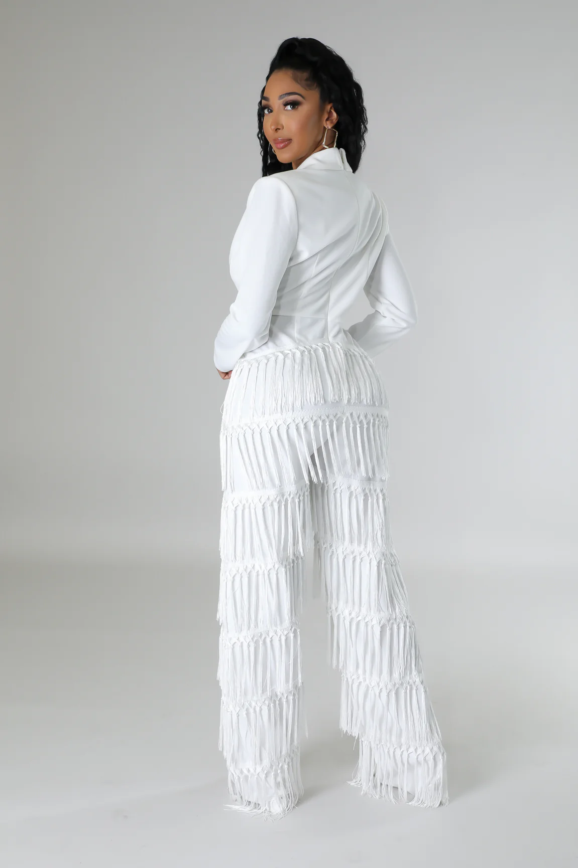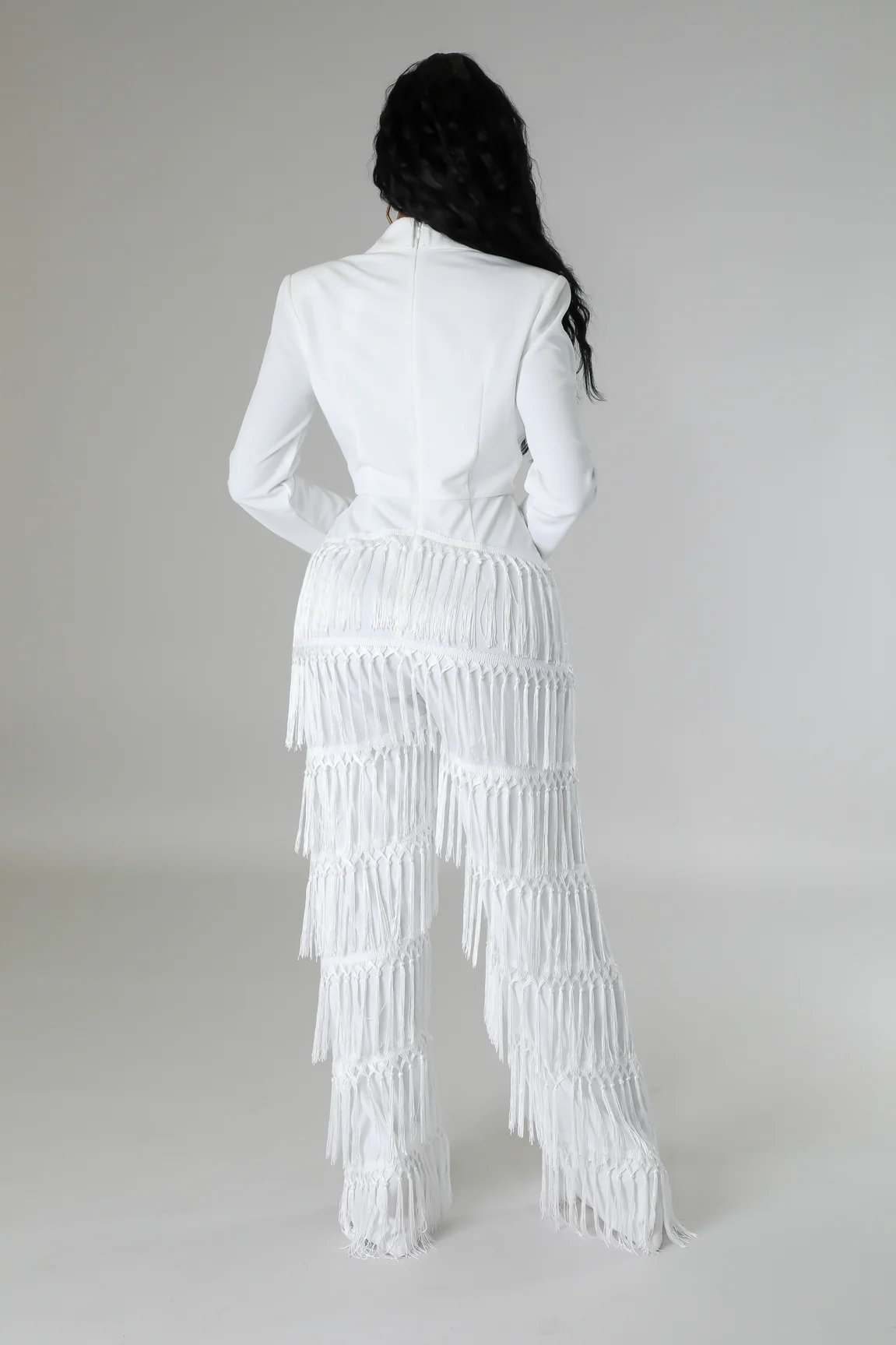 * Combinaison semi-extensible* Collier* Coupe en V basse* Manche longue* Rembourrage des épaules* Franges* Jambe large* Fermeture à glissière* L’entrejambe est de 35 pouces* 95 % polyester* 5 % d’élasthanne* Lavage à la main à l’eau froide* Le modèle porte une petite tailleSTATISTIQUES DU MODÈLEHauteur : 5,5″Buste:32″ / Taille:26″ / Hanches:41″