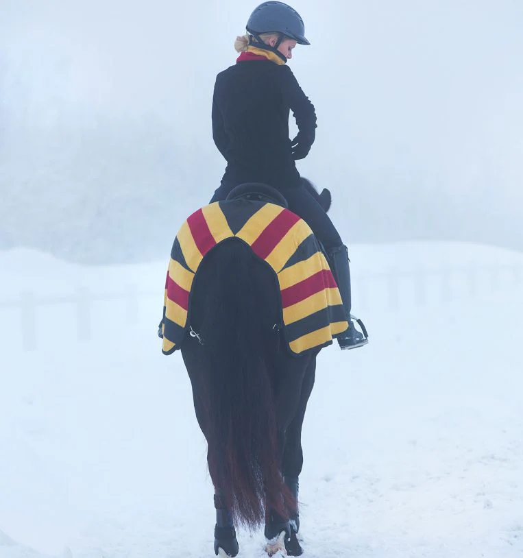 - Ourlet large, conçu pour garder la croupe au chaud tout en permettant une communication claire entre vous et votre cheval, sans interférer avec vos actions de jambes.
