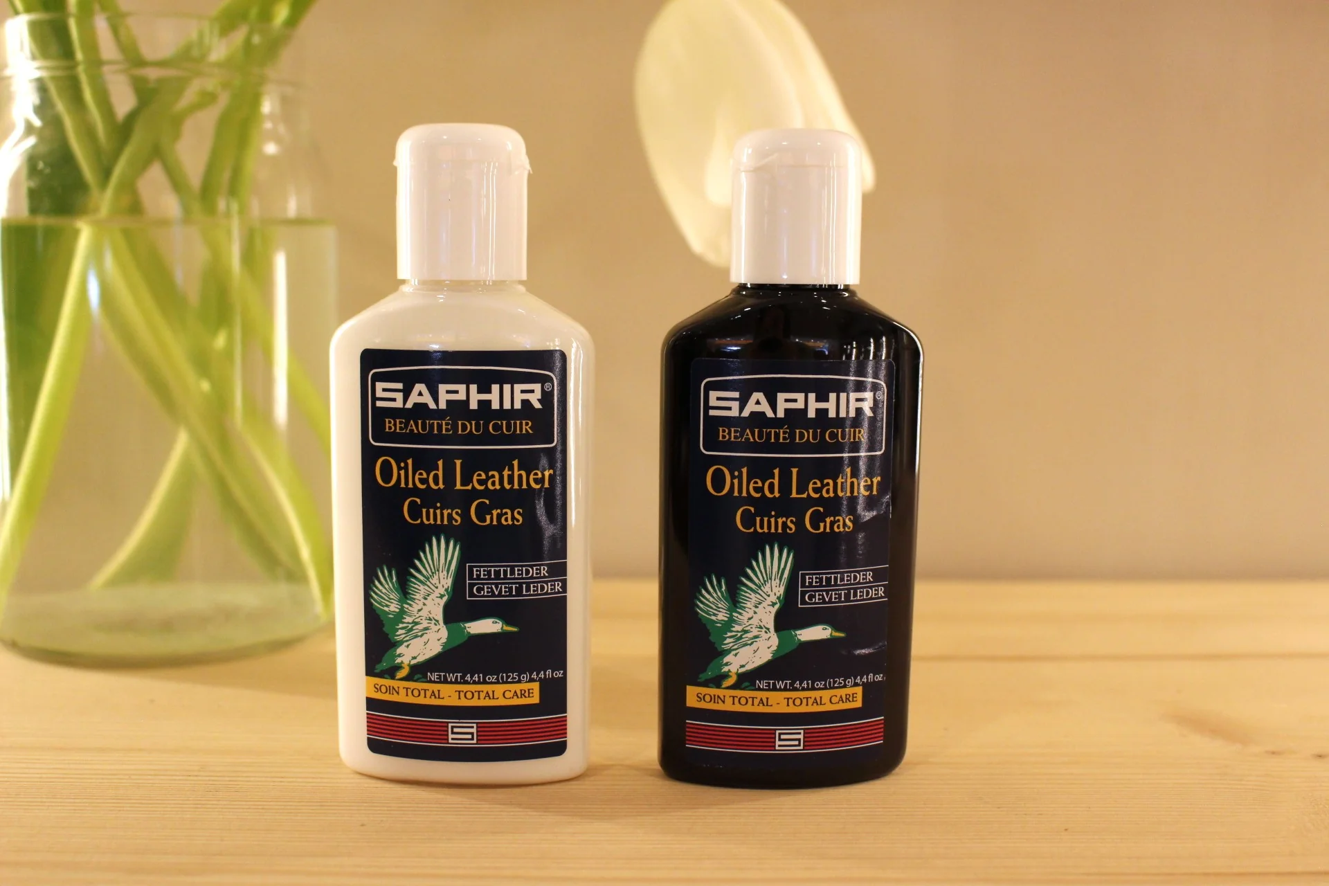 Cirage SAPHIR. Fabrication française. Crème protectrice à l’huile de bœuf naturelle pour vos chaussures en cuirs gras et en nubuck gras. Elle nettoie, nourrit, recolore et imperméabilise vos chaussures en cuirs gras. Cela donne une bonne résistance du cuir notamment en hiver (neige et pluie). Décliné en incolore ou de couleur noir. Flacon de 125 ml.