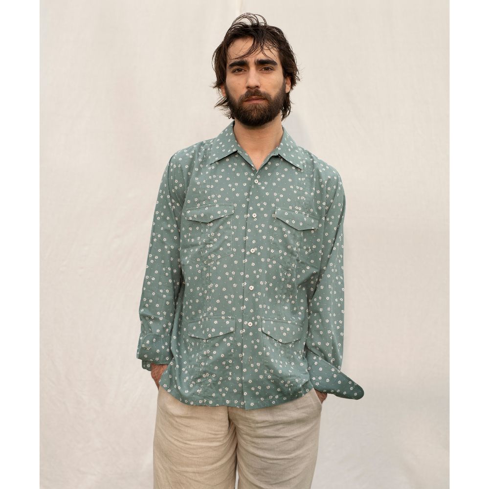 Chemise unisexe en coton, chemise liquette à 4 poches plaquées plissées et empiècement en pointe avec panneaux plissés dos et devant, deux fentes sur les côtés poignées ouvrables avec un bouton.