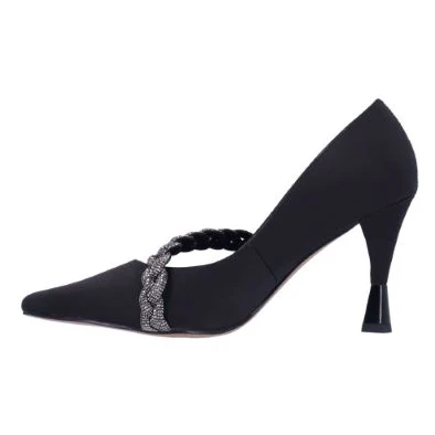 Une bride tressée incrustée de strass rehausse la silhouette classique de cet escarpin à bout pointu, posé sur un talon aiguille sculptural.