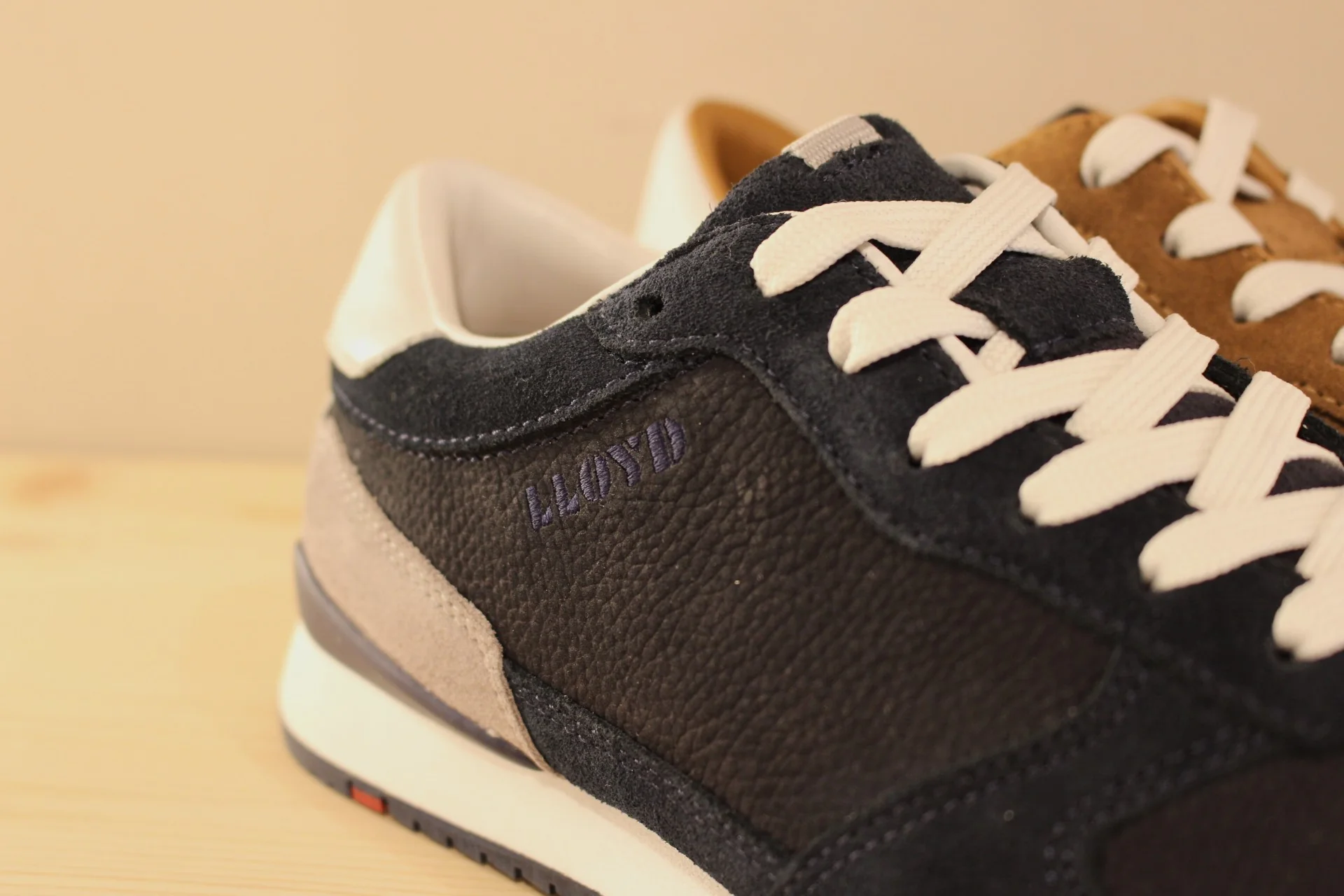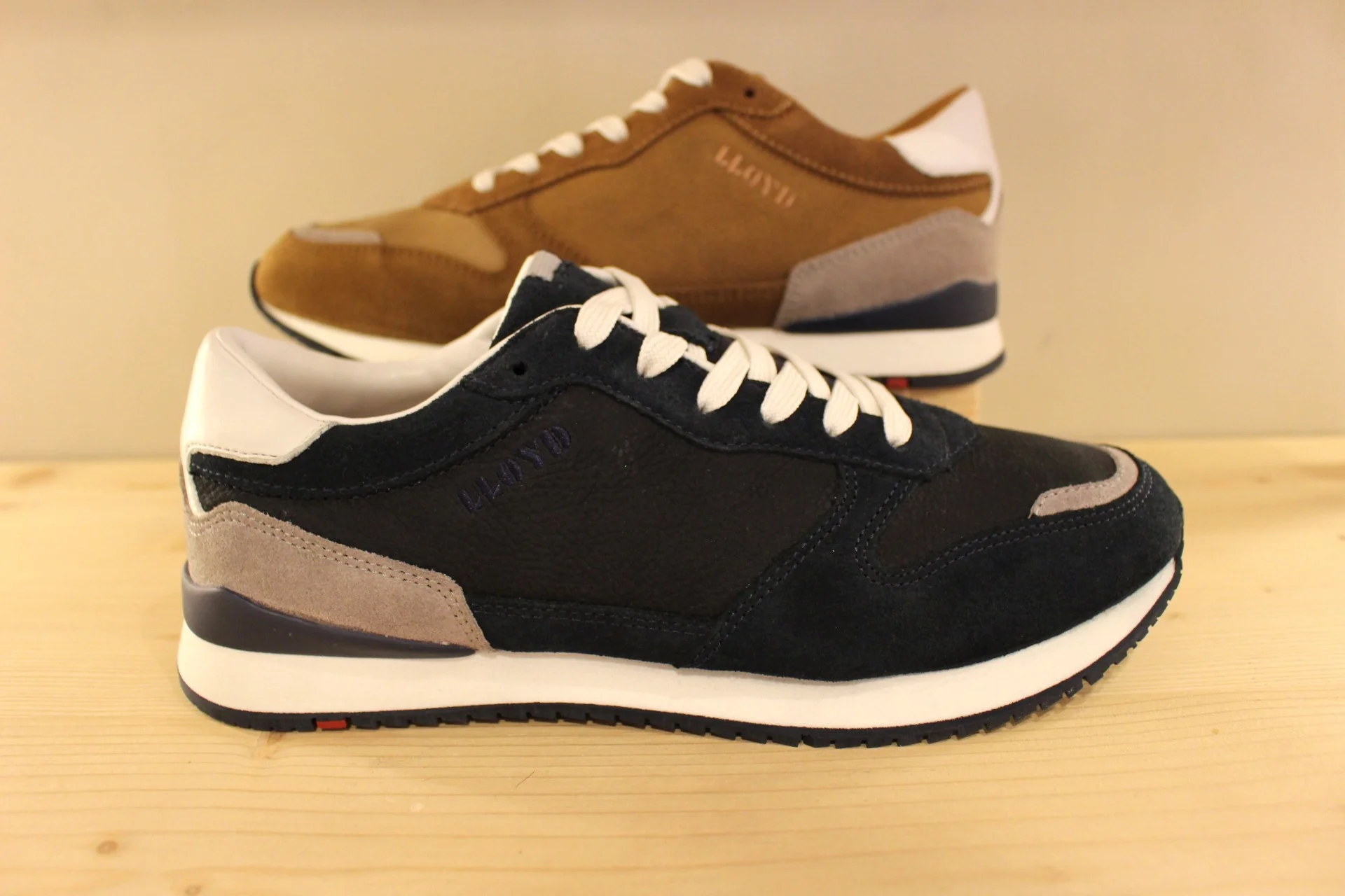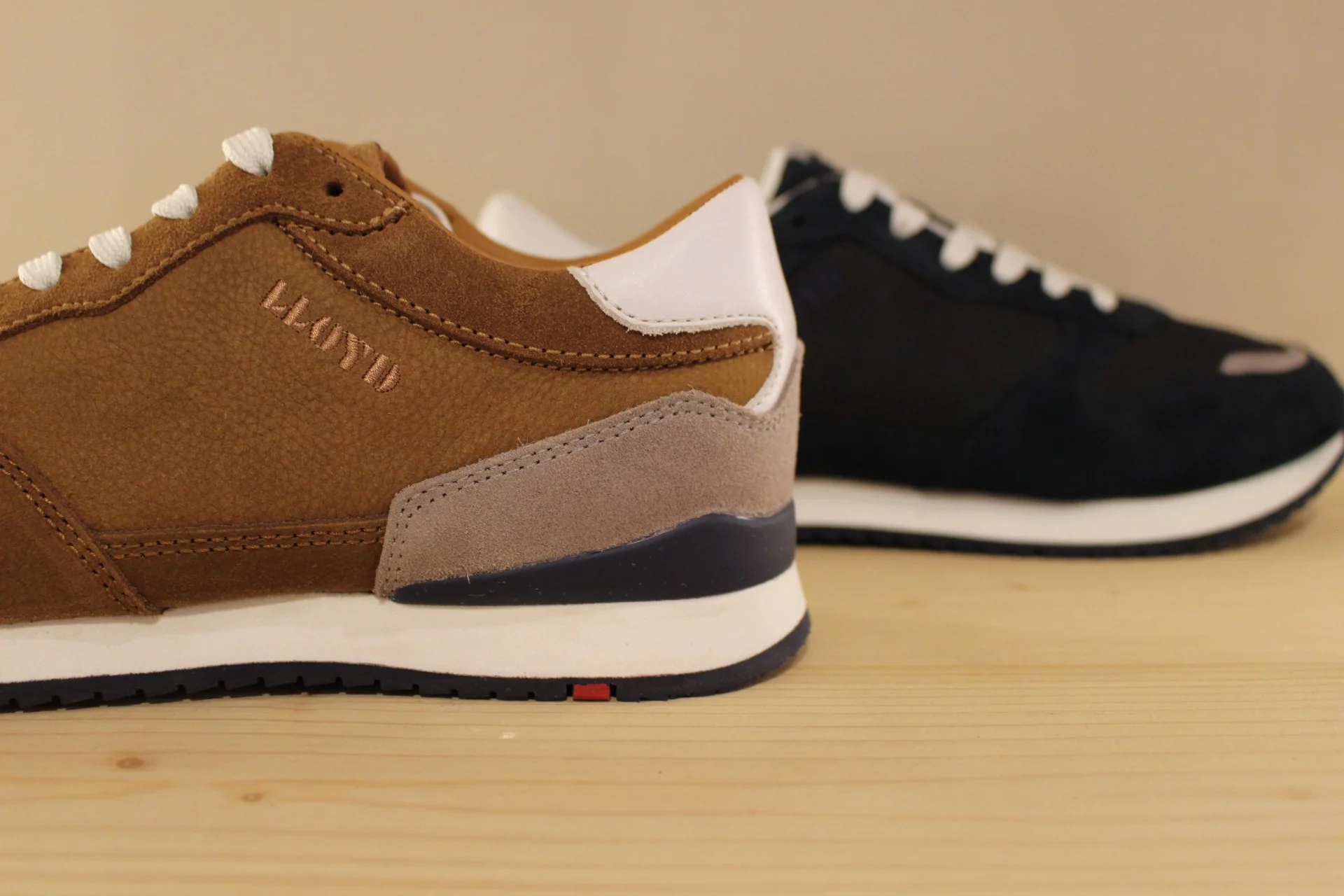 Chaussures LLOYD – Elmore. Sneaker en cuir de couleur taupe ou de couleur bleu. Velours gris et cuir blanc sur l’arrière. Serrage lacets en coton blanc. Chaussures doublées cuir et éponge. Semelle interne amovible. Semelle externe en gomme crantée de 1.5 cm. Talon de 0.5 cm. Chaussures très légères..
