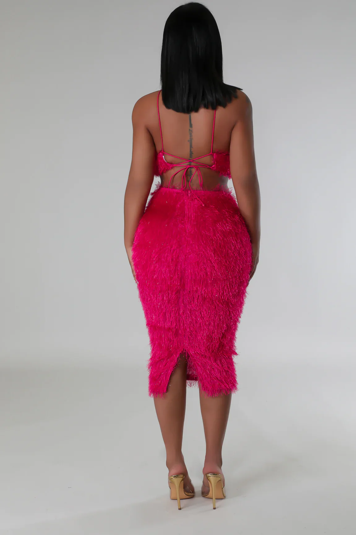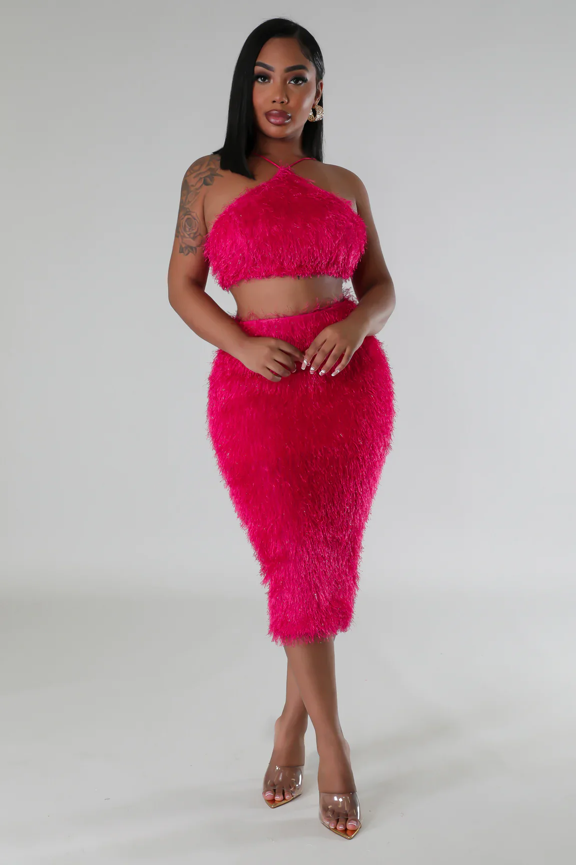 * Ensemble de deux pièces* Haut court* Licou* Sans manches* Tissu flou* Fermeture à nouer* Jupe taille haute* Ceinture élastique* Tissu flou*Soulignement* Fermeture à glissière* 100% Polyester* Lavage à la main à froid* Le modèle porte une petite tailleSTATISTIQUES DU MODÈLEHauteur : 5,3″Buste : 33″ / Tour de taille : 28″ / Hanches : 42″