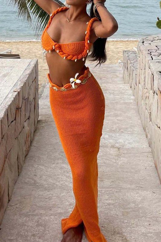 Ensemble soutien-gorge et jupe longue en maille tissée au crochet (2-2-2)