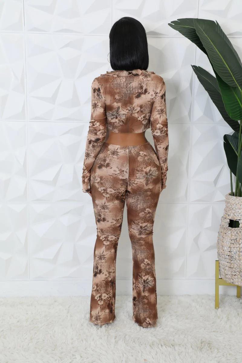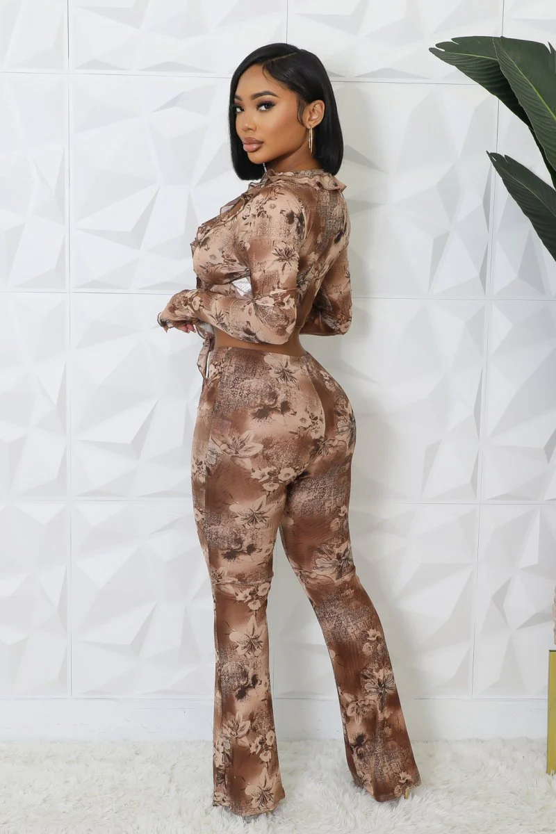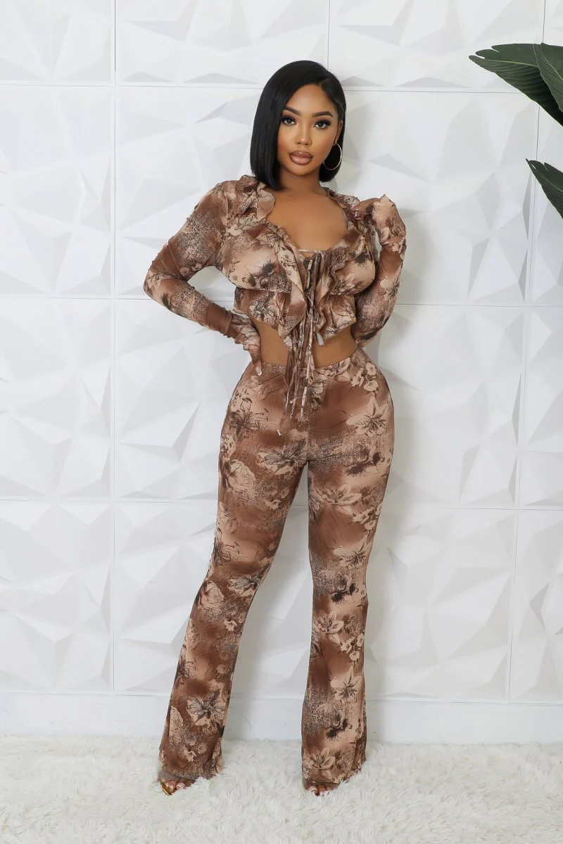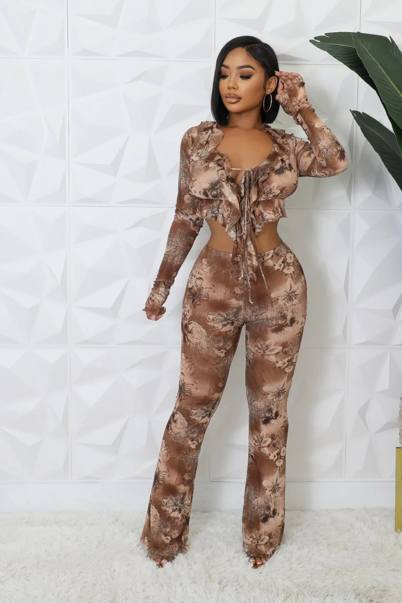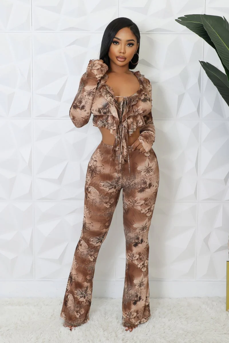 Ensemble pantalon extensible Col en V Manches longues Volants Pantalon taille haute Ceinture élastique Jambe large L’entrejambe mesure 35 pouces 95 % polyester, 5 % élasthanne Lavage à la main à froid Le mannequin porte une taille S STATISTIQUES DU MANNEQUIN Hauteur : 5,3″ Buste : 33″ / Taille : 28″ / Hanches : 42″