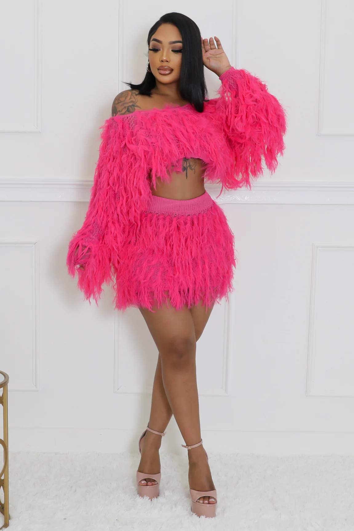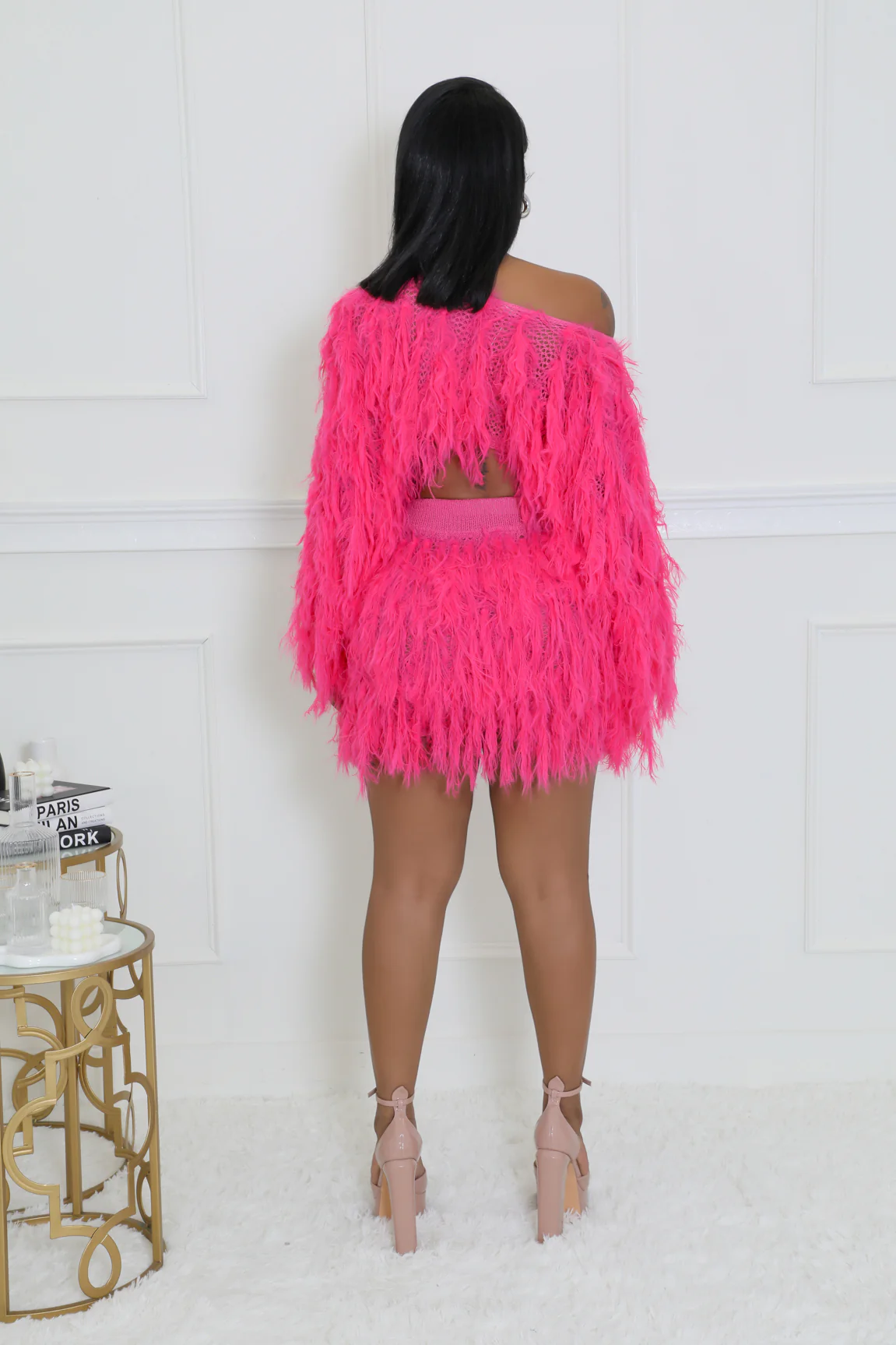 * Ensemble jupe extensible* Tricoté* Col en V* Manche longue*Jupe taille haute* Ceinture élastique* Frange de fourrure* 100% Polyester* Lavage à la main à l’eau froide* Le modèle porte une petite tailleSTATISTIQUES DU MODÈLEHauteur : 5,3″Buste:33″ / Taille:28″ / Hanches:42″