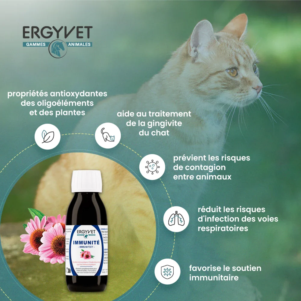 Ergyvet Immunité est un complément alimentaire naturel et appétent, spécialement formulé pour stimuler les défenses naturelles, soutenir la respiration et favoriser une bonne hygiène buccale, notamment chez le chat.