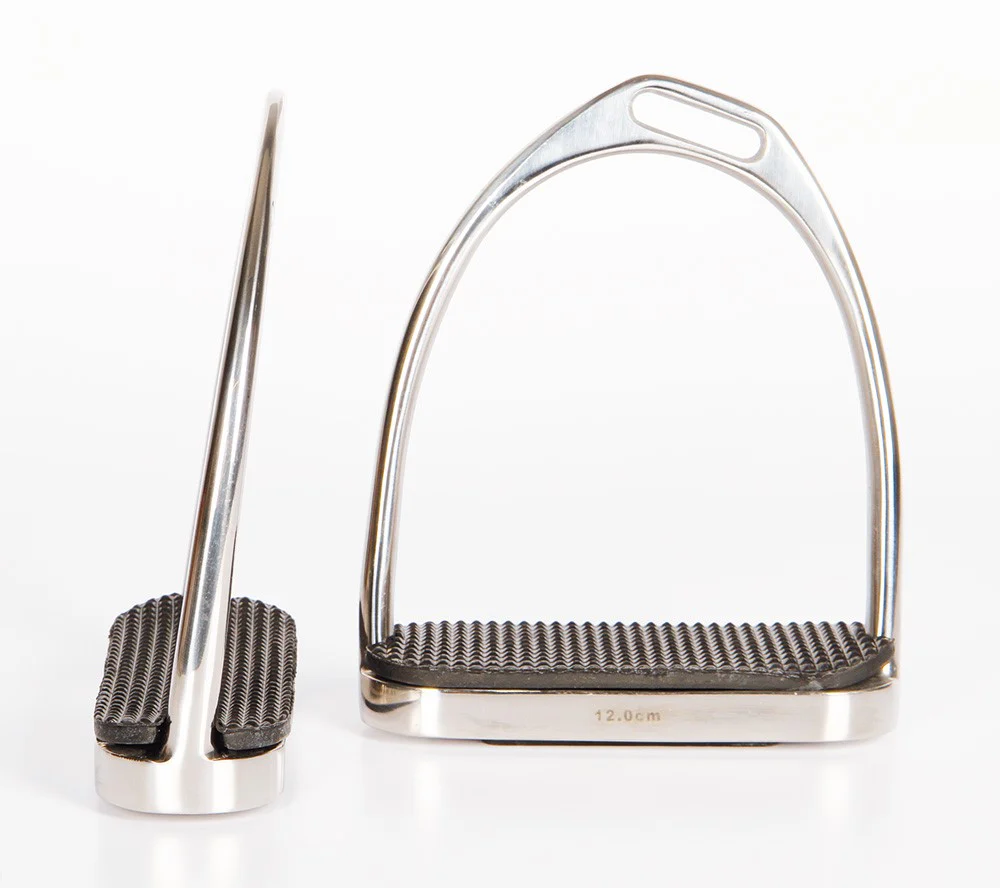 Idéal pour le dressage. Asymétriques pour une meilleure position genou-mollet et pour faciliter l’abaissement du talon. En inox. Semelles caoutchouc.