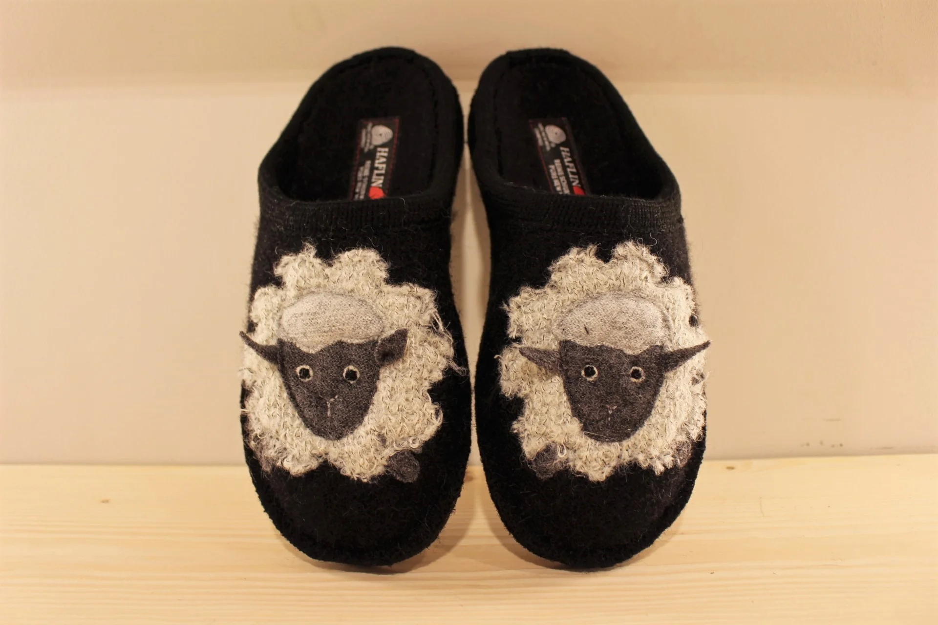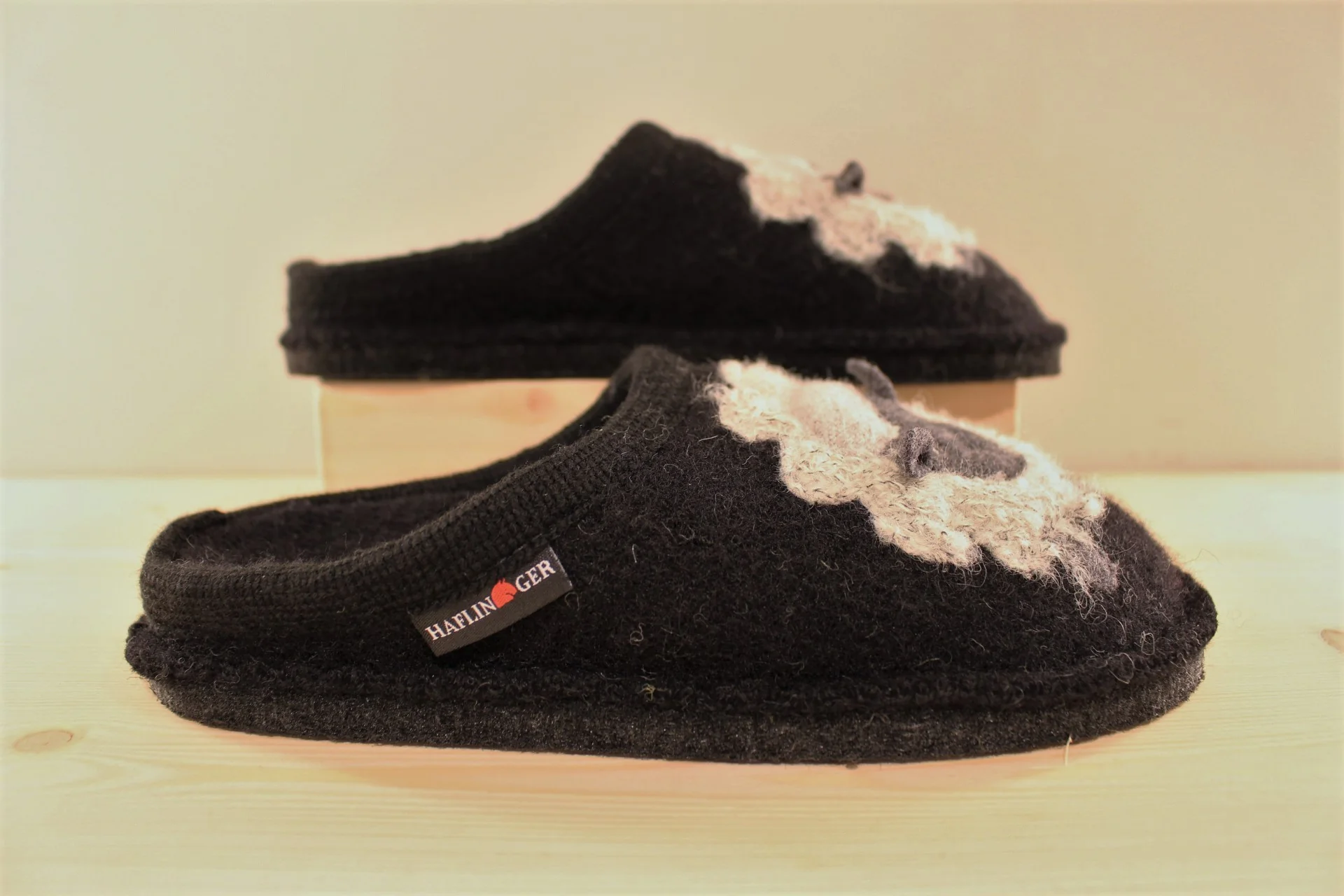 Chaussons HAFLINGER modèle Flair Lamby. Chaussons coupe mule en pure laine de couleur noir avec motif mouton. Chausson cousu. Chausson Extra souple. Semelle interne en laine avec maintien de la voûte plantaire. Semelle externe en feutre (mélange gomme) anti-dérapant. Existe du 36 au 44