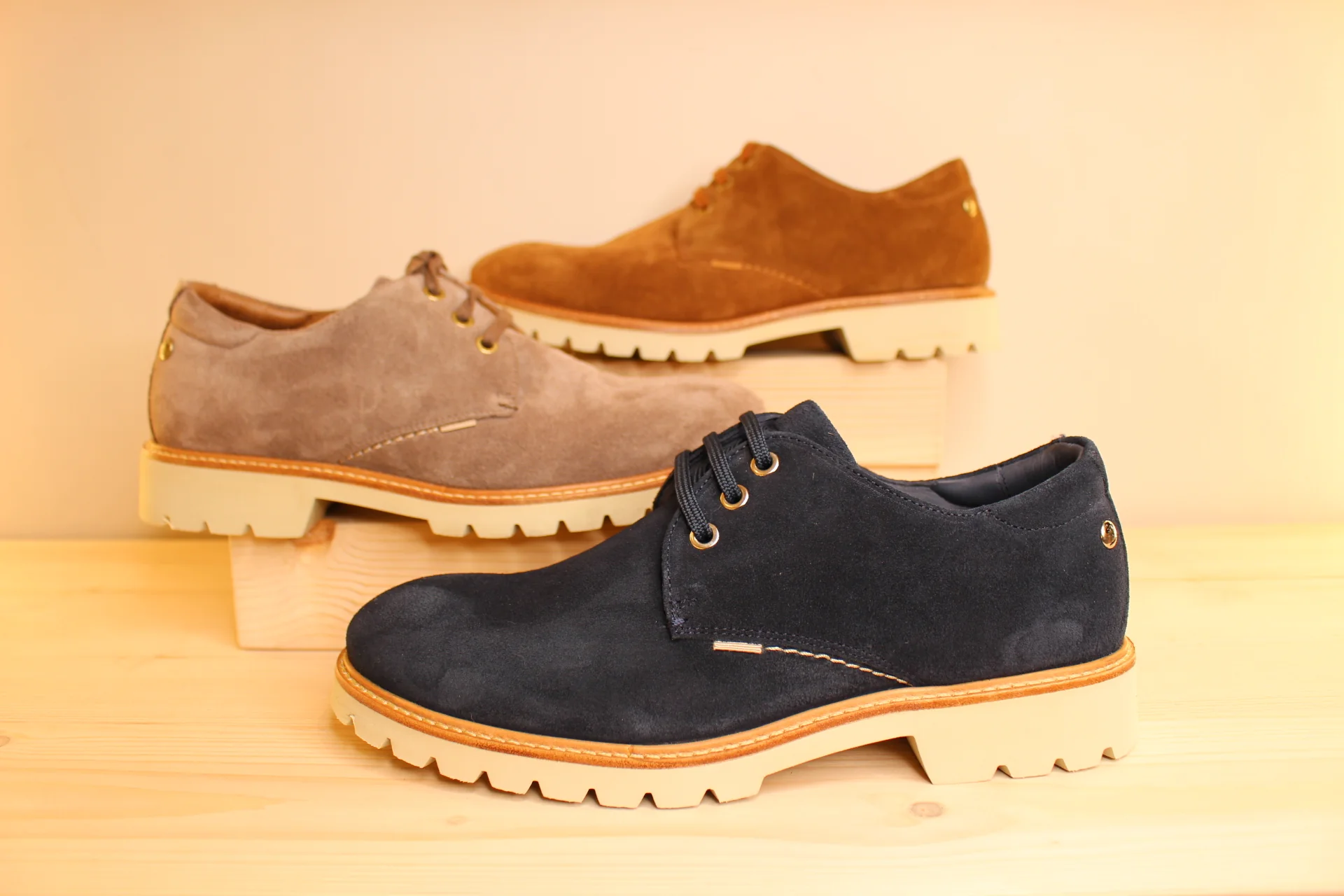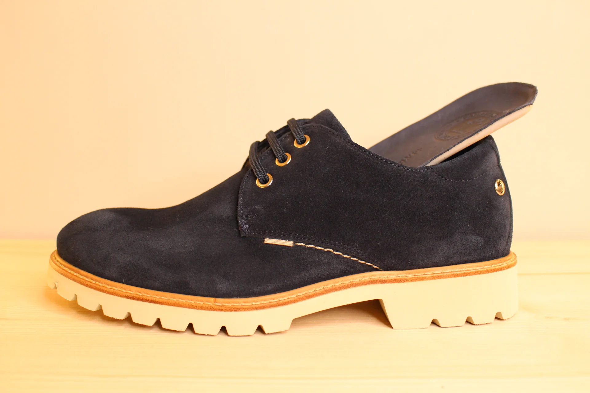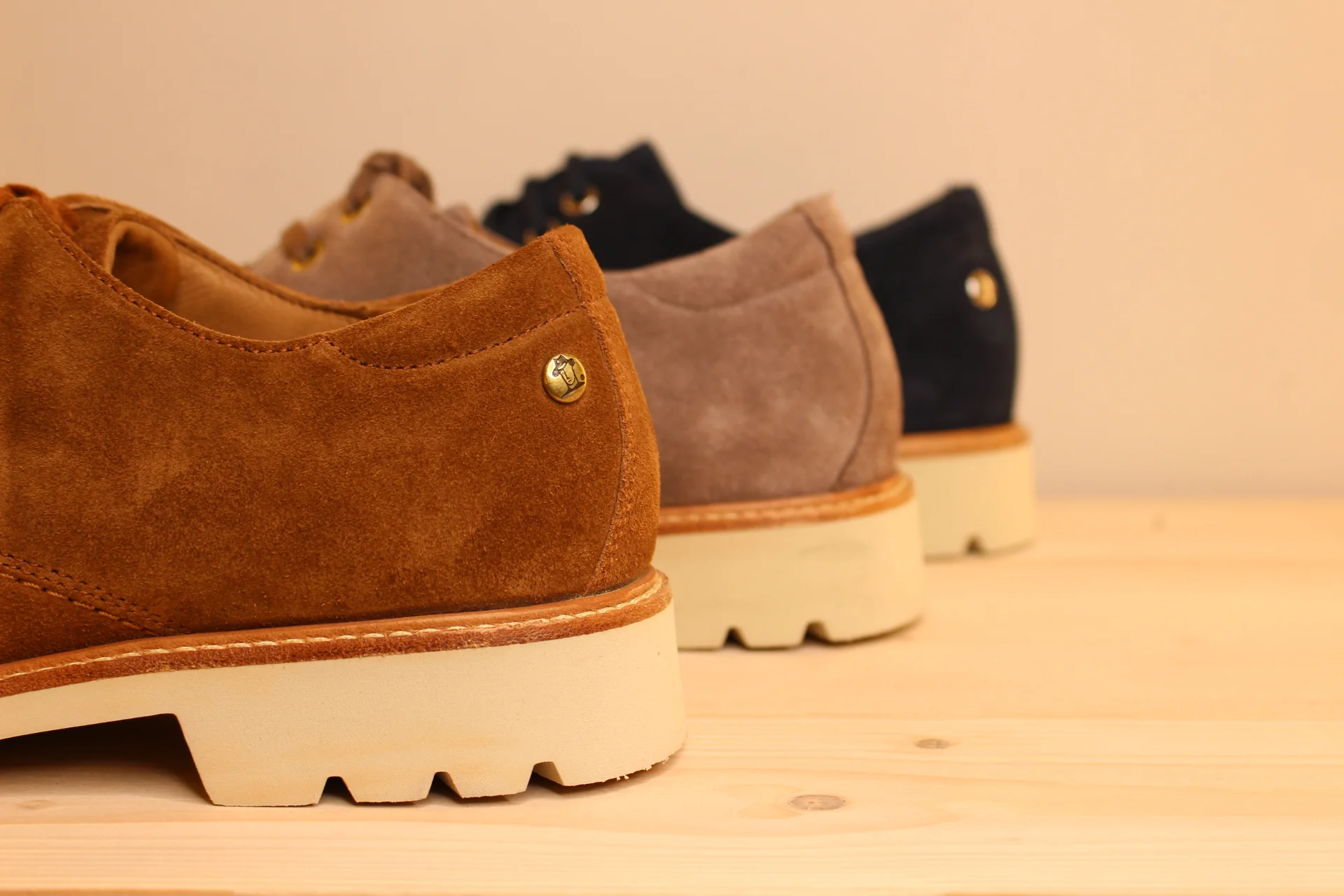 Chaussures PANAMA JACK modèle Gadner. Fabrication Espagnole. Chaussures coupe derby en cuir velours de couleur bleu, marron ou de couleur grise. Chaussures doublées cuir. Semelle intérieure amovible. Serrage laçets coton ton sur ton. Semelle extérieure épaisse de 1.5 cm, en gomme crantée de couleur beige. Cousu trépointe naturelle. Talon de 1.5 cm. Existe du 40 au 45