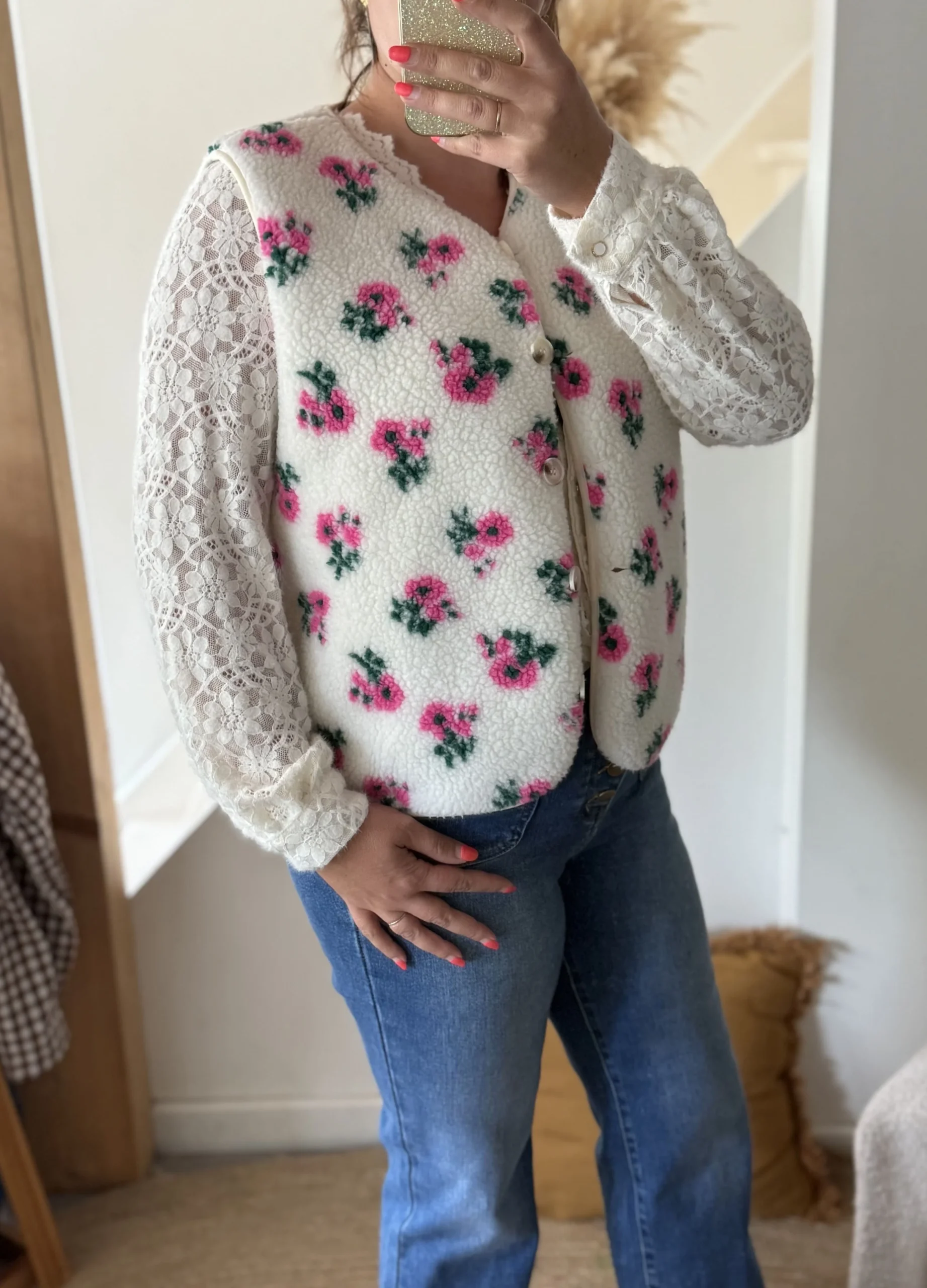 Ce gilet sans manches à motif fleuri apporte une touche de douceur et de romantisme à vos looks d’automne et d’hiver. Confectionné dans une matière effet moumoute toute douce, il allie confort et style. Son imprimé à fleurs roses et vertes sur fond écru illumine instantanément la silhouette. À porter sur une blouse en dentelle ou un sous-pull pour un look féminin et cocooning.