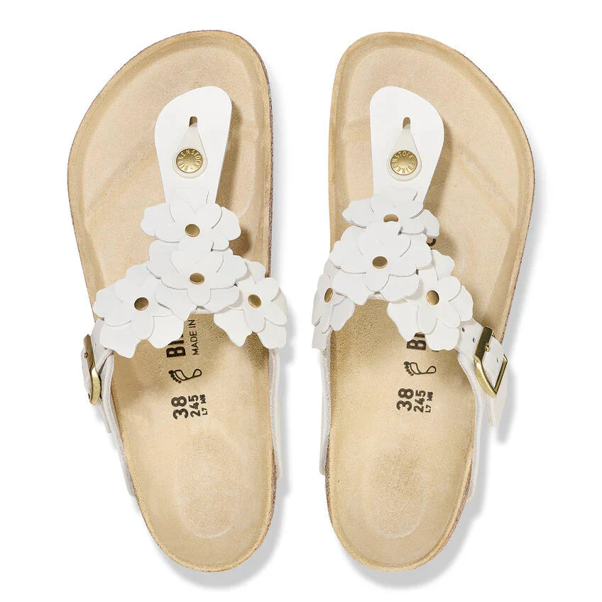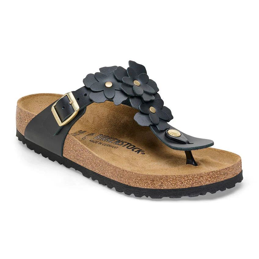 Des fleurs appliquées transforment la sandale Gizeh en véritable célébration estivale. Rehaussée de touches dorées, sa tige en cuir particulièrement doux met en valeur un décor floral raffiné. Fidèle à l’héritage BIRKENSTOCK®, ce modèle offre un confort inégalé grâce à sa semelle anatomique en liège et latex, qui s’adapte progressivement à la forme de votre pied pour un soutien sur mesure. Un style élégant, une allure délicate… et un