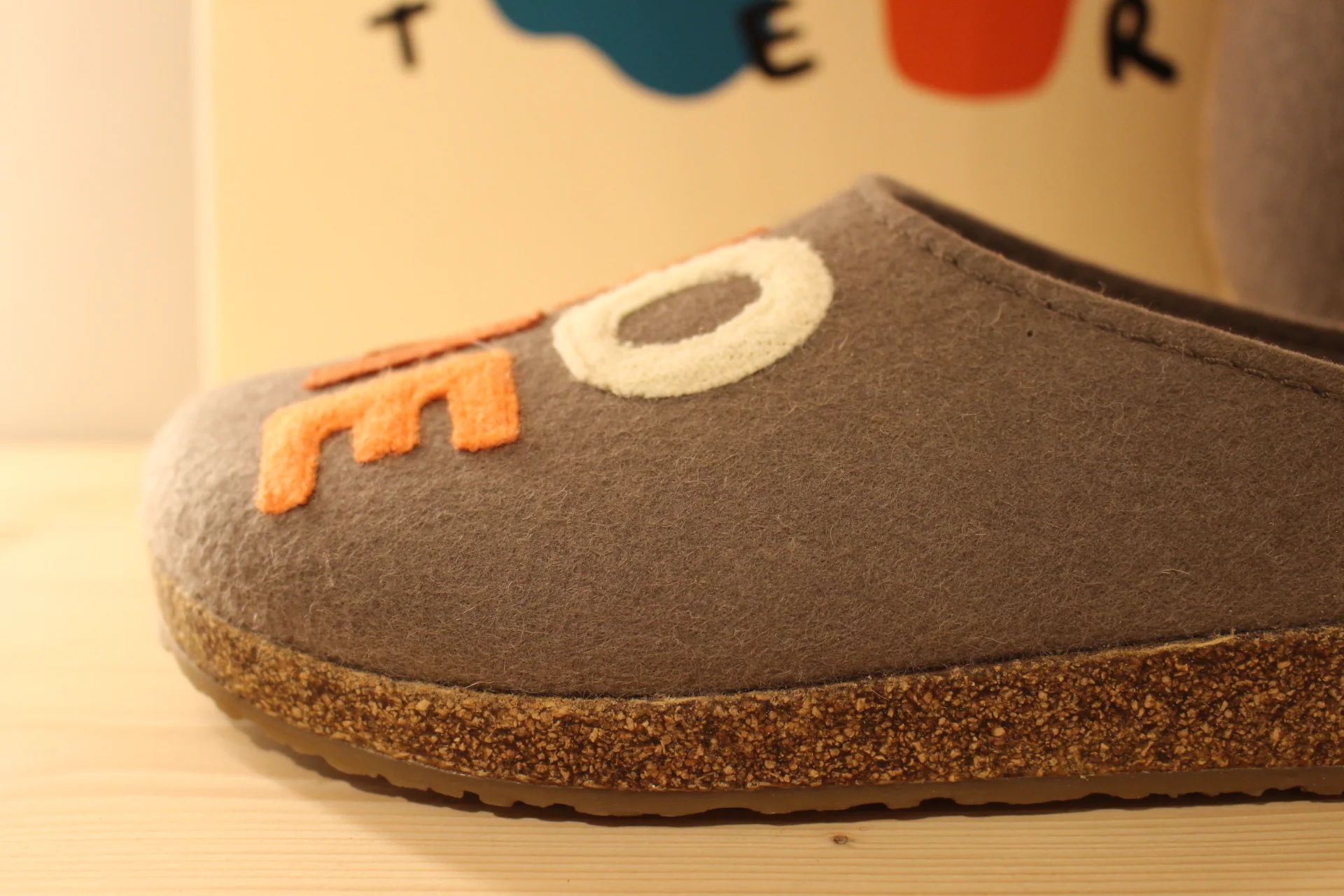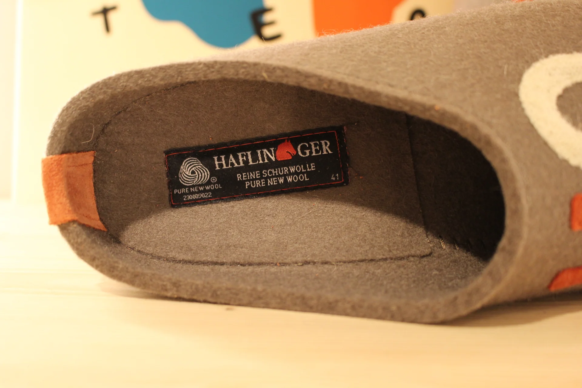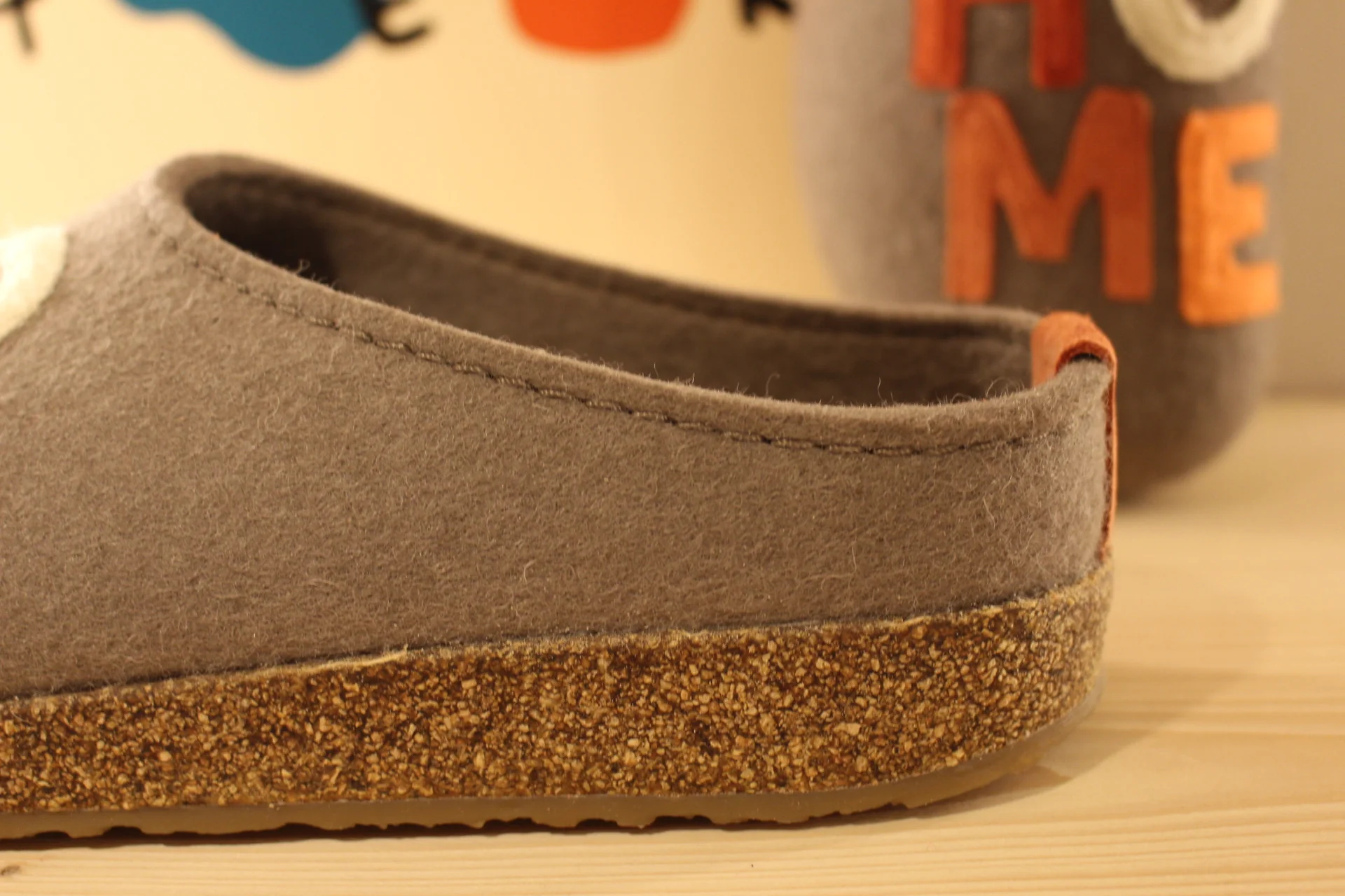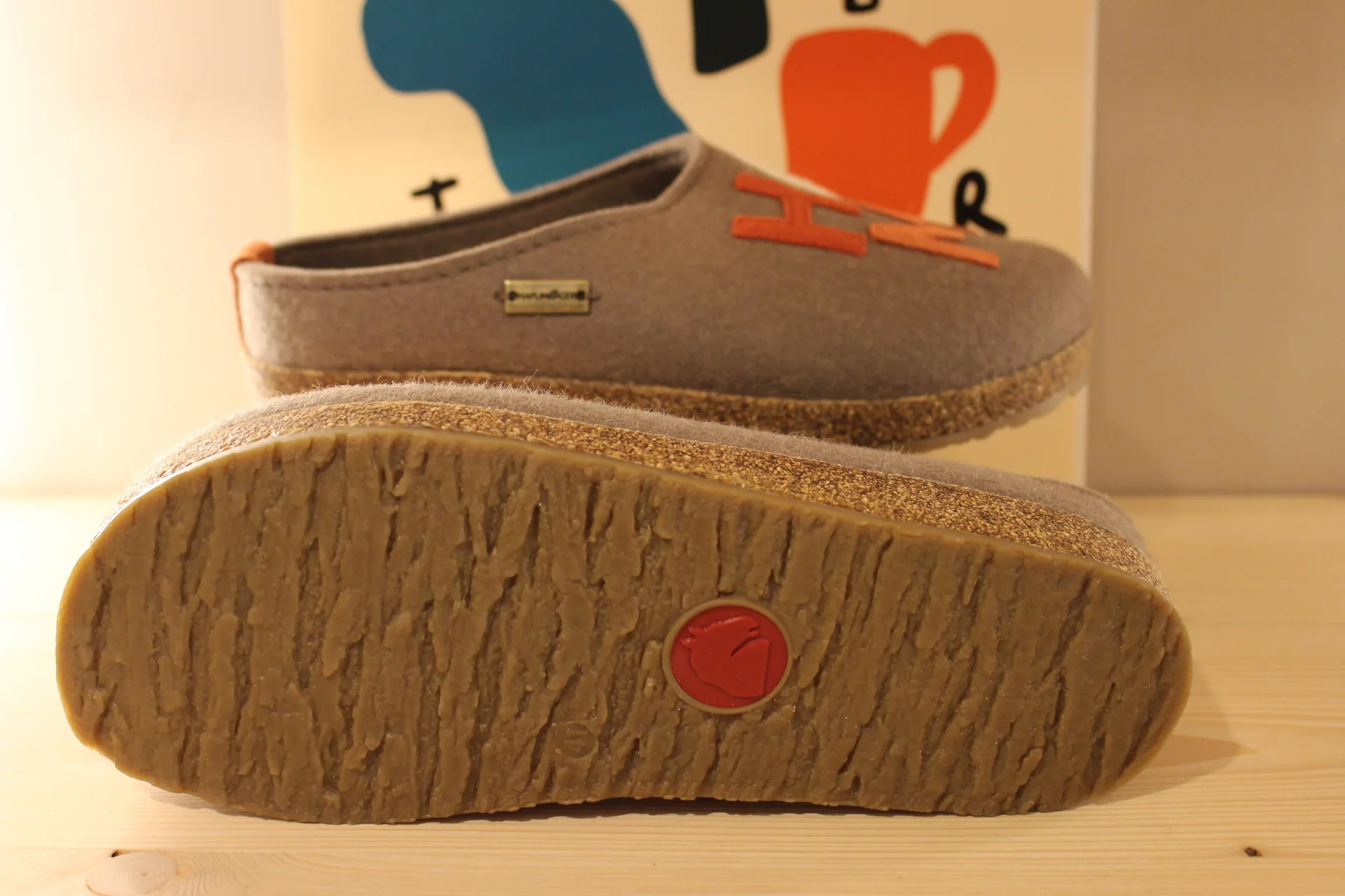 Chaussons HAFLINGER – Grizzly Home. Chaussons coupe sabot en pure laine de couleur marron clair. HOME coloré sur le pied. Retour à l’arrière assez montant pour permettre un meilleur maintien à la marche. Semelle interne en laine avec maintien de la voûte plantaire. Bloc externe montée en liège caoutchouté. Semelle externe en gomme anti-dérapante. On peut aussi marcher en extérieur !!! Il y a du répondant. Prenez une pointure de moins le chaussant est généreux.