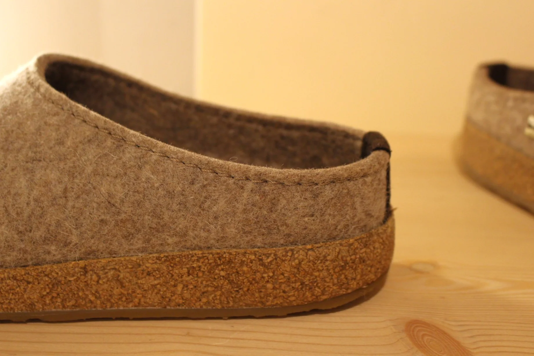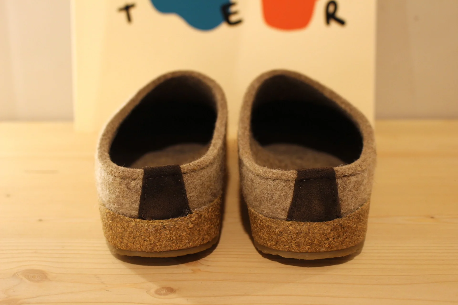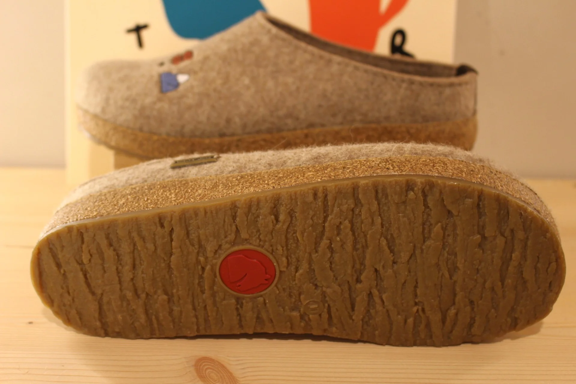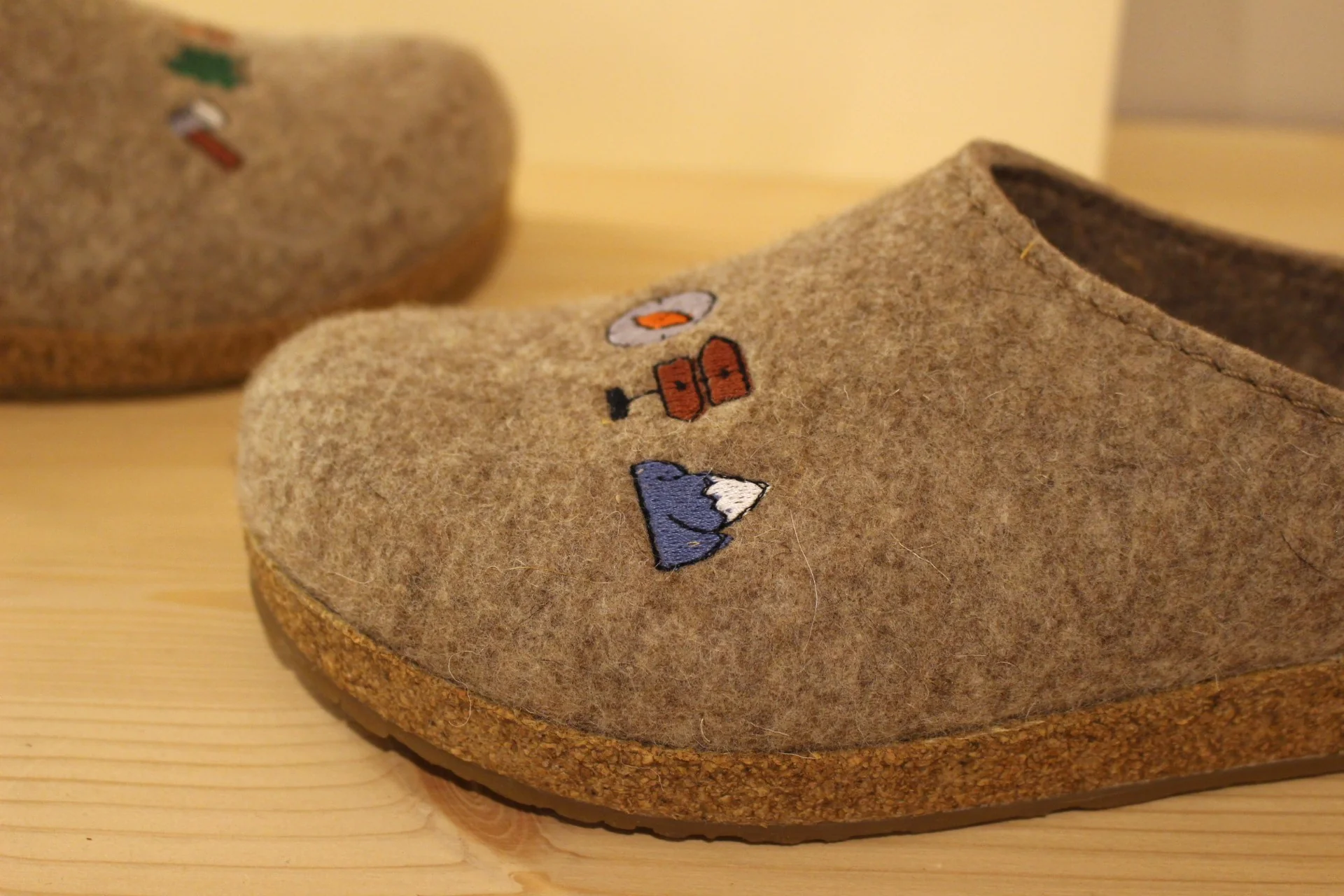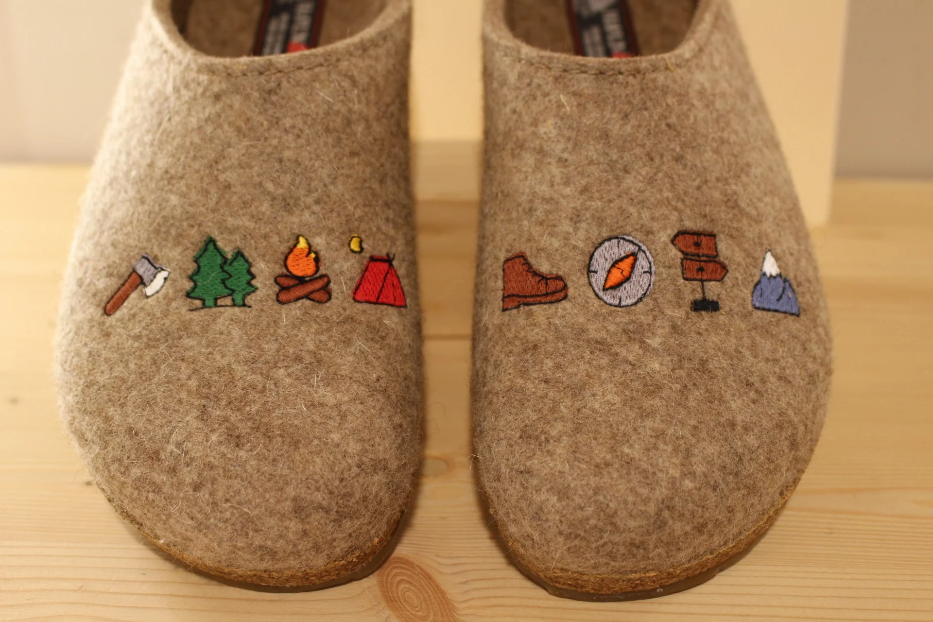 Chaussons HAFLINGER Grizzly Wanderlust. Marque allemande. Chaussons coupe sabot en pur laine de couleur taupe. Décoration brodée de motifs évoquant la montagne et la randonnée. Retour à l’arrière assez montant pour permettre un meilleur maintien à la marche. Semelle interne en laine avec maintien de la voûte plantaire. Bloc externe montée en liège caoutchouté. Semelle externe en gomme anti-dérapante. On peut aussi marcher en extérieur !!! Il y a du répondant. Prenez une pointure de moins le chaussant est généreux.