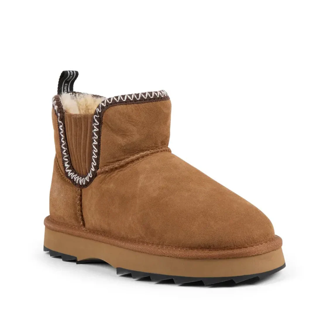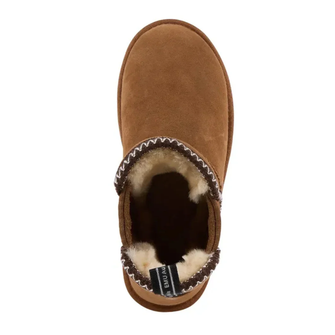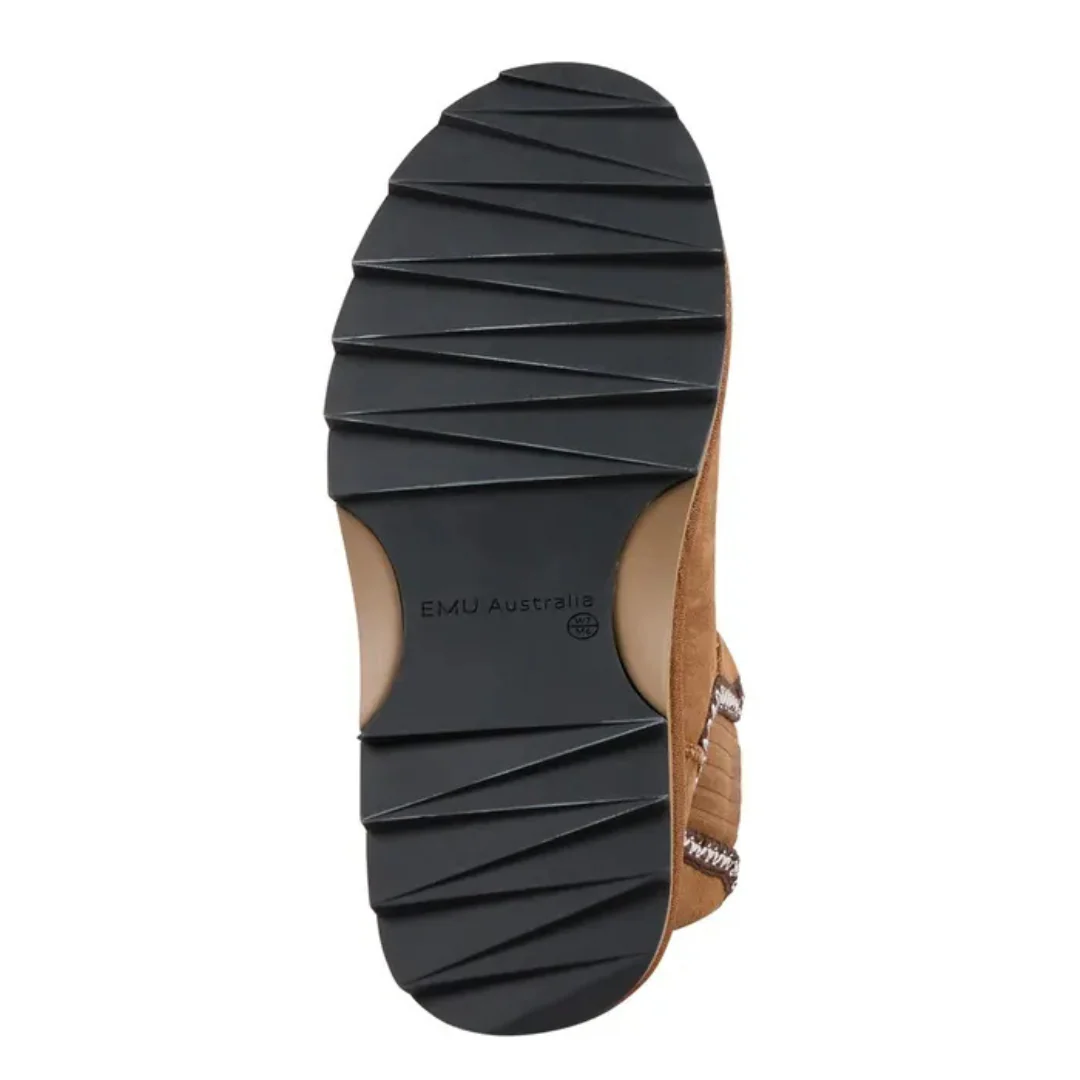 Ne vous fiez pas à sa taille : cette petite botte a tout d’une grande. Avec ses broderies inspirées de l’art aztèque, sa peau de mouton australienne hydrofuge et sa semelle Sharky épaisse, elle combine confort, style et audace. La coupe micro apporte une touche moderne, la languette arrière facilite l’enfilage, et l’ensemble respire l’attitude EMU. Résultat : une botte à la fois douillette, durable et pleine de caractère.