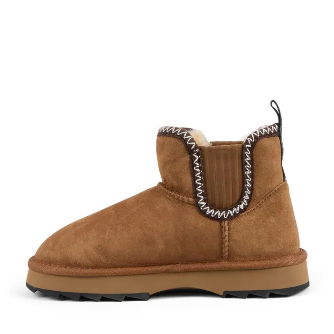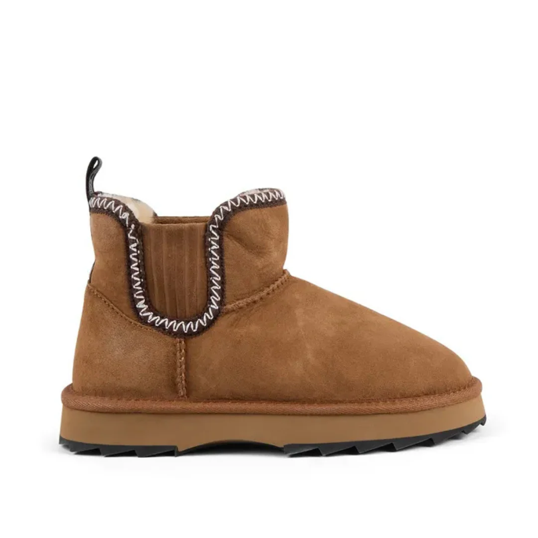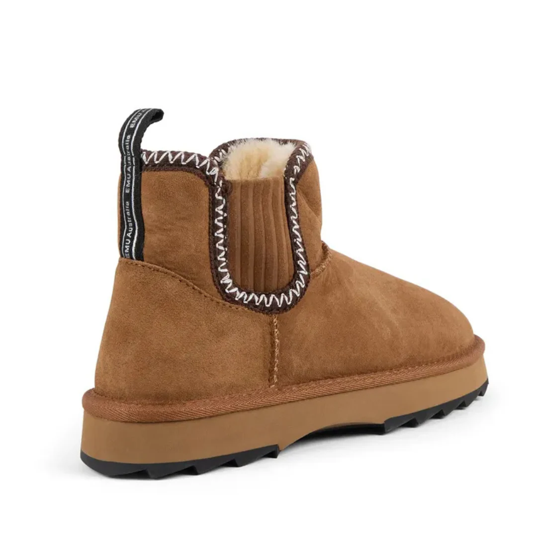 Ne vous fiez pas à sa taille : cette petite botte a tout d’une grande. Avec ses broderies inspirées de l’art aztèque, sa peau de mouton australienne hydrofuge et sa semelle Sharky épaisse, elle combine confort, style et audace. La coupe micro apporte une touche moderne, la languette arrière facilite l’enfilage, et l’ensemble respire l’attitude EMU. Résultat : une botte à la fois douillette, durable et pleine de caractère.