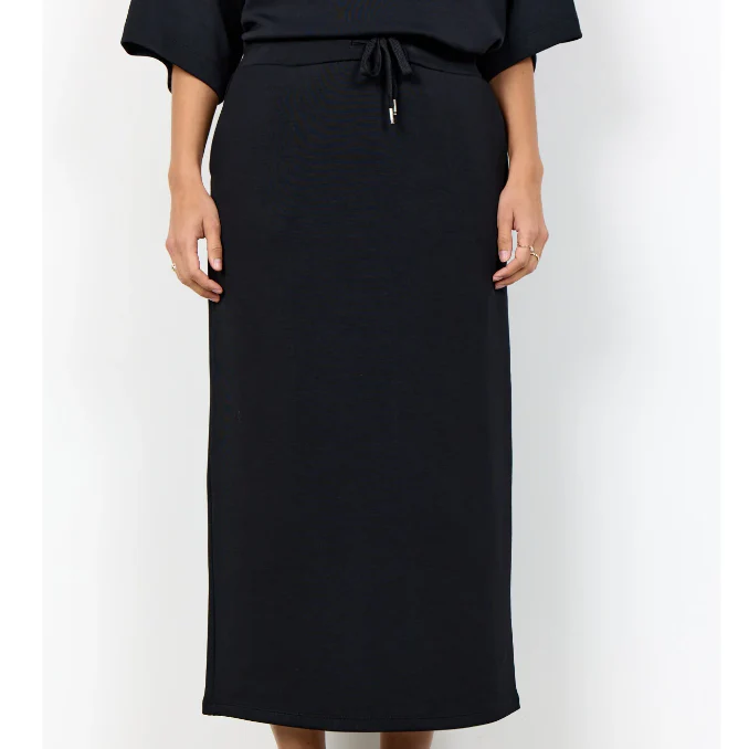 cette jupe fabriquée à partir de 48 % de modal, 48 % de polyester, 4 % d’élastane. Cette jupe élégante présente une coupe droite avec une taille à cordon pour une coupe ajustable.