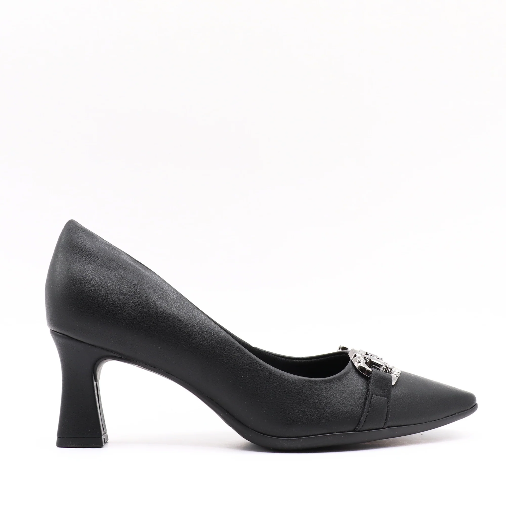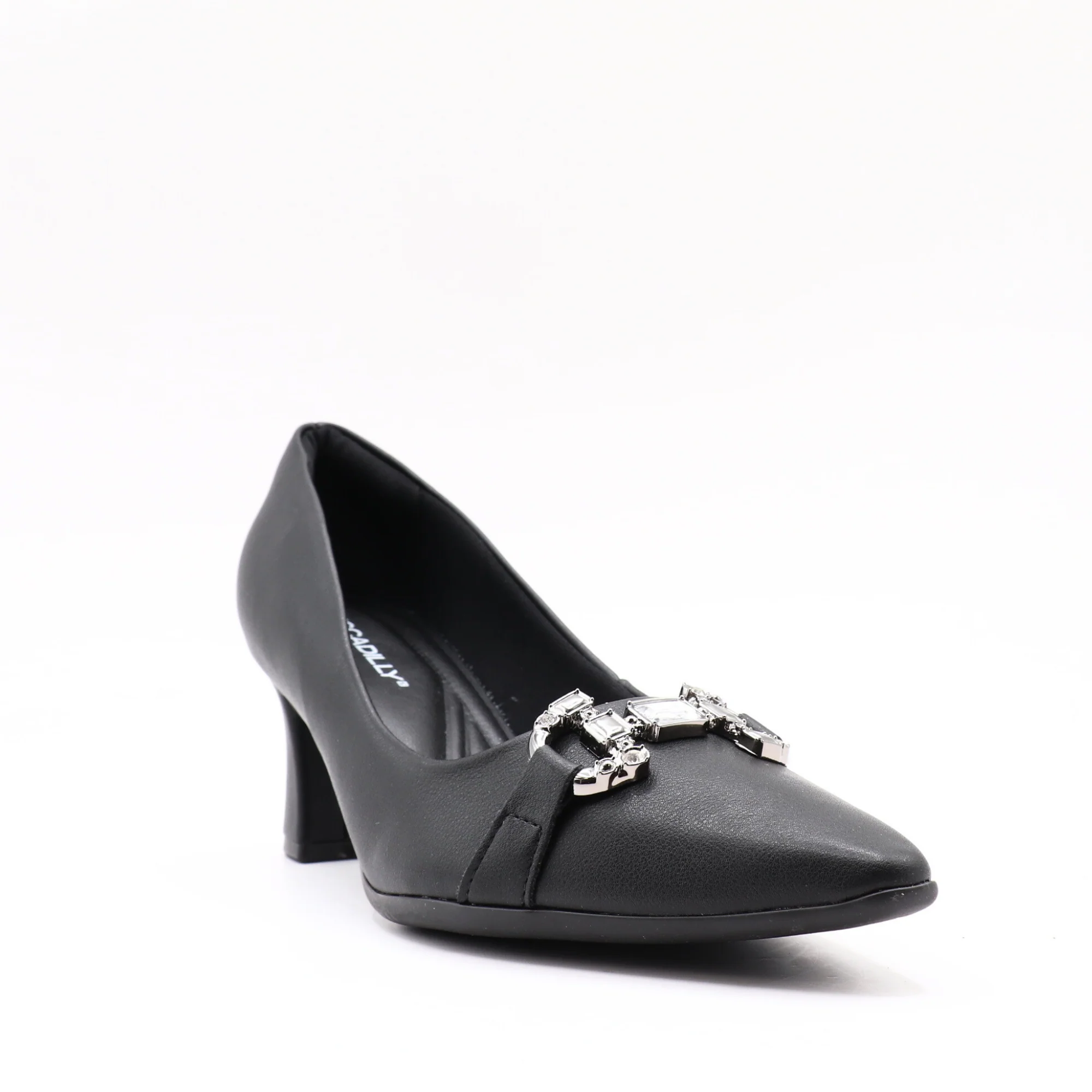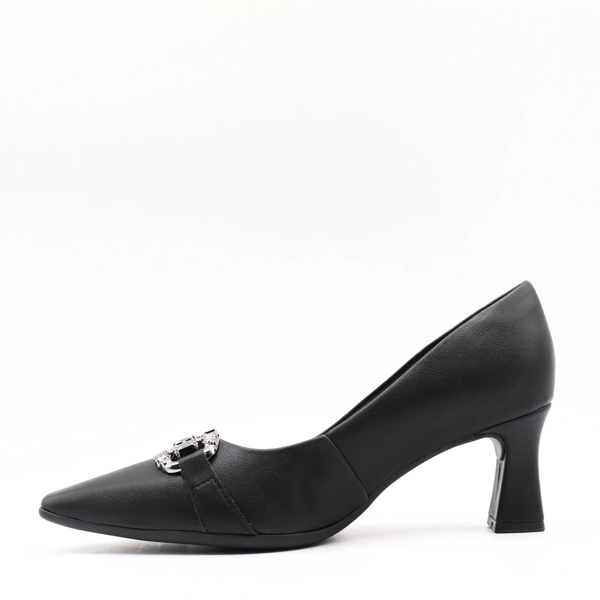 Un escarpin raffiné qui conjugue élégance et confort. Conçu en matière synthétique, il séduit par son bout pointu et son ornement métallique sophistiqué à l’avant, qui ajoute une touche chic. Son talon fin et stable offre une silhouette élancée, parfaite pour les occasions spéciales comme pour une tenue professionnelle élégante.