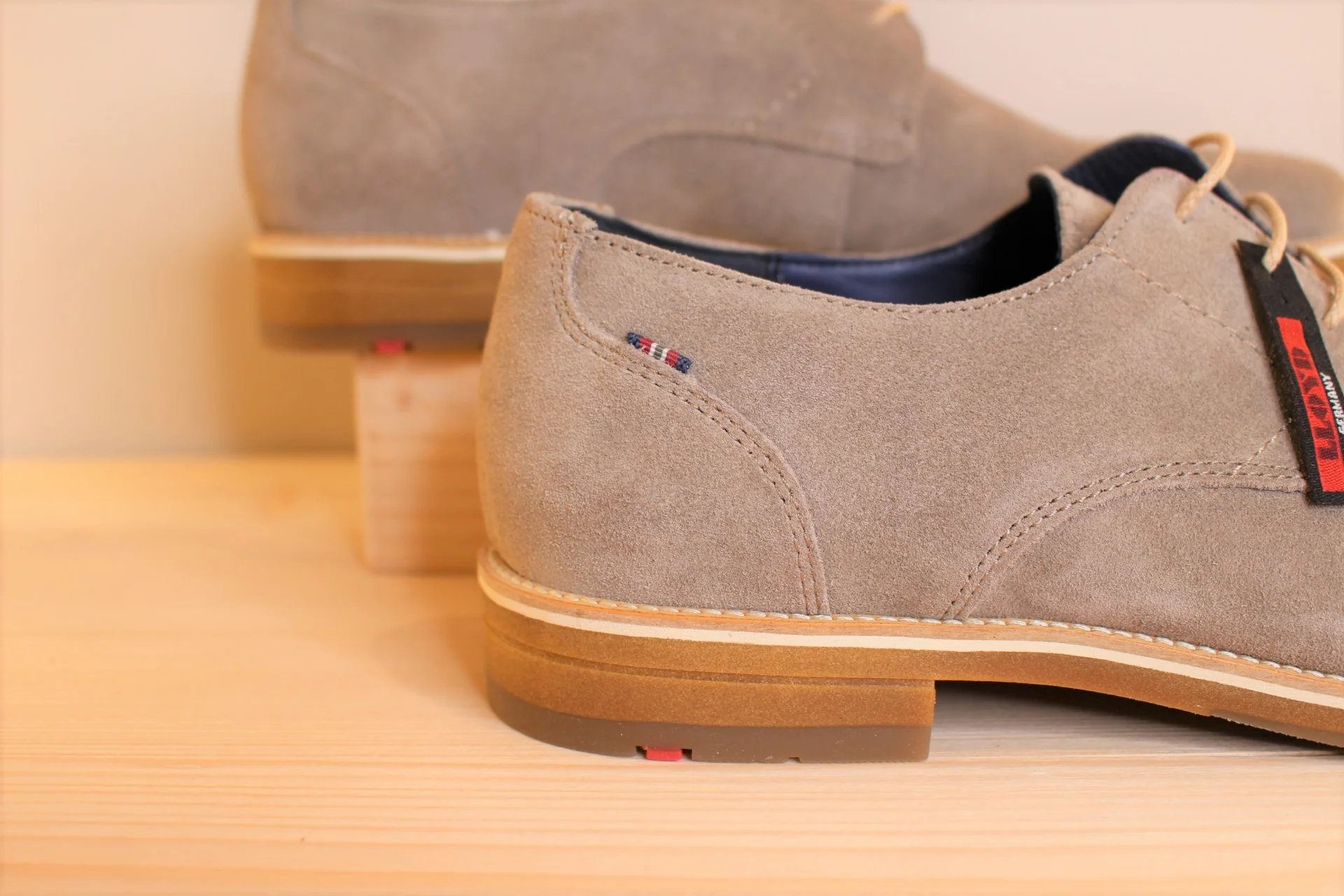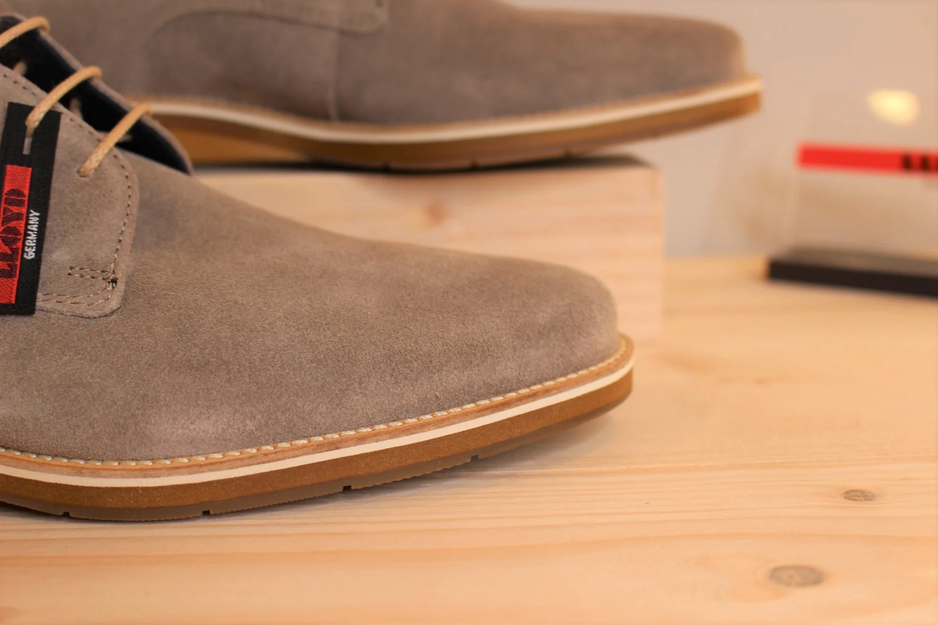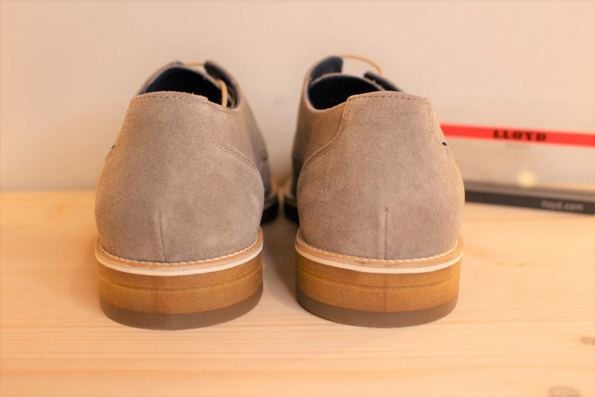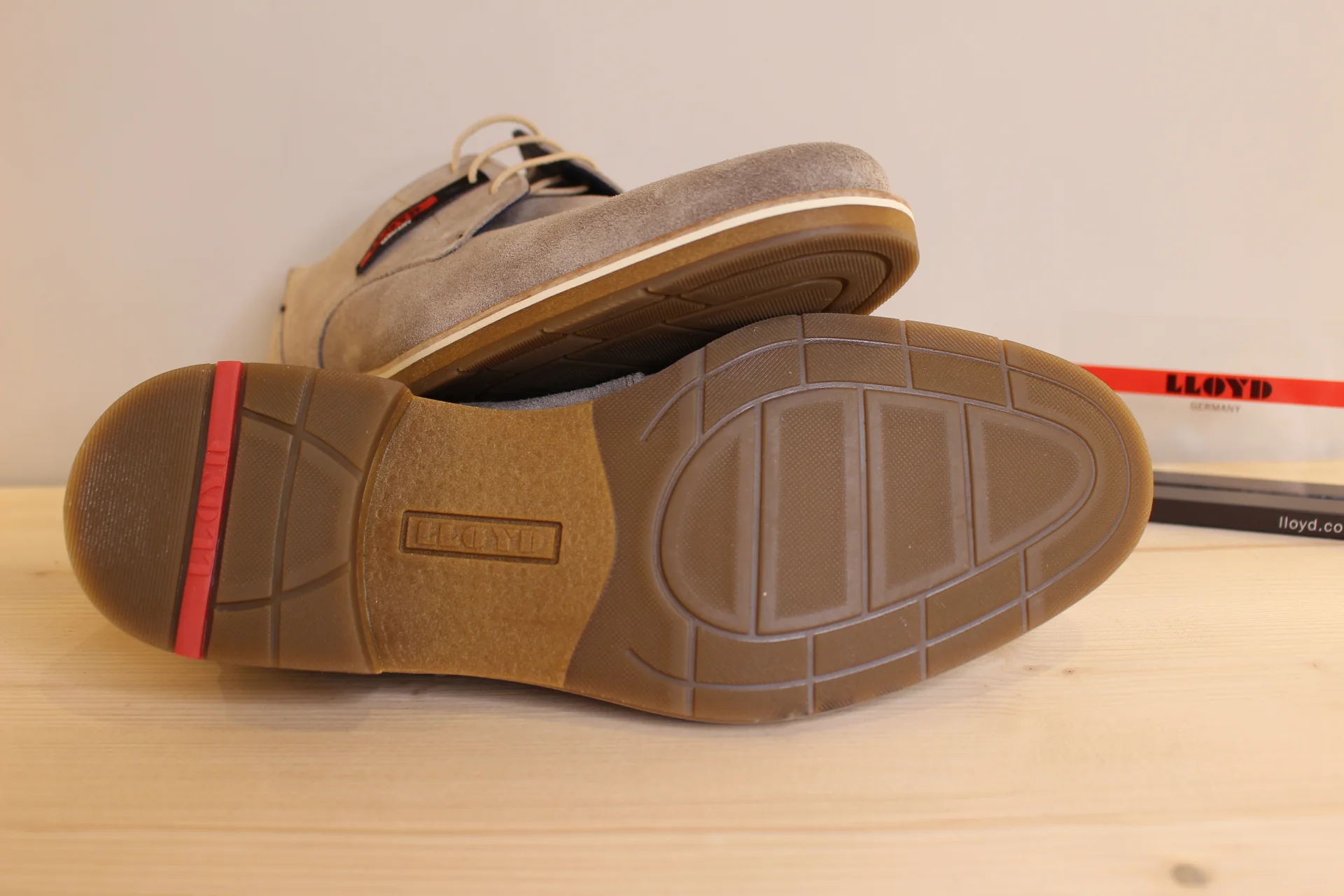 Chaussures LLOYD modèle Lass. Chaussures en cuir velours de couleur stone (gris). Chaussures doublées cuir. Lacets coton beige. Amorti au niveau du talon. Semelle extérieure en gomme épaisse de 2.5 cm. Talon de 1 cm. Couture trépointe. Existe du 6.5 au 9.5. Une chaussure très légère, élégante et facile à associer.