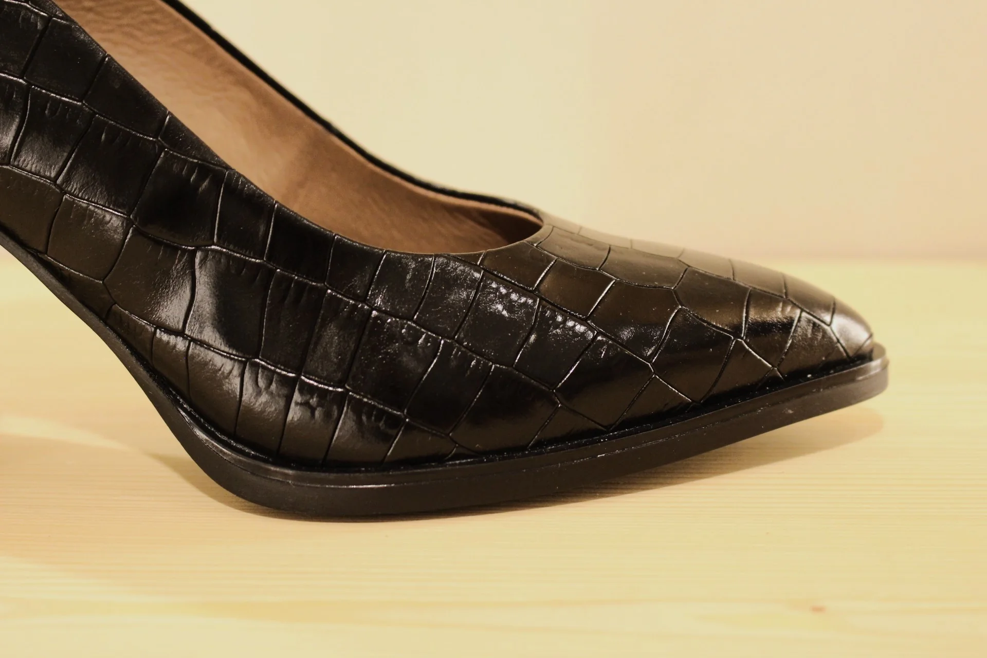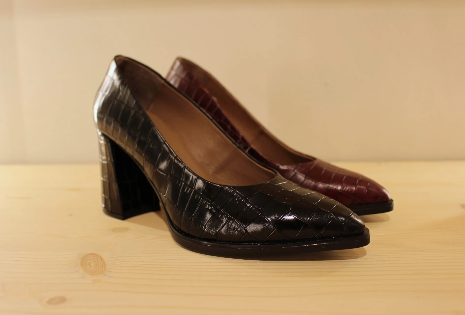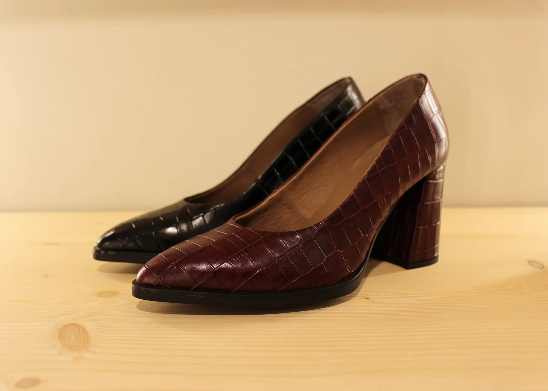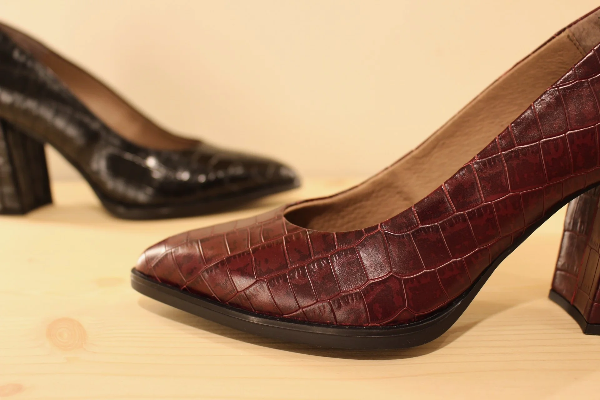 Chaussures WONDERS M-5420. Fabrication espagnole. Escarpins en cuir imprimé croco, de couleur noir ou en cuir légèrement tacheté de couleur bordeaux. Chaussures doublées cuir et semelle interne à mémoire de forme. Semelle externe en gomme adhérente de 1 cm. Talon enrobé ton sur ton de 7 cm. Une ligne qui a du tempérament ..