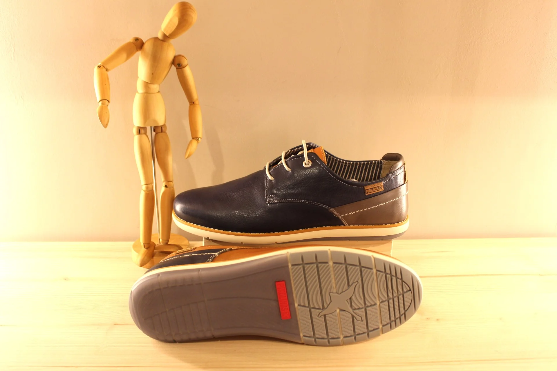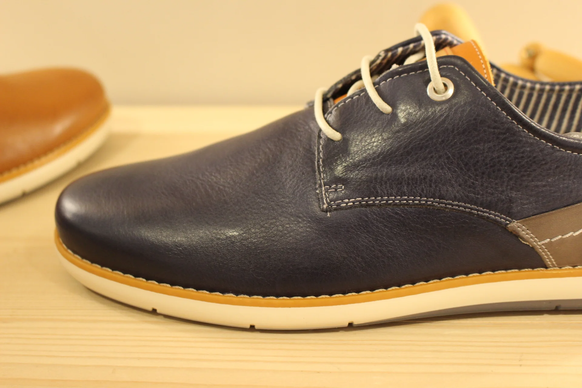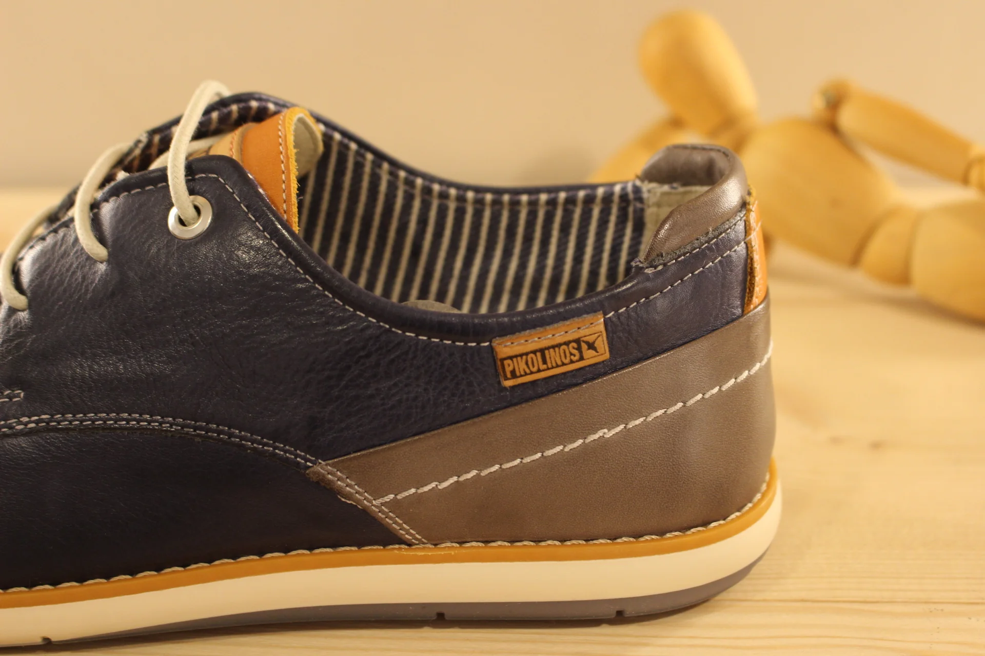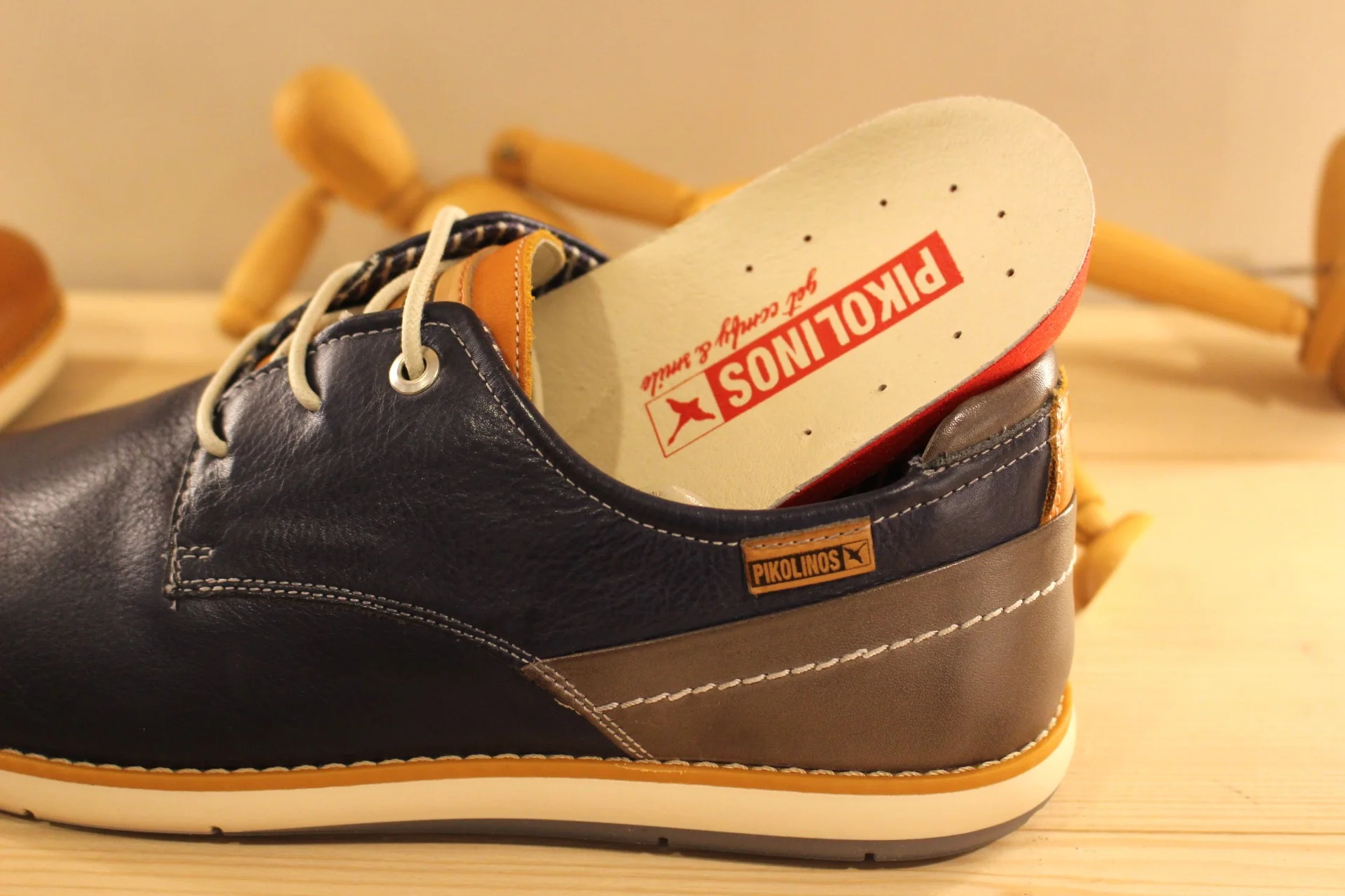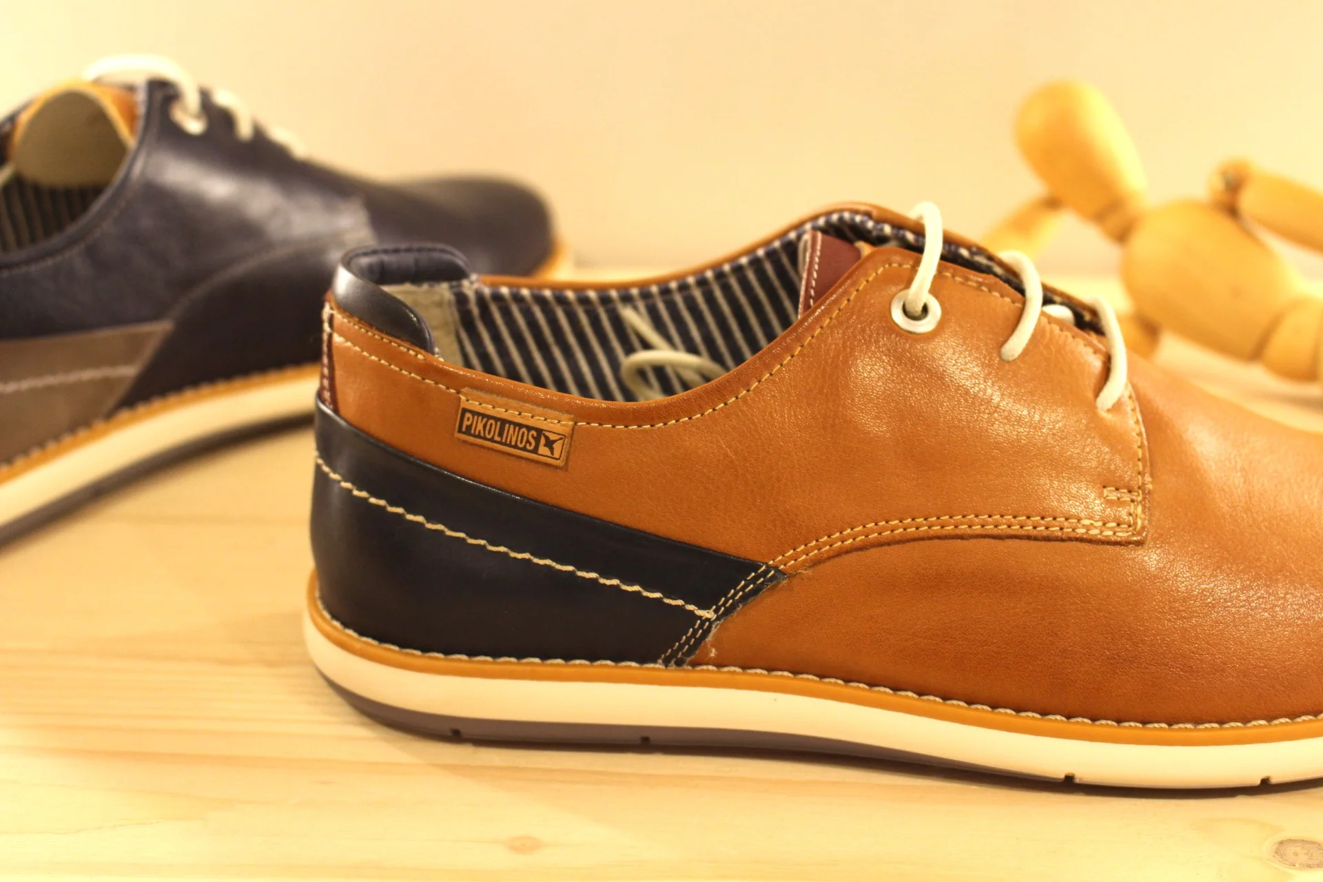 Chaussures PIKOLINOS – M4E-4104. Chaussures coupe derby en cuir de couleur brandy avec une touche de bleu et de bordeaux. Ou de couleur bleu avec une touche de orange et de gris. Chaussures doublées cuir et textile. Serrage lacets coton blanc. Semelle interne cuir et amovible. Semelle externe en gomme de 2 cm, avec un liseret beige. Talon de 0.5 cm. Aspect couture trépointe. Prêt pour tous les quotidiens. Un joli sport-chic ! Chaussures très légères.