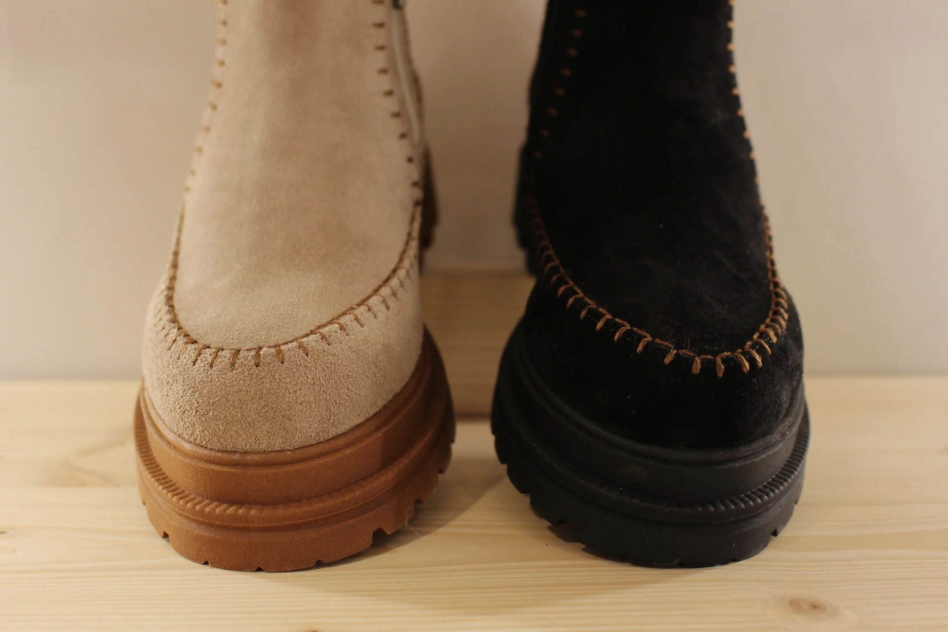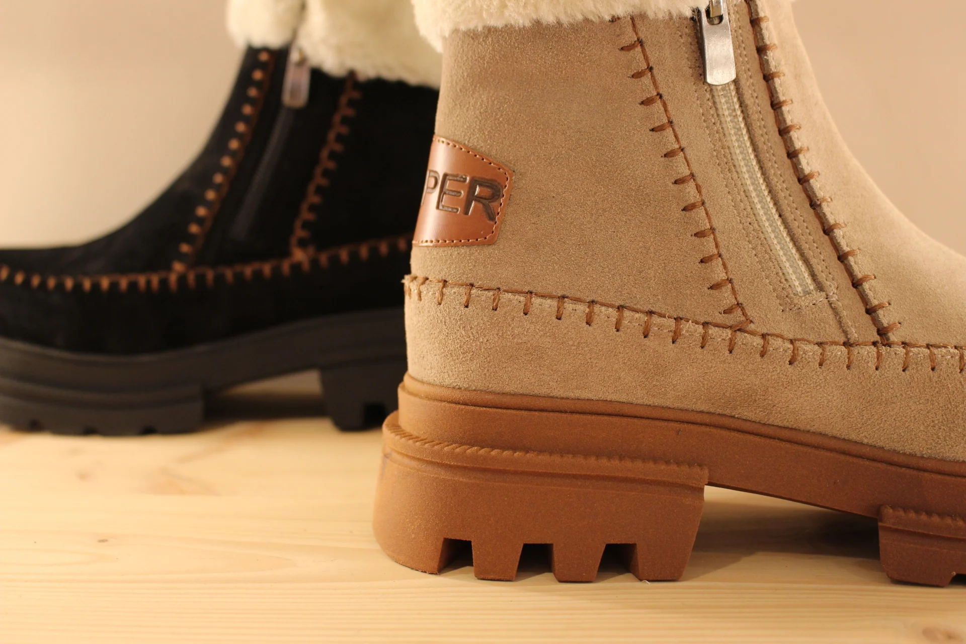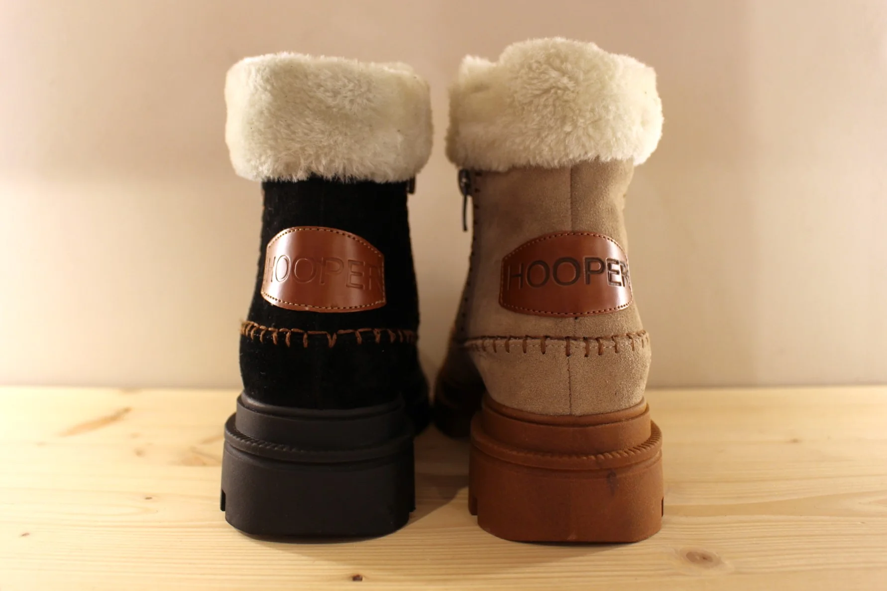 Bottines HOOPER Melen. Bottines en velours de couleur noir ou de couleur beige. Contour de tige aspect laine. Bottines doublées chaud. Deux zips latéraux. Hauteur de la tige de 14 cm. Médaillon cuir estampillé sur l’arrière. Talon de 2 cm. Semelle extérieure en gomme épaisse de 3 cm, crantée. Le jeu de la coupe et des surpiqûres sont parfaites !
