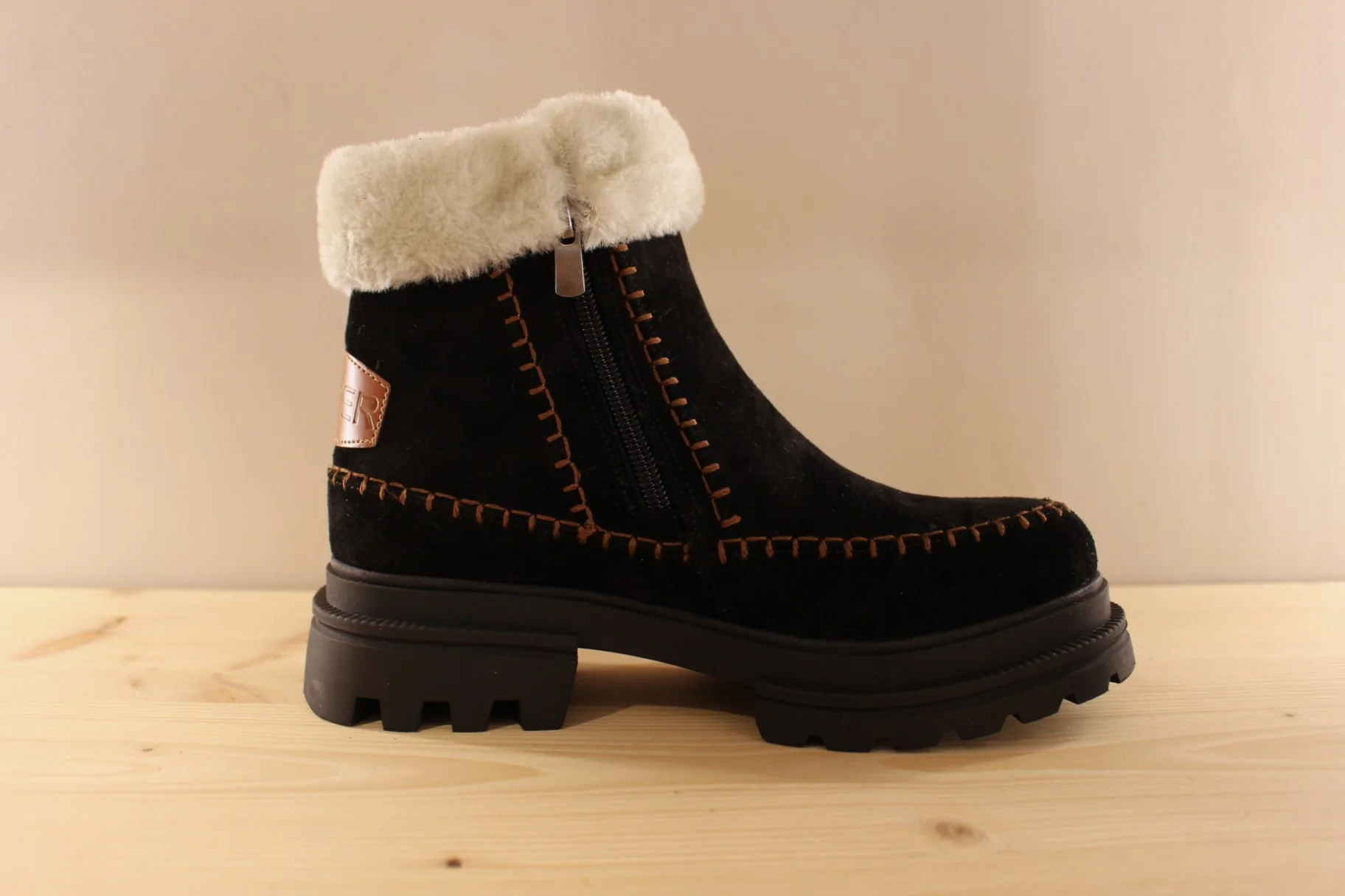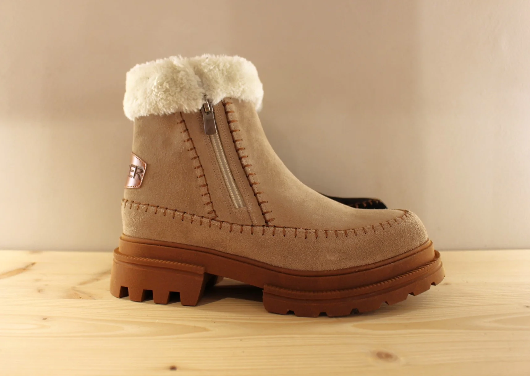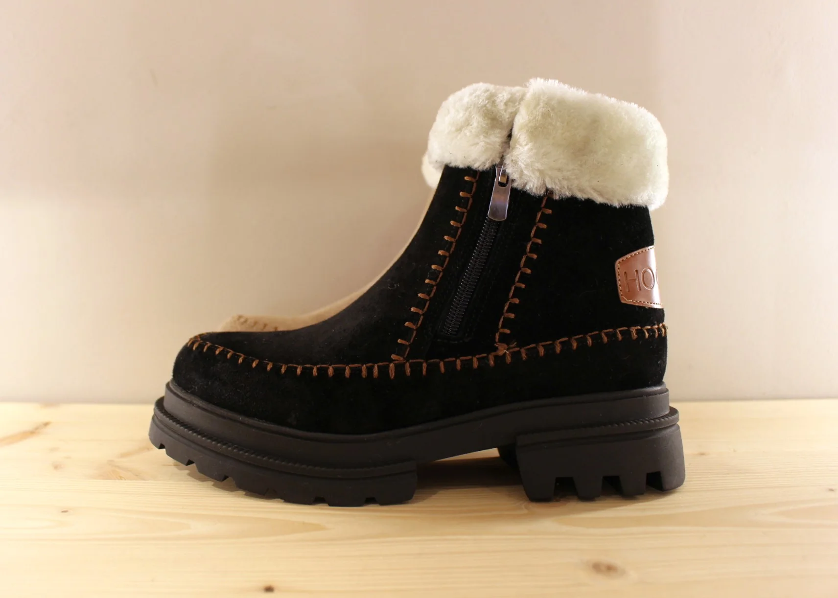Bottines HOOPER Melen. Bottines en velours de couleur noir ou de couleur beige. Contour de tige aspect laine. Bottines doublées chaud. Deux zips latéraux. Hauteur de la tige de 14 cm. Médaillon cuir estampillé sur l’arrière. Talon de 2 cm. Semelle extérieure en gomme épaisse de 3 cm, crantée. Le jeu de la coupe et des surpiqûres sont parfaites !