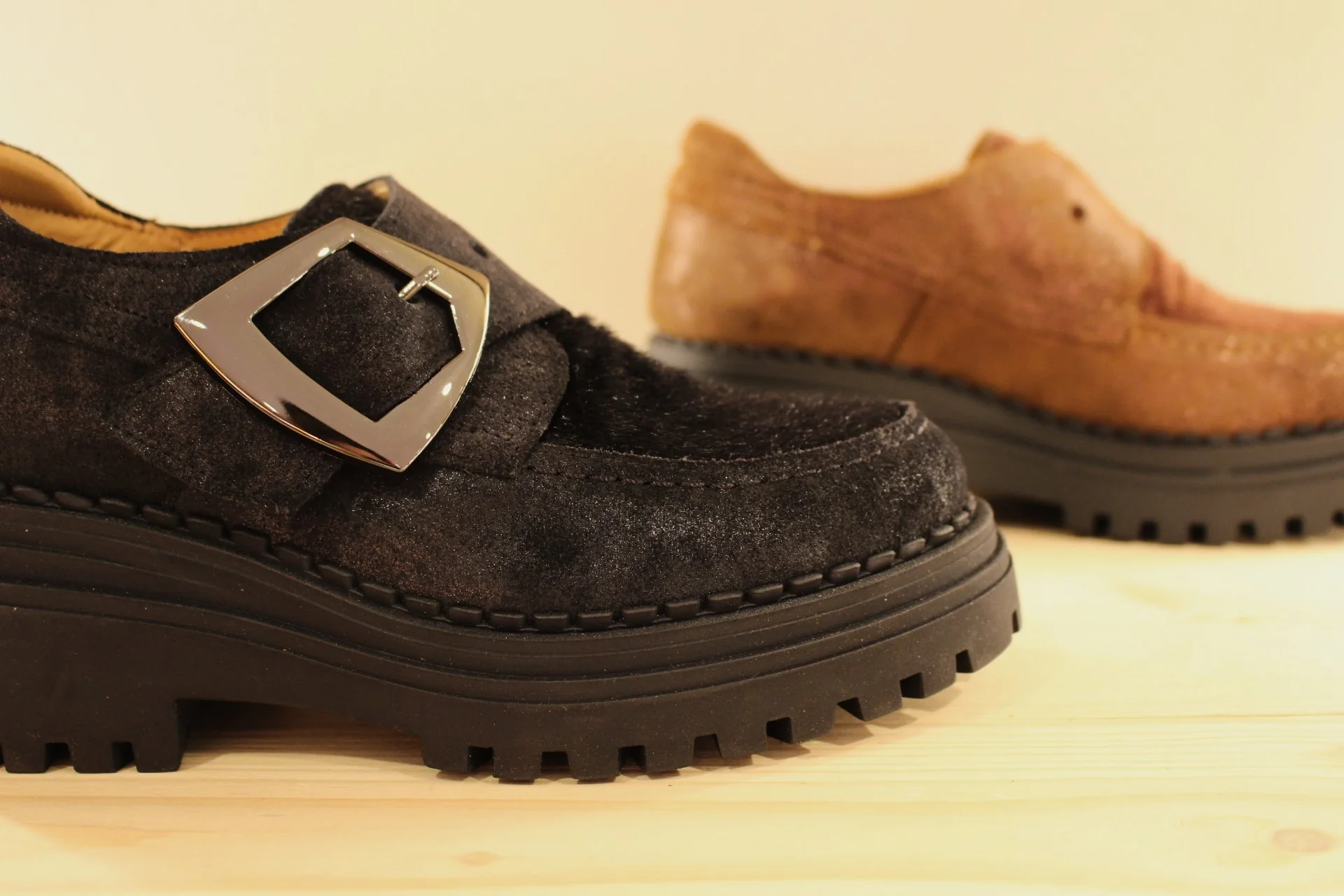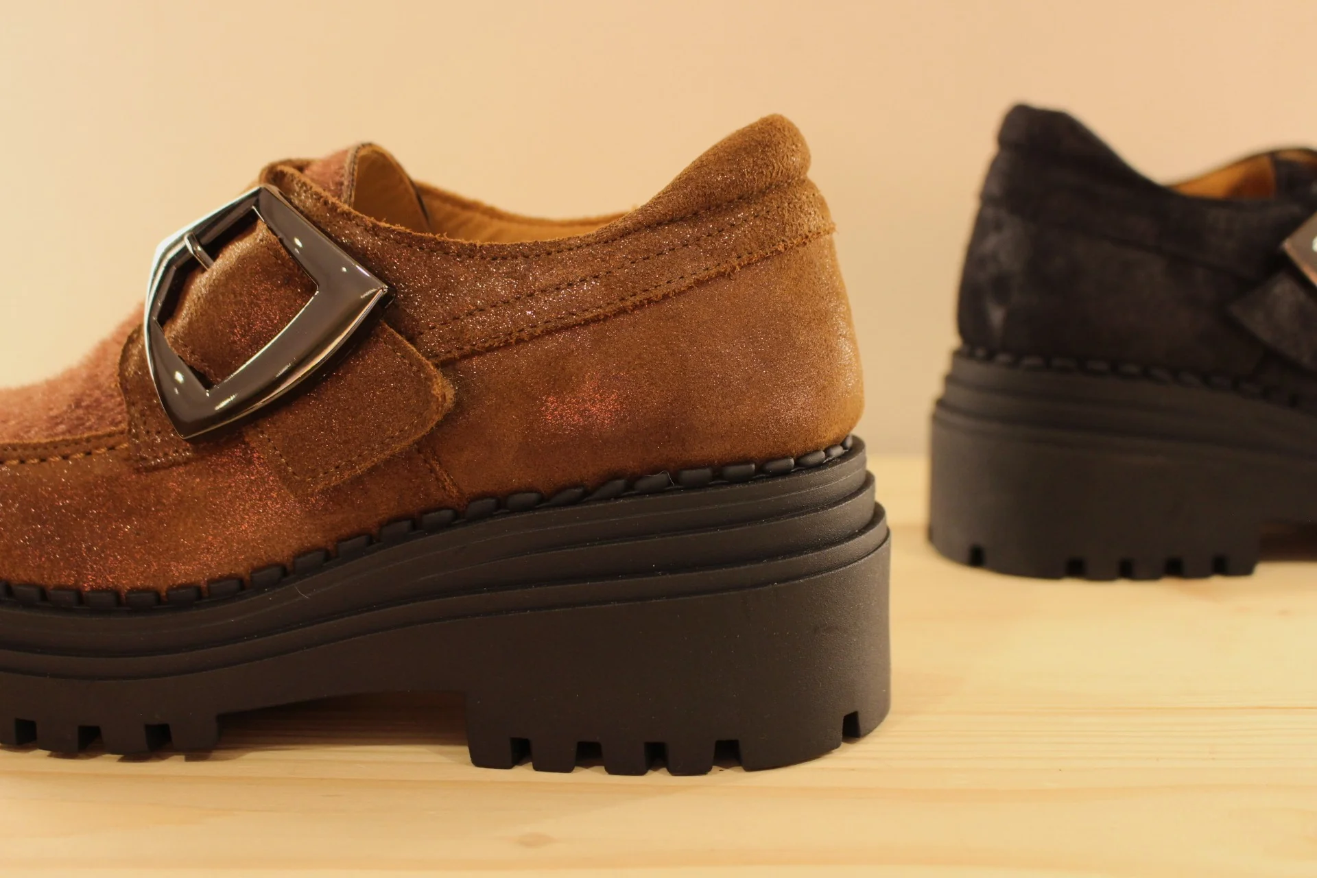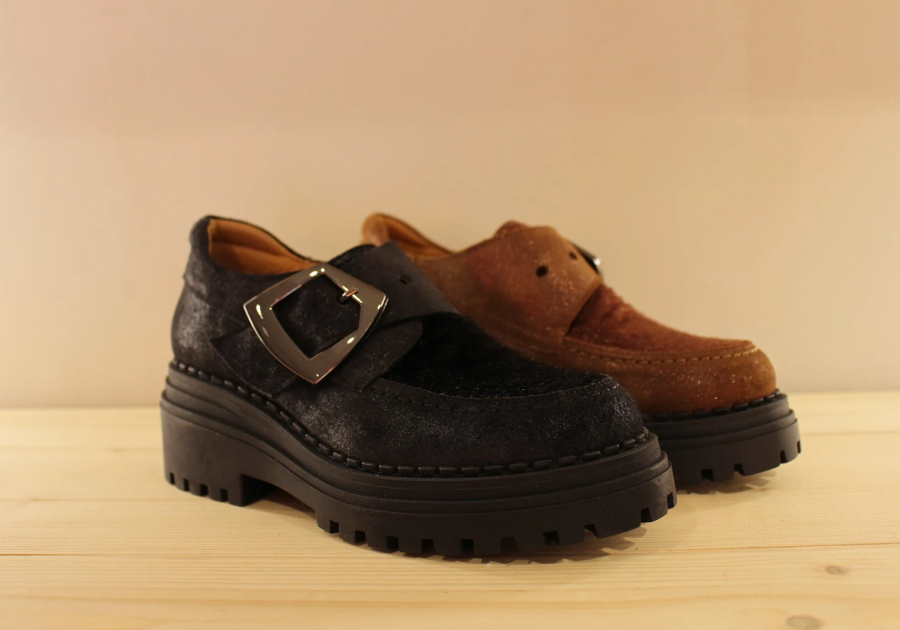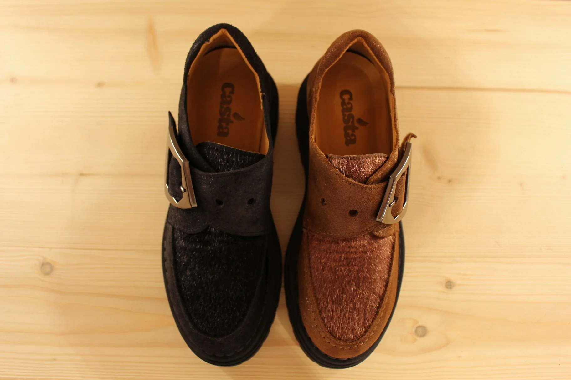 Chaussures CASTA Nyla. Fabrication Portugaise. Chaussures en cuir gras légèrement métallisé, de couleur marron ou de couleur noir. Serrage par bride coup de pied montée sur boucle. Poils sur la claque. Chaussures doublées cuir. Semelle intérieure amovible.Talon de 2.5 cm. Semelle extérieure en gomme crantée épaisse de 3 cm. J’adore son côté hivernal bien trempé sur une coupe derby !