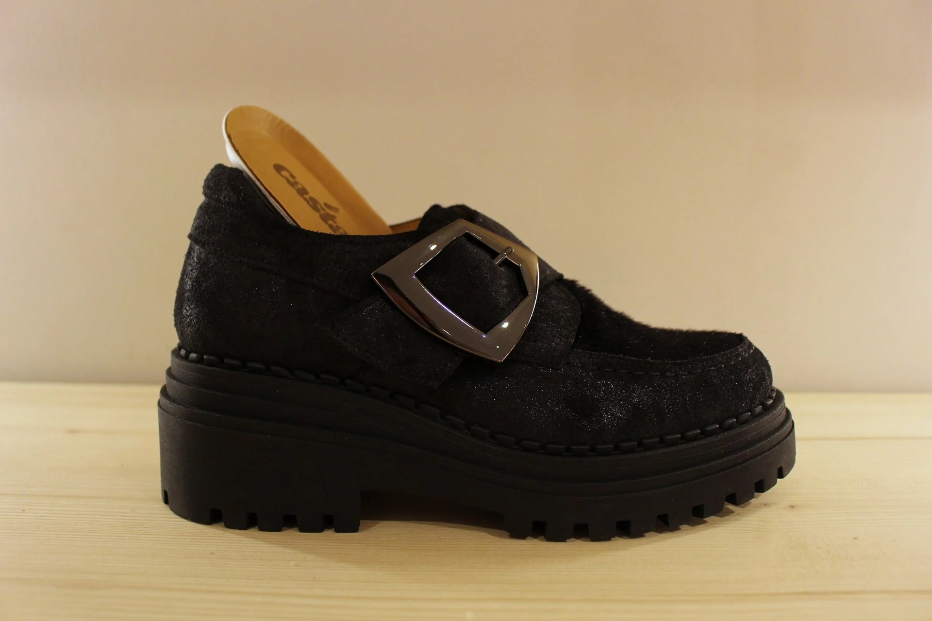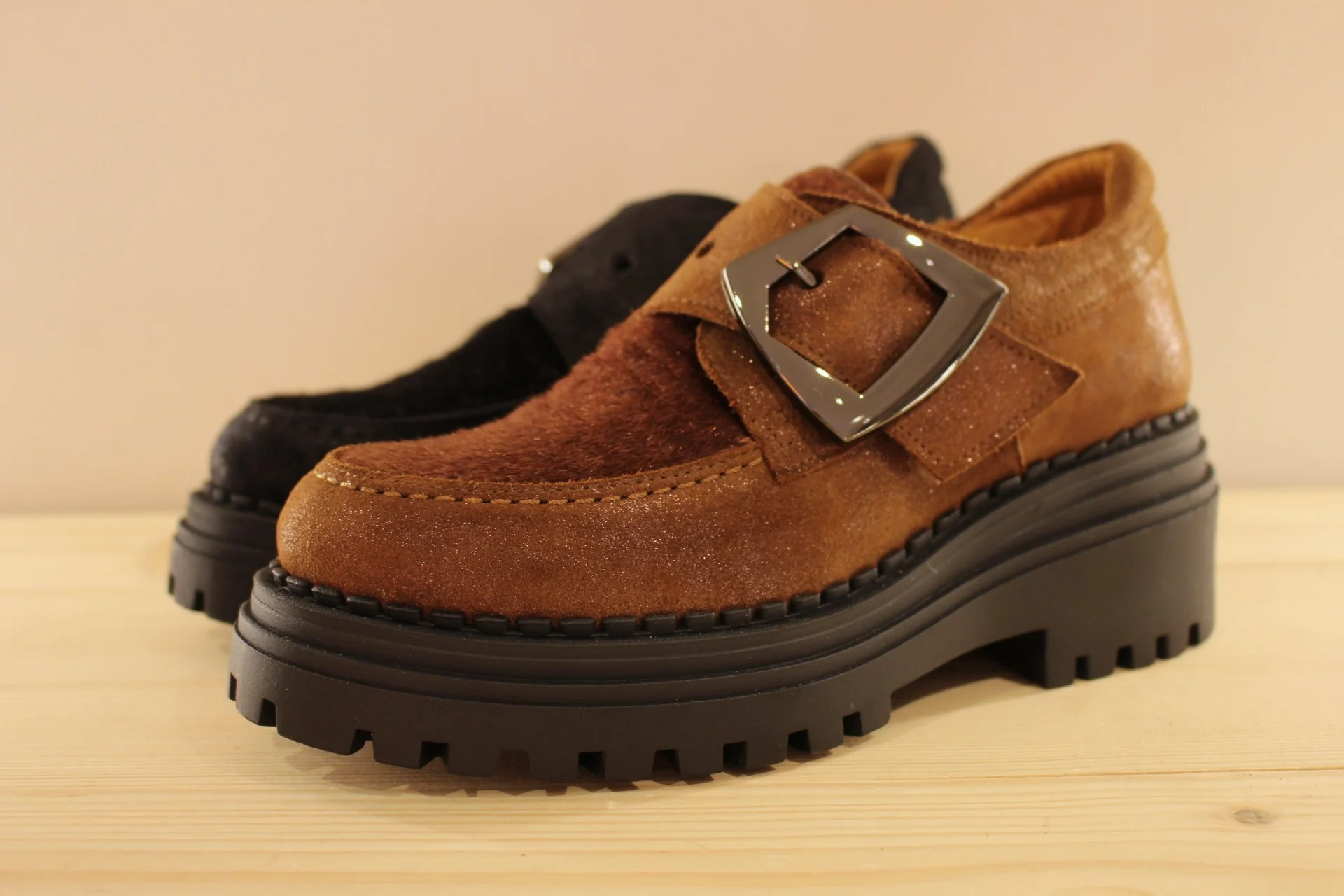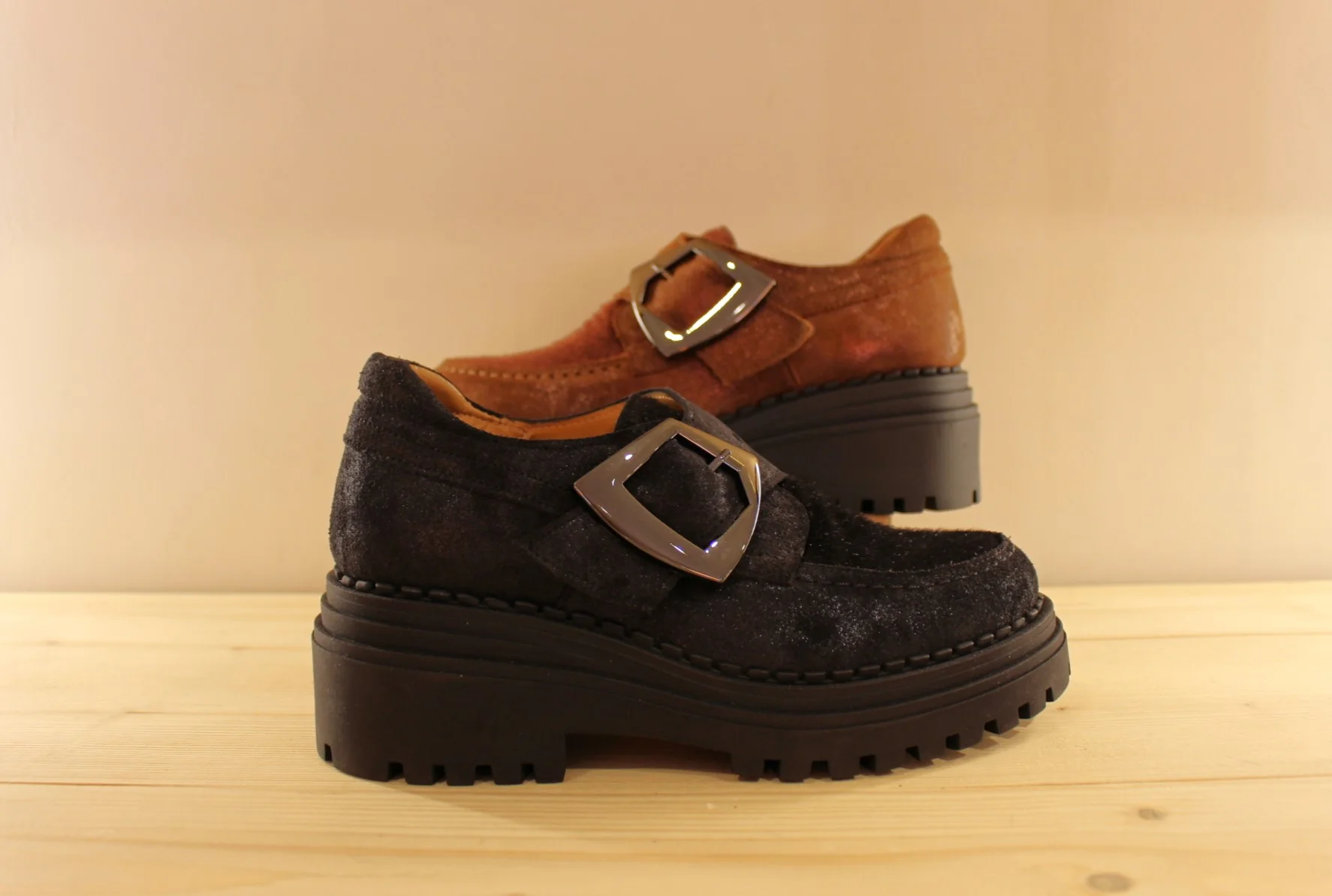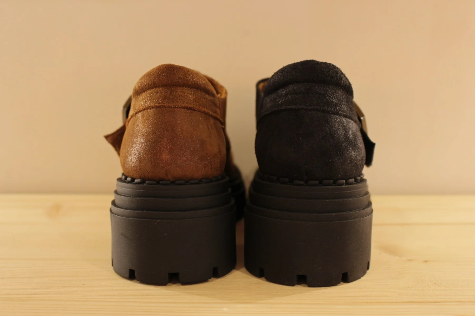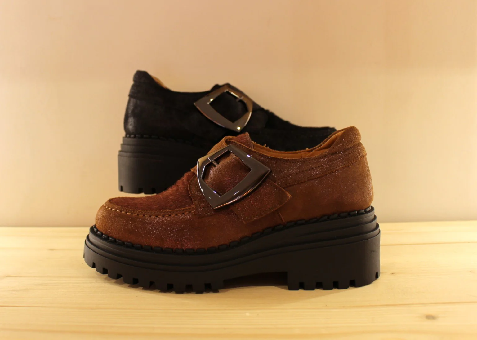 Chaussures CASTA Nyla. Fabrication Portugaise. Chaussures en cuir gras légèrement métallisé, de couleur marron ou de couleur noir. Serrage par bride coup de pied montée sur boucle. Poils sur la claque. Chaussures doublées cuir. Semelle intérieure amovible.Talon de 2.5 cm. Semelle extérieure en gomme crantée épaisse de 3 cm. J’adore son côté hivernal bien trempé sur une coupe derby !