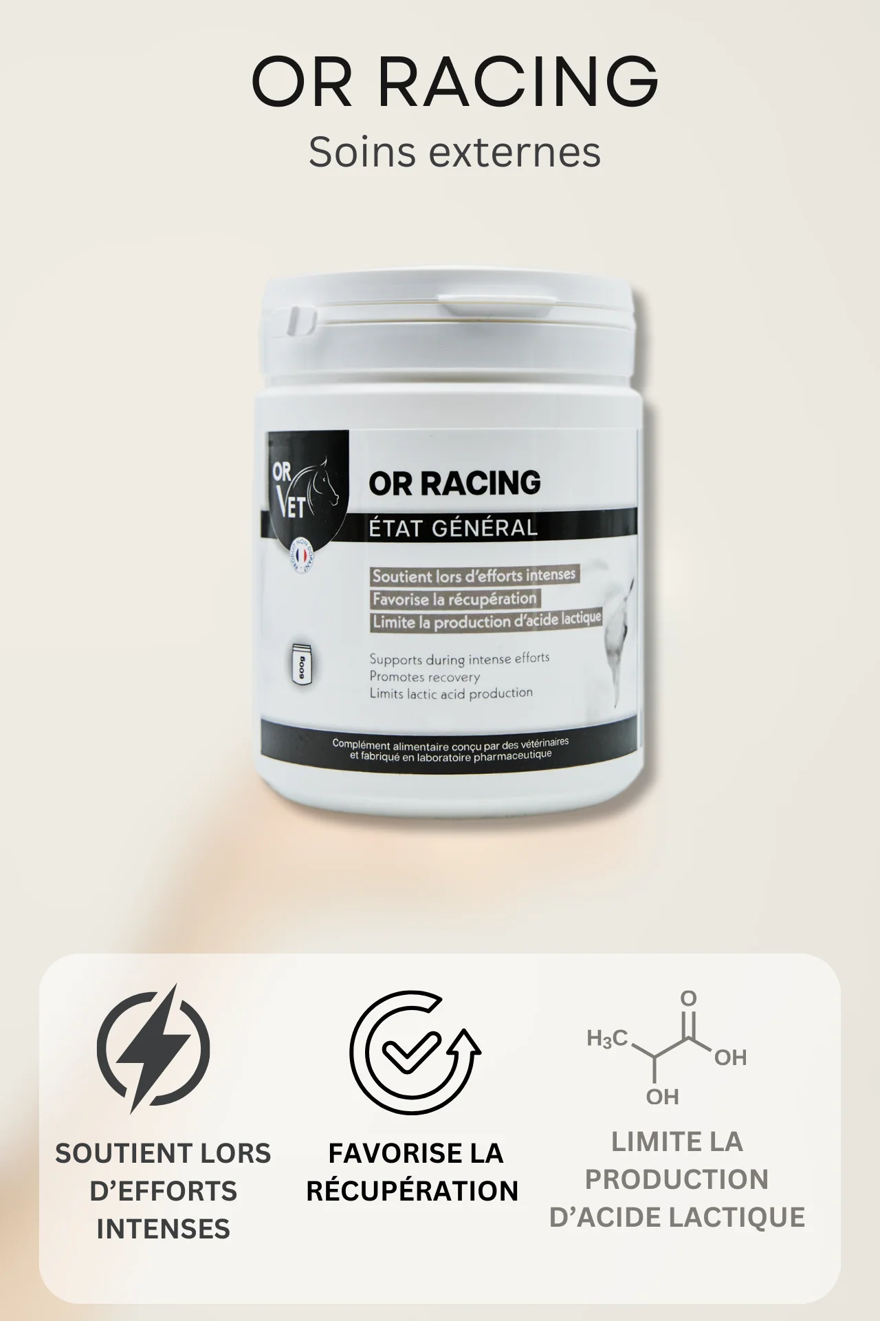 Grâce à sa formulation spécifique, OR RACING soutient les chevaux lors d’efforts intenses, favorise leur récupération après l’exercice et limite la production d’acide lactique, contribuant ainsi à une meilleure performance globale.