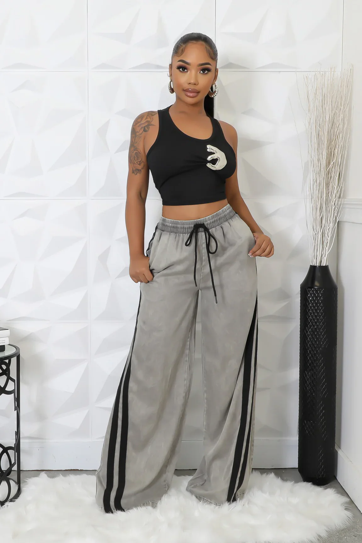 Pantalon non extensibleTaille hauteCeinture élastiquePochesJambe largeLa couture intérieure mesure 33 pouces100 % rayonneLavage à la main à froidLe mannequin porte une taille SSTATISTIQUES DU MANNEQUINHauteur : 5,3 poPoitrine : 33 po / Taille : 28 po / Hanches : 42 po