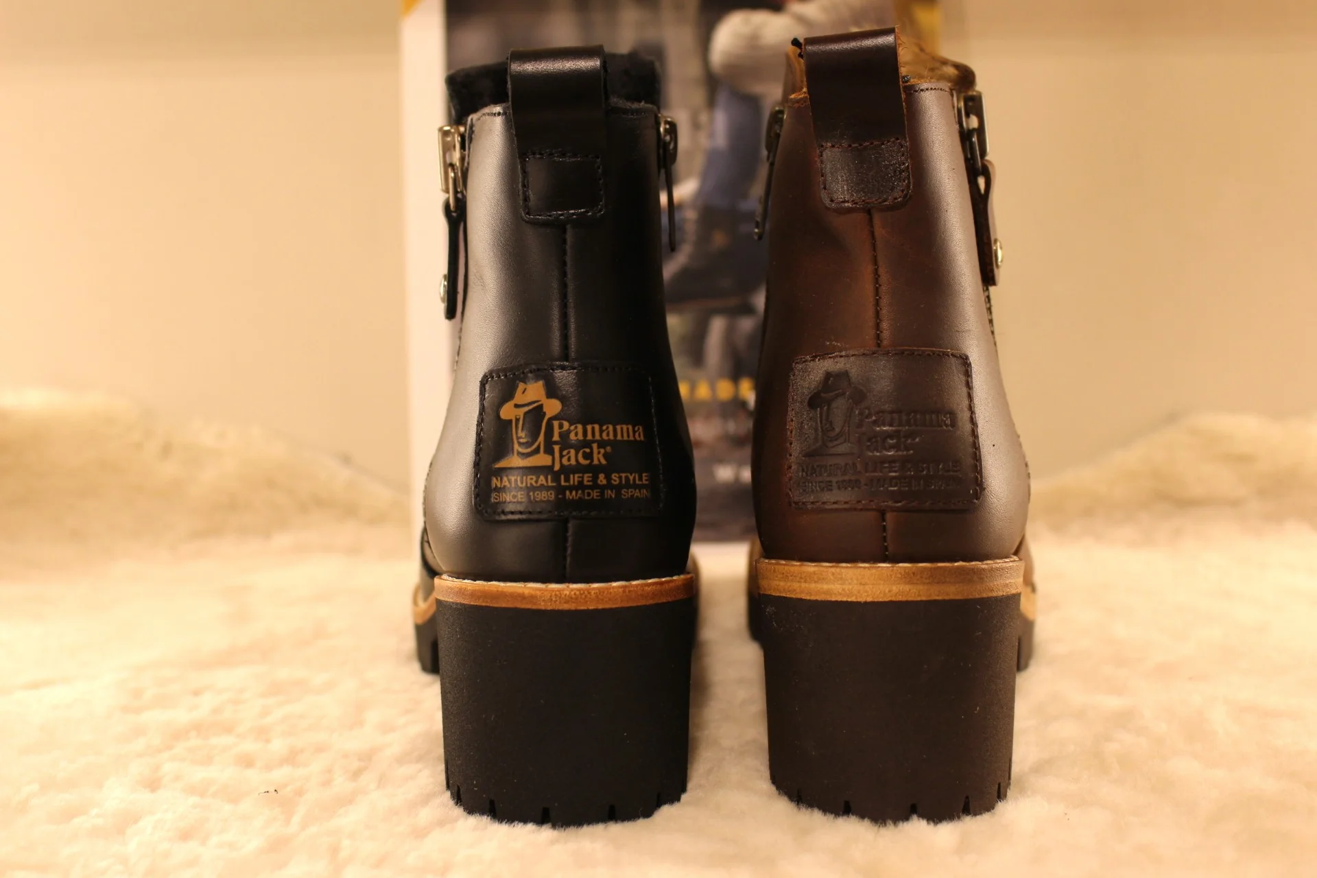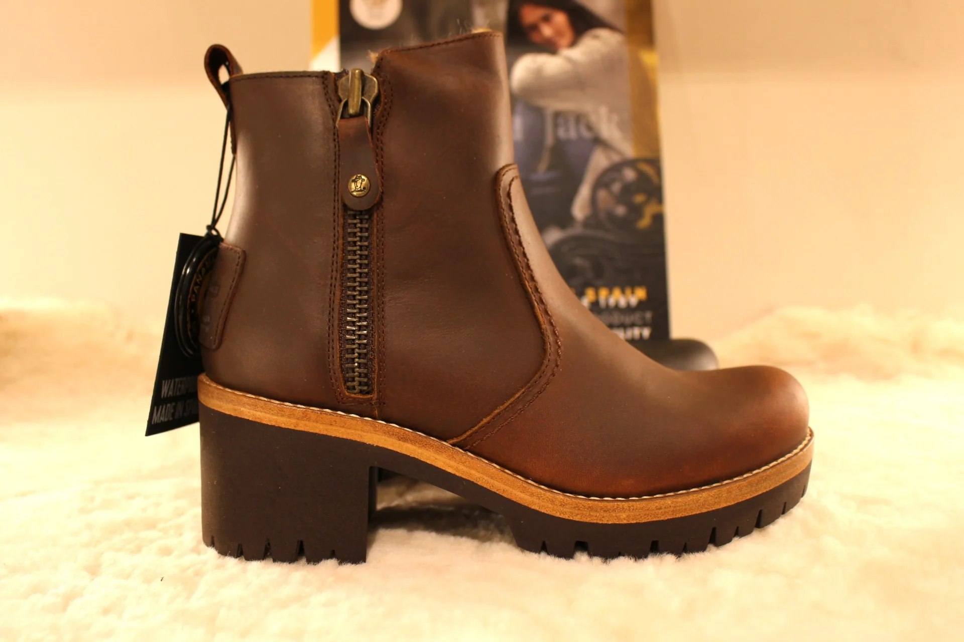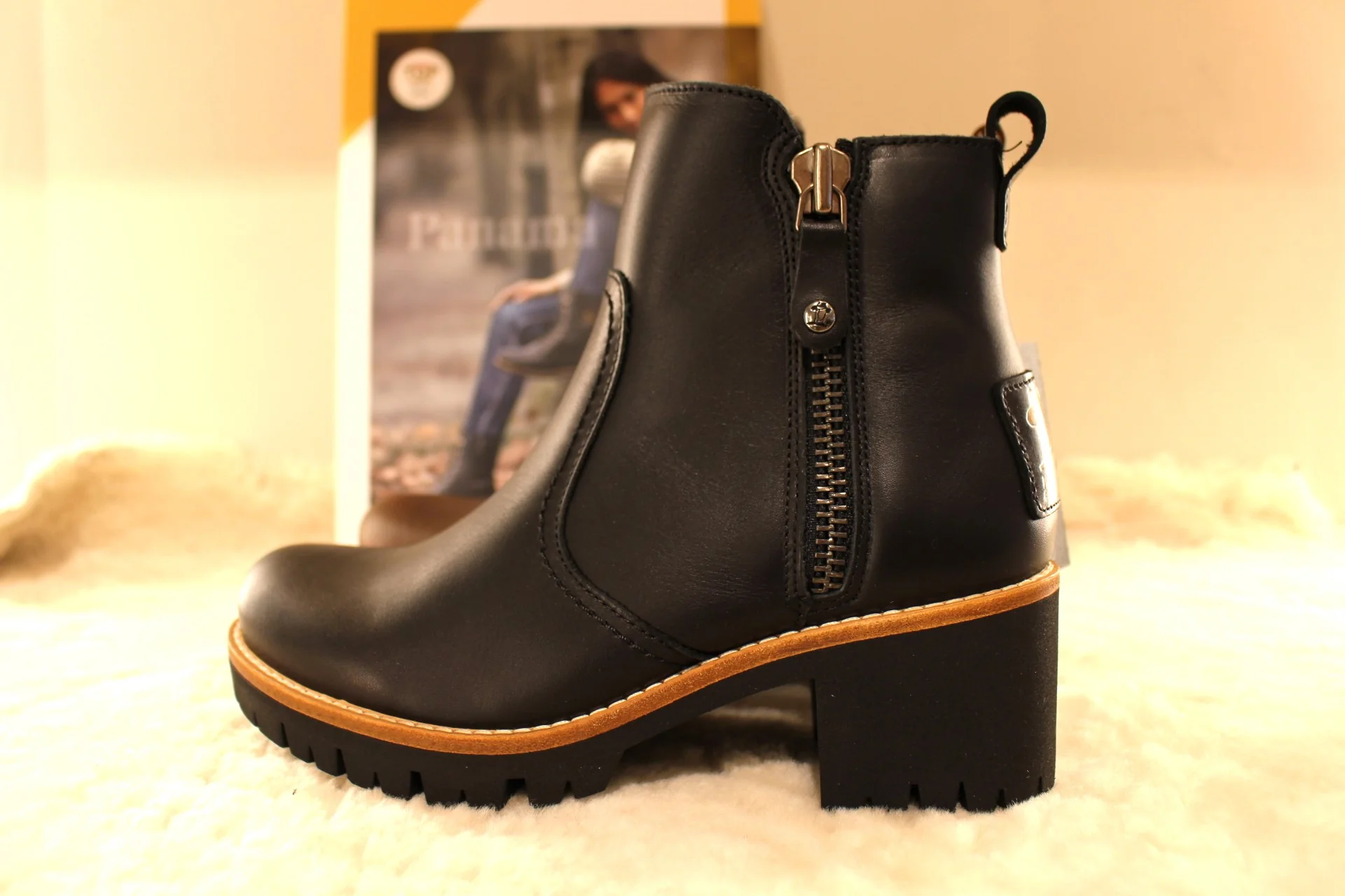 Bottines PANAMA JACK – Pauline. Fabrication Espagnole. Bottines en cuir gras de couleur marron ou de couleur noire. Chaussures doublées fourrure acrylique. Deux zips latéraux. Plaque estampillée PANAMA JACK à l’arrière. Cuir traité waterproof. Hauteur de la tige de 14 cm. Talon de 3 cm. Semelle extérieure en gomme épaisse de 2.5 cm, crantée. Trépointe naturelle. Une hauteur de tige facile et talon très féminin. Le pied dans la neige même en altitude.