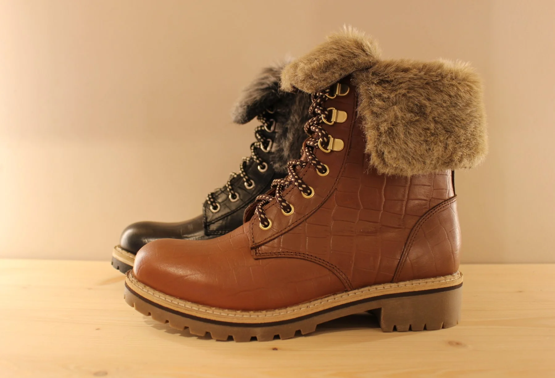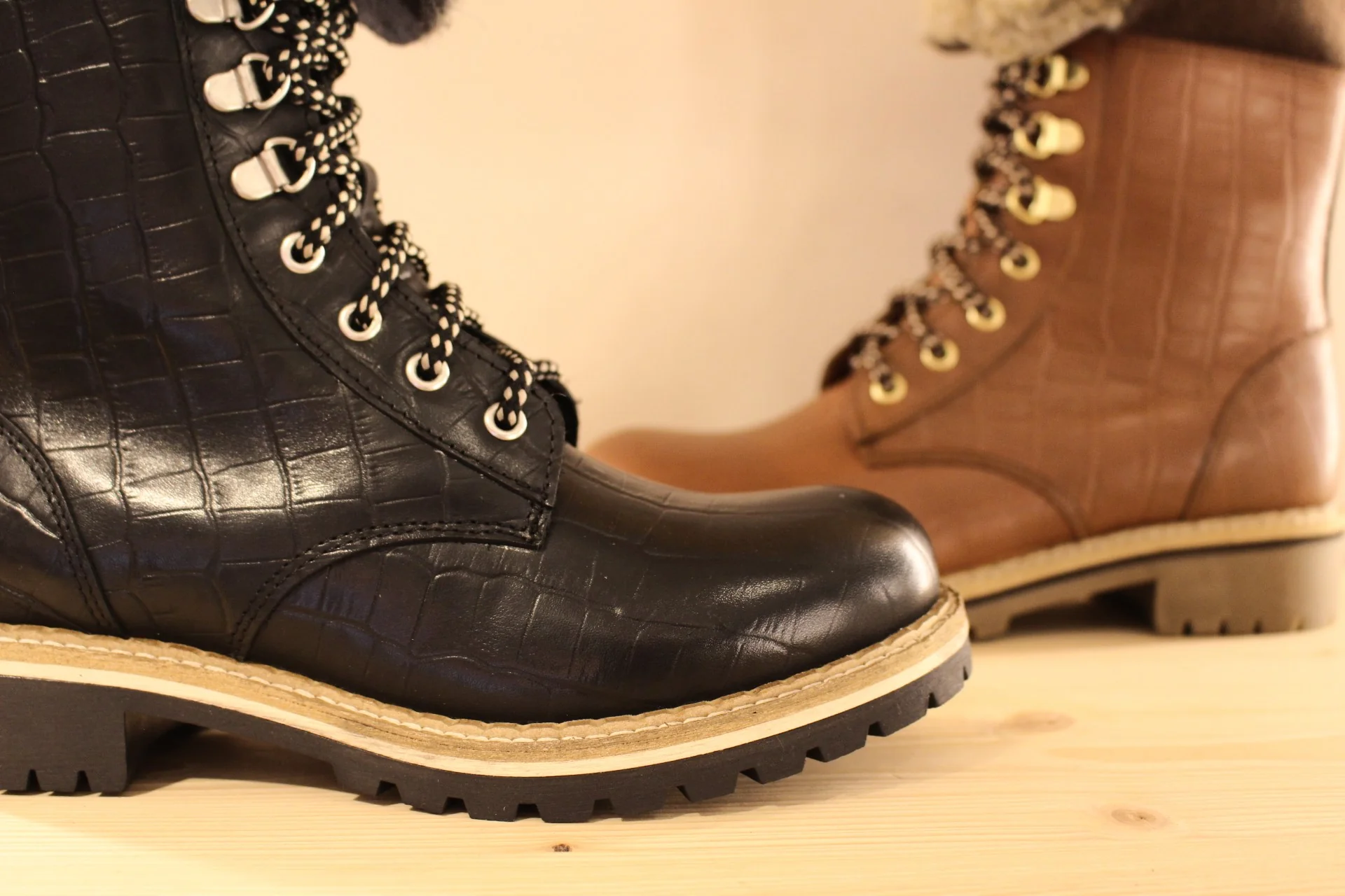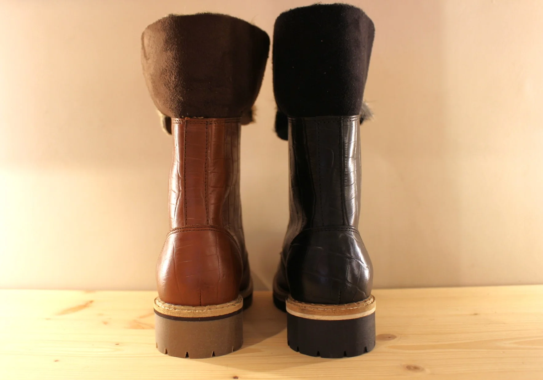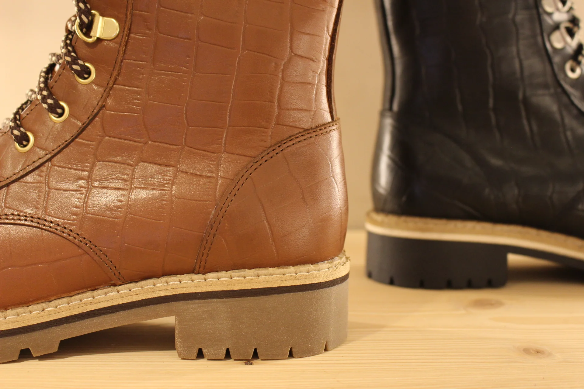 Bottines HOOPER Praz. Fabrication Portugaise. Bottines en cuir imprimé croco, de couleur noir, ou de couleur camel. Bottines doublées laine. Serrage lacets en coton sport. Hauteur de la tige de 22 cm, ou de 15 cm si retourné, avec haut de tige fourrure. Talon de 1.5 cm. Semelle extérieure en gomme épaisse de 2 cm, crantée. Couture aspect trépointe. Idéale en hiver sous la neige et avoir chaud en remontant la tige.